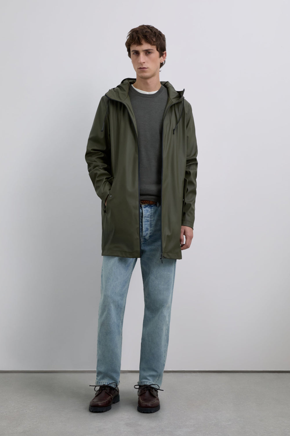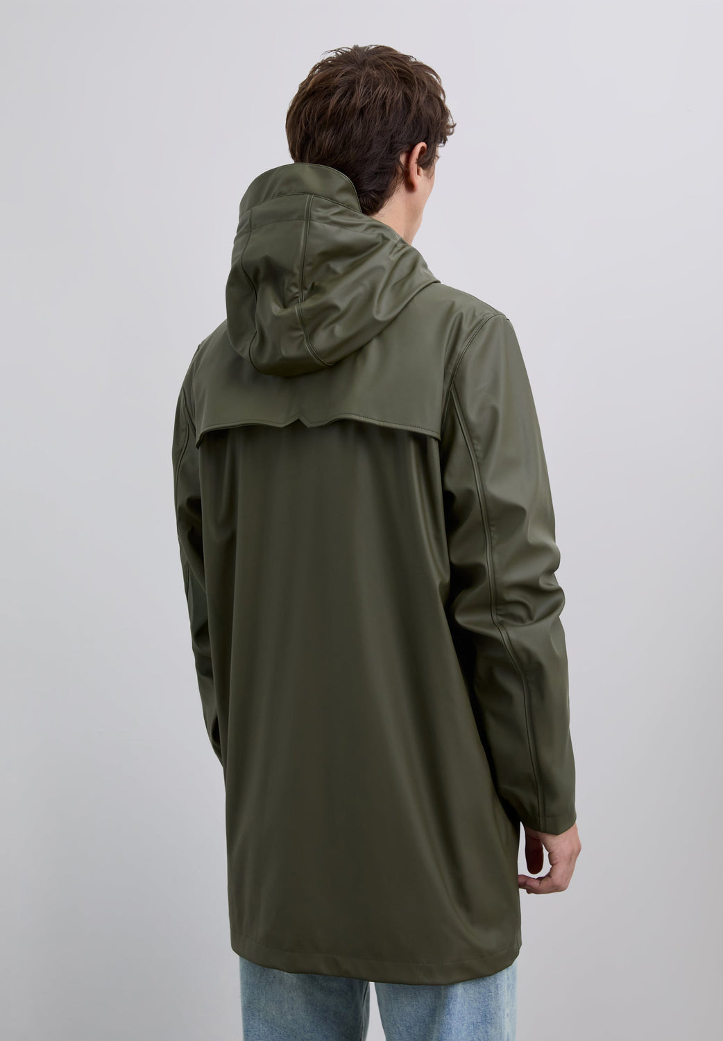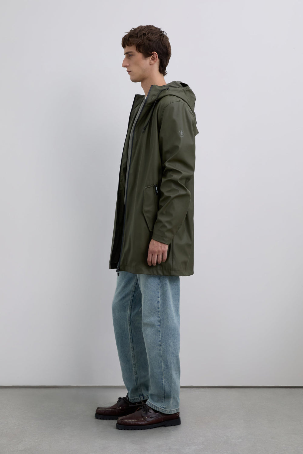 Chaqueta impermeable. Cuello con capucha ajustable con cordón. Cierre con cremallera de doble carro termosellada. Manga larga. Bolsillos laterales con tapeta y snap. Detalle logo engomado a contraste en frontal inferior y calavera a tono en cremallera.