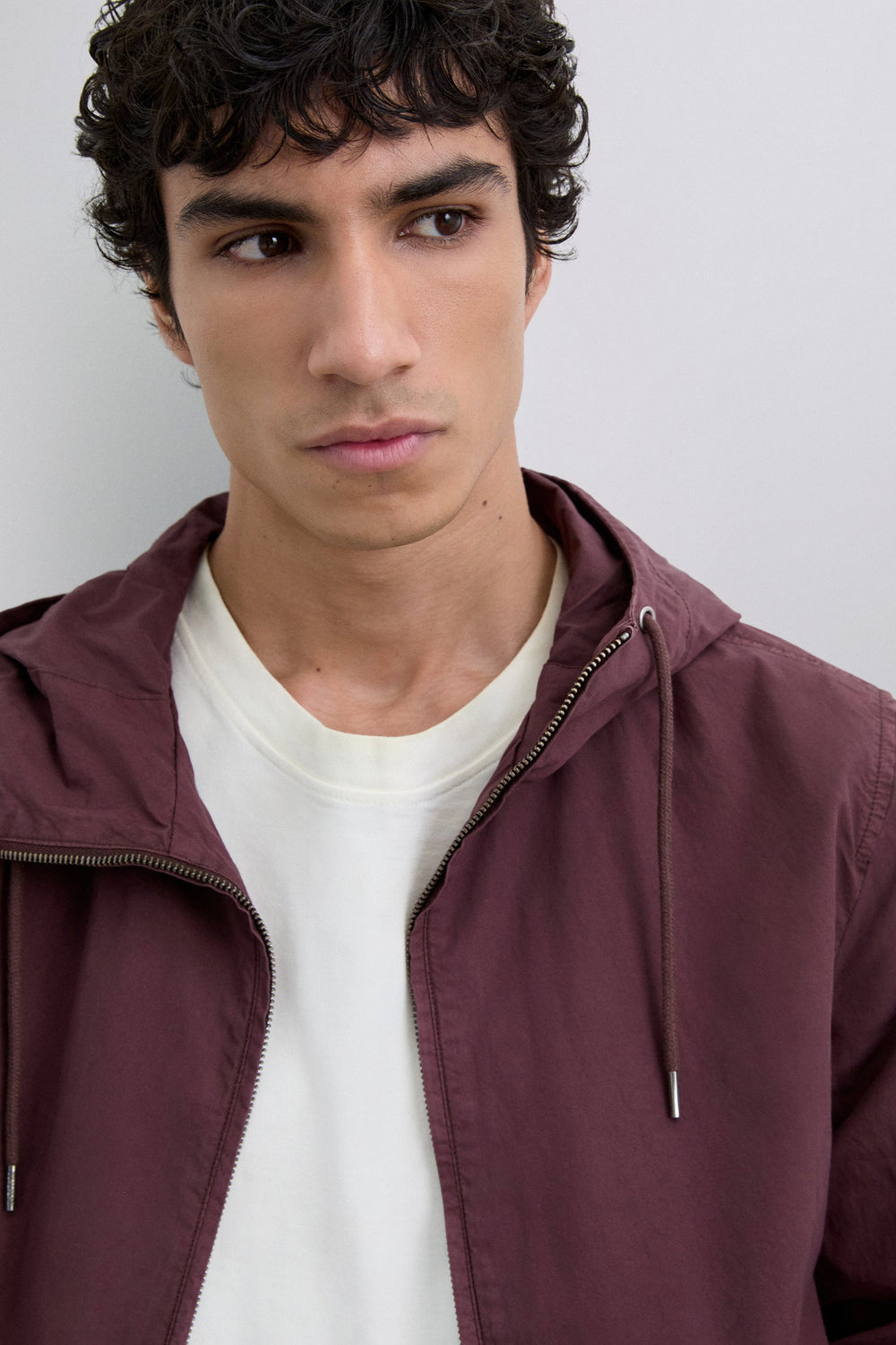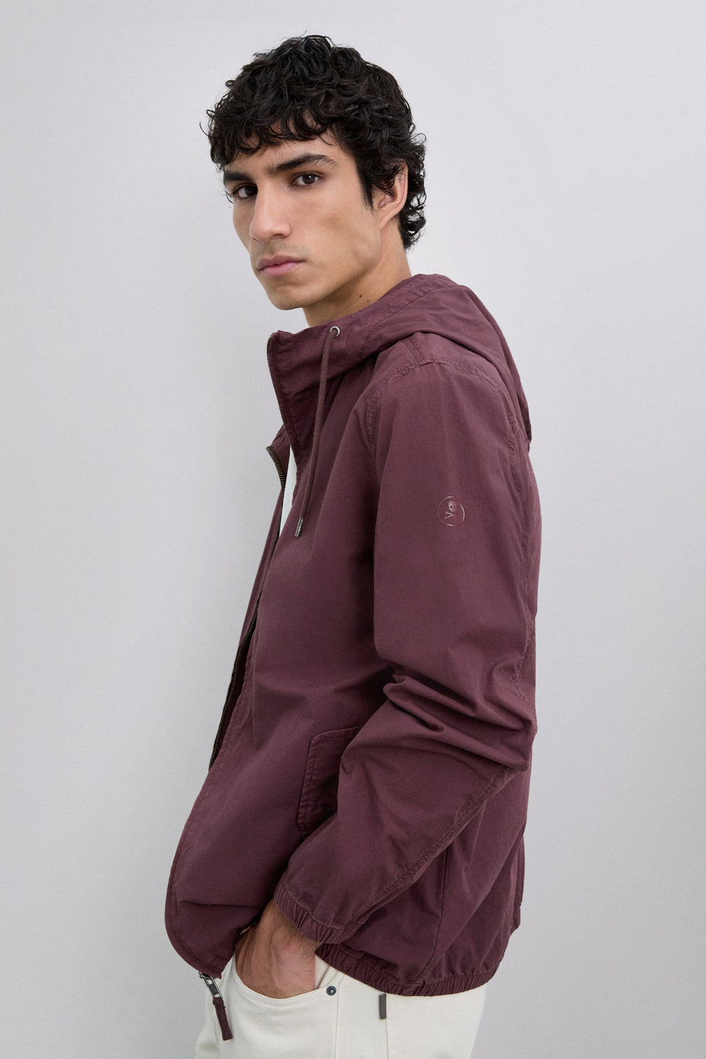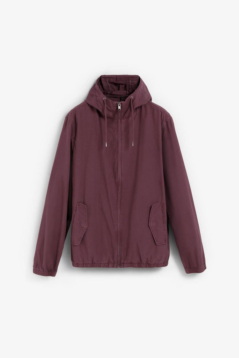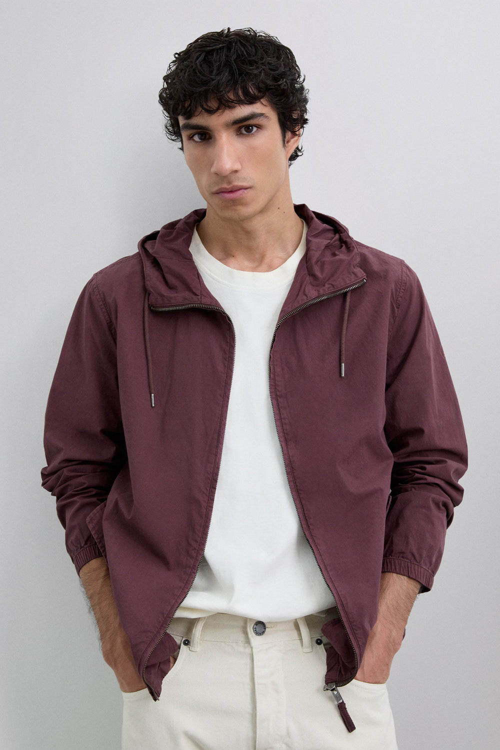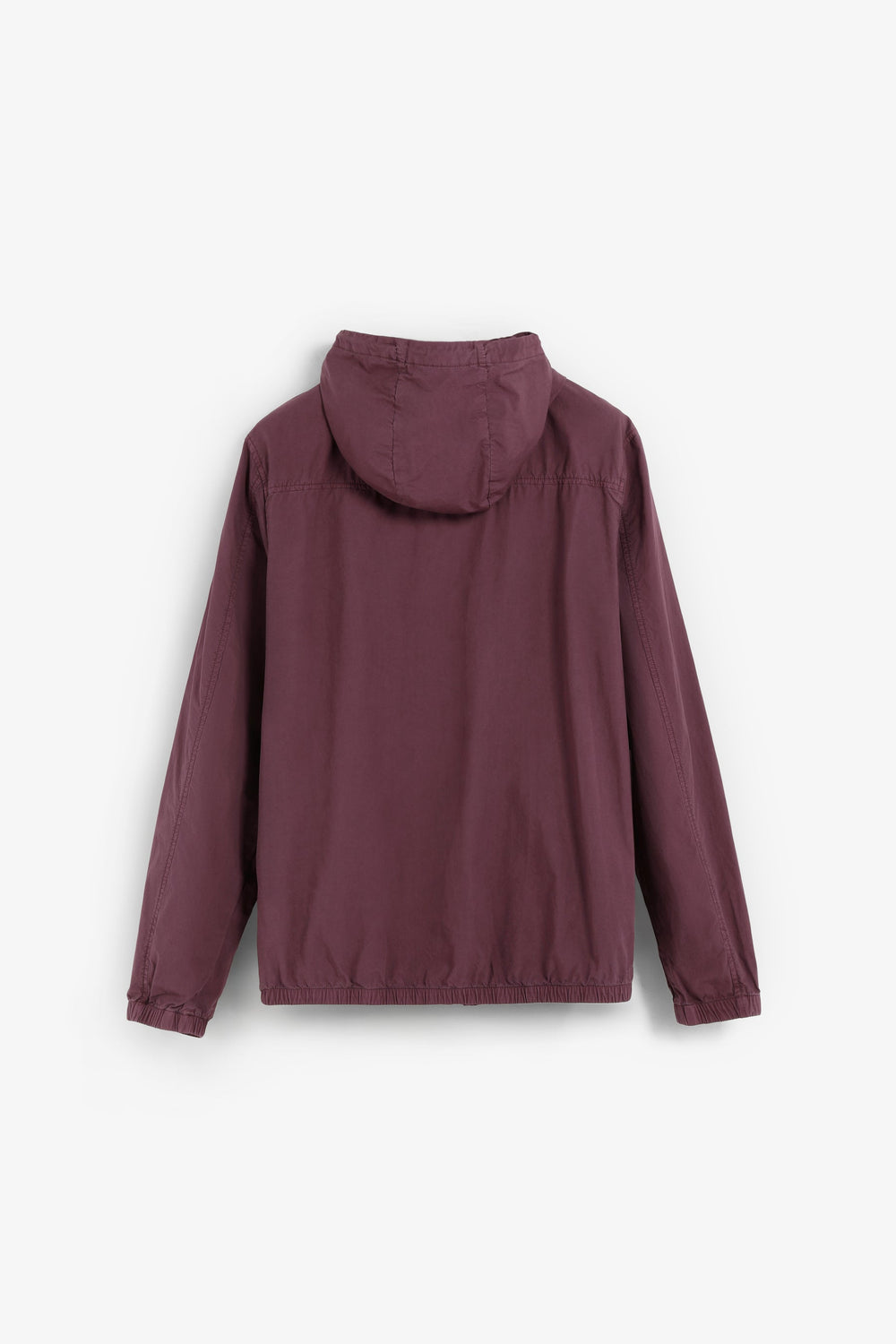 Chaqueta ligera confeccionada en 100% algodón BCI. Regular fit. Cuello con capucha ajustable con cordón y cierre con cremallera. Manga larga terminada en elástico. Bolsillos frontales con tapeta. Forro interior.