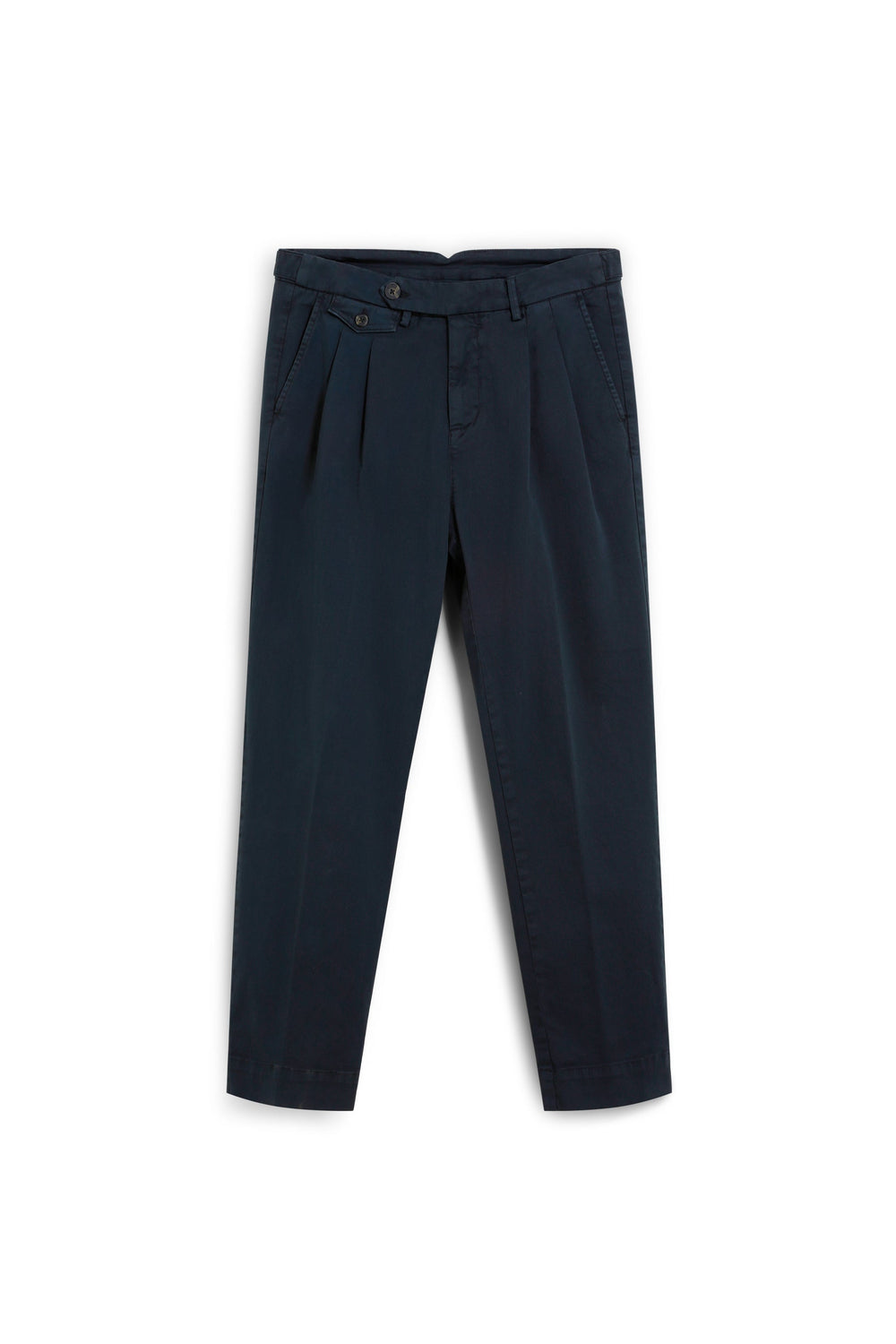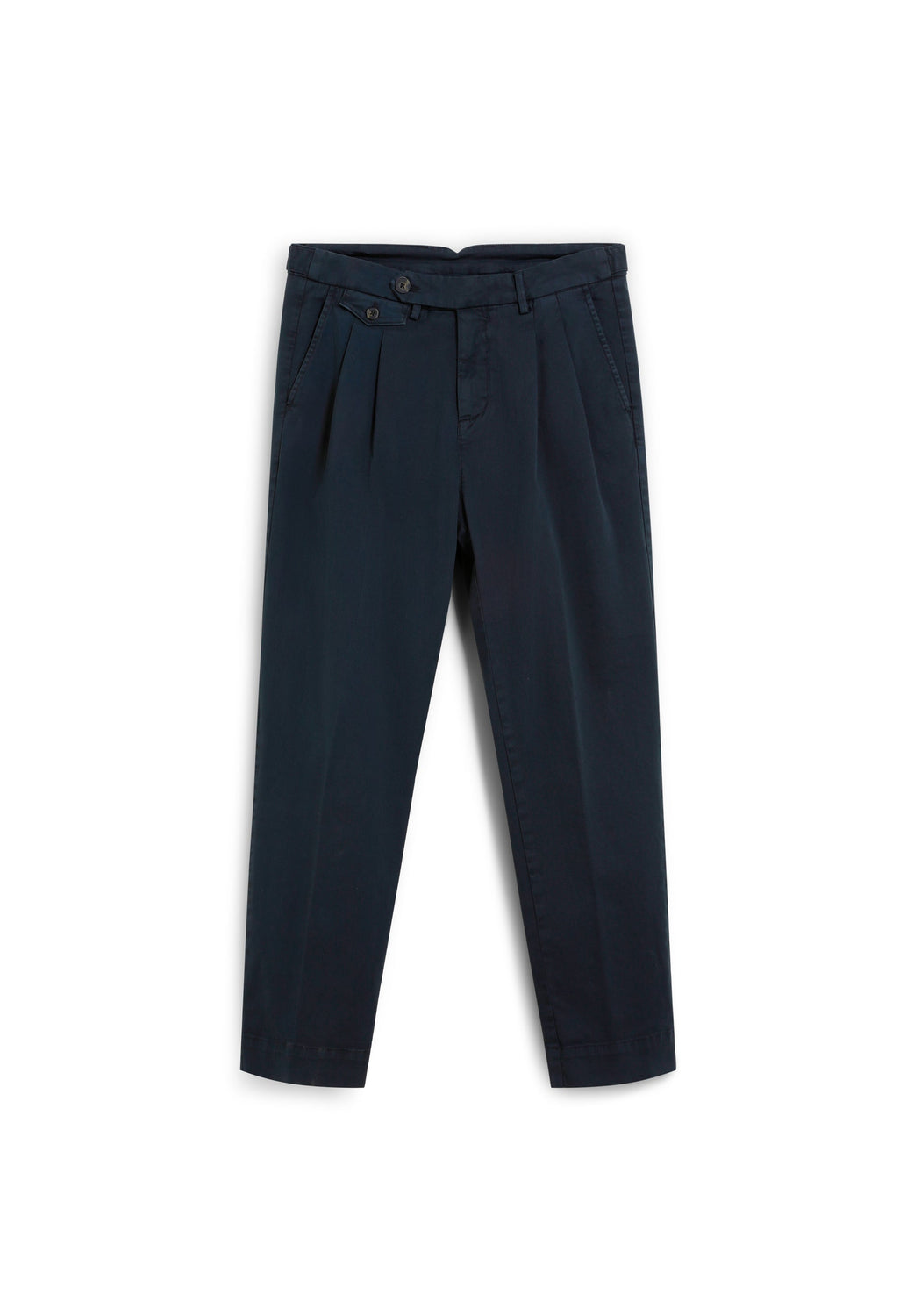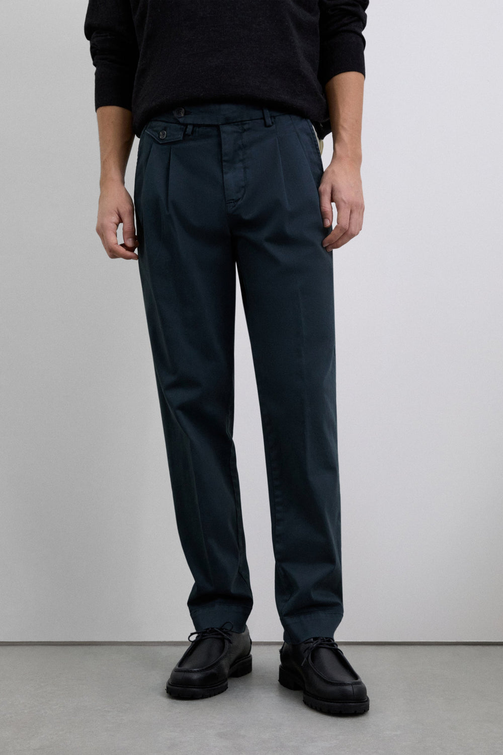 Pantalón de pinza confeccionado en algodón. Regular fit. Cintura con detalle de pliegues en delantero. Bolsillos laterales y detalle de bolsillos traseros en vivo. Cierre frontal con cremallera y botón.