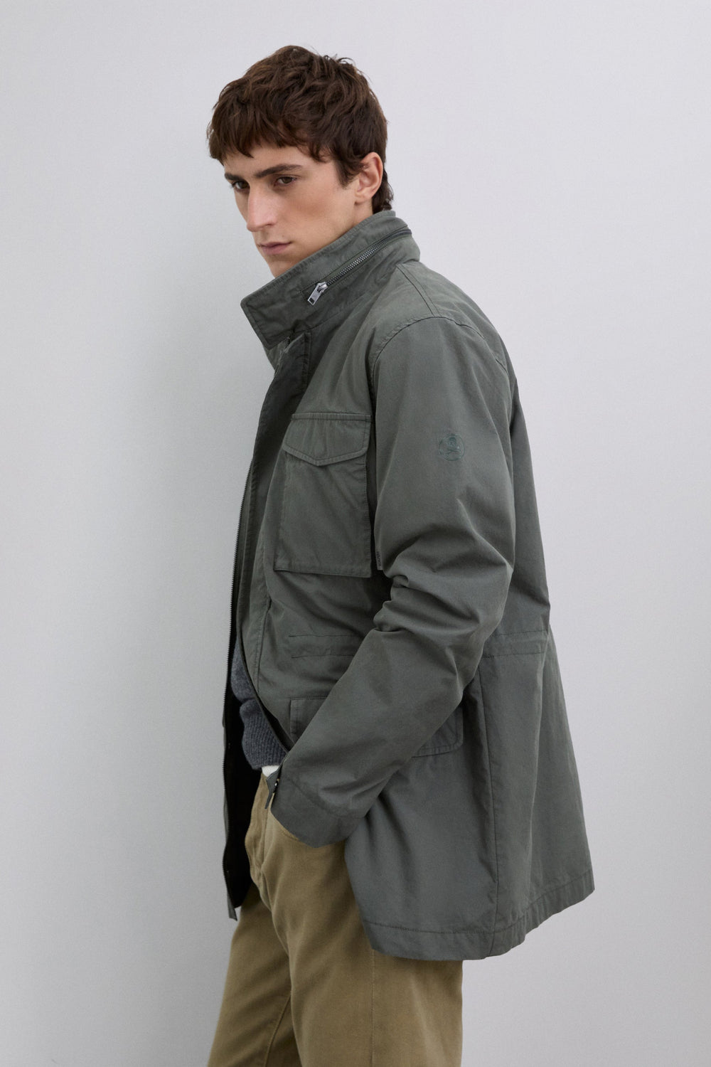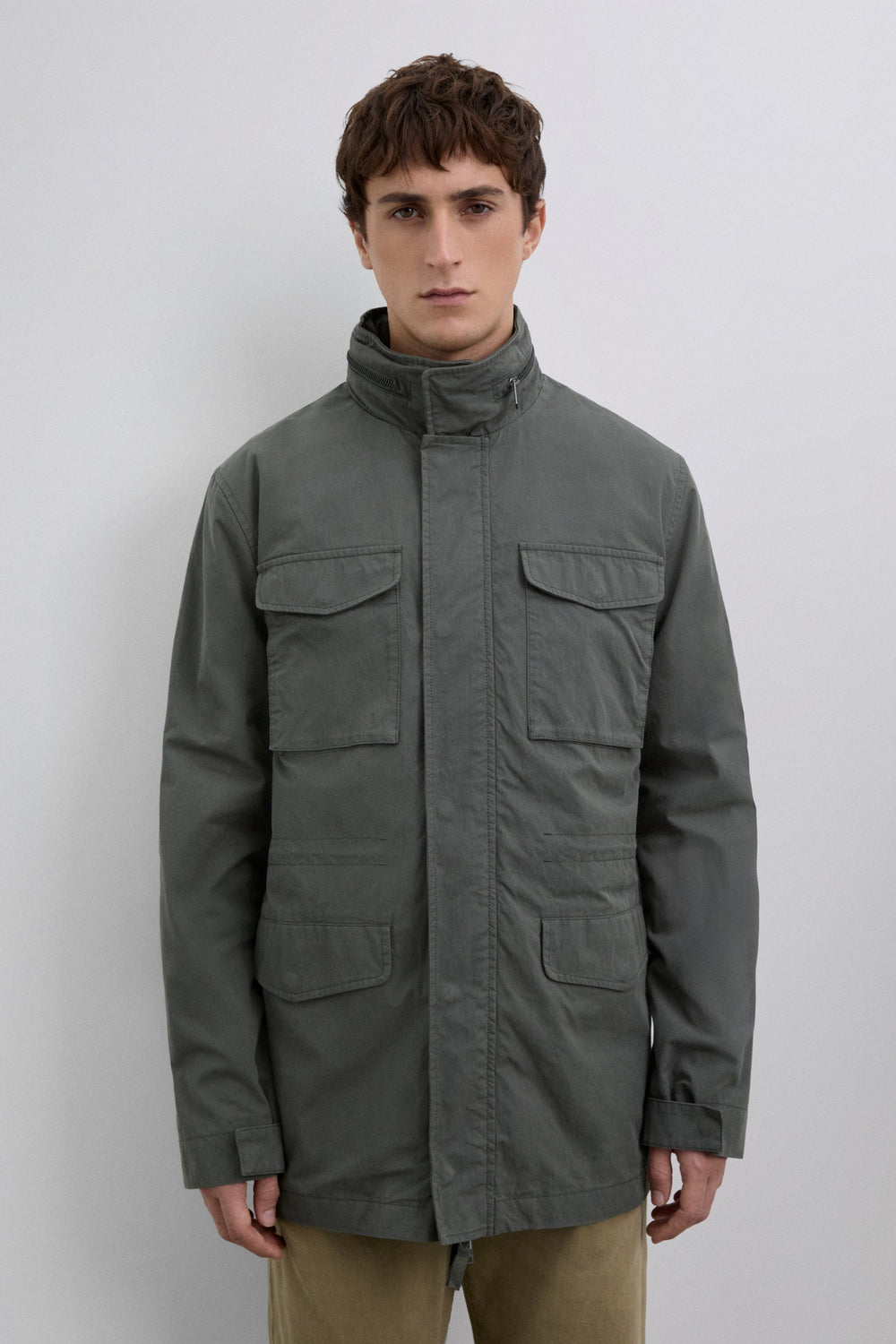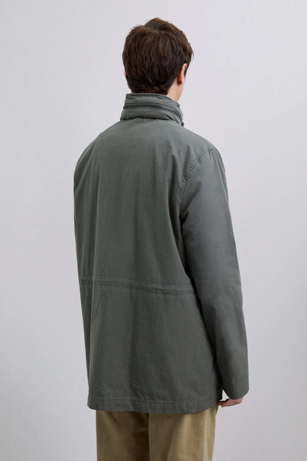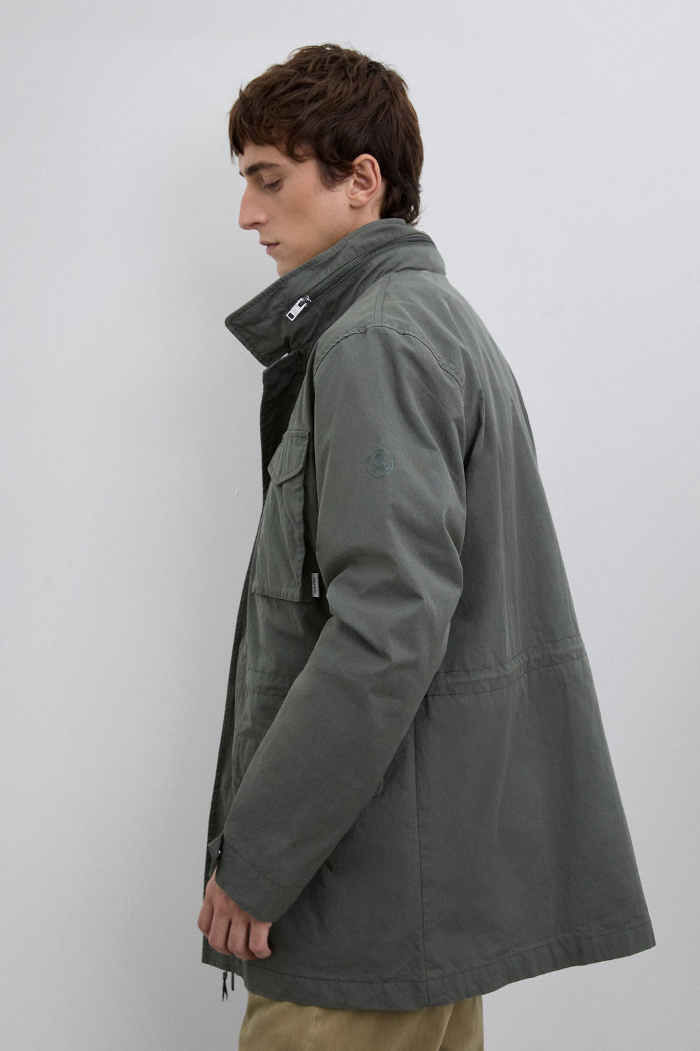 Parka estilo militar confeccionada en algodón BCI. Cuatro bolsillos frontales. Detalle de cierre en el cuello. Ajustador interior con cordón. Cierre delantero con cremallera. Capucha oculta en contraste dentro del cuello. Detalle de etiqueta con logo.