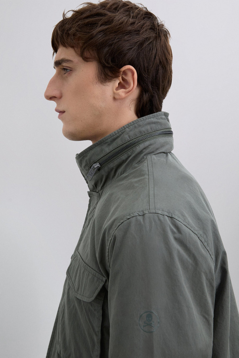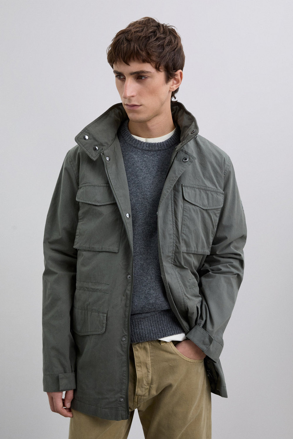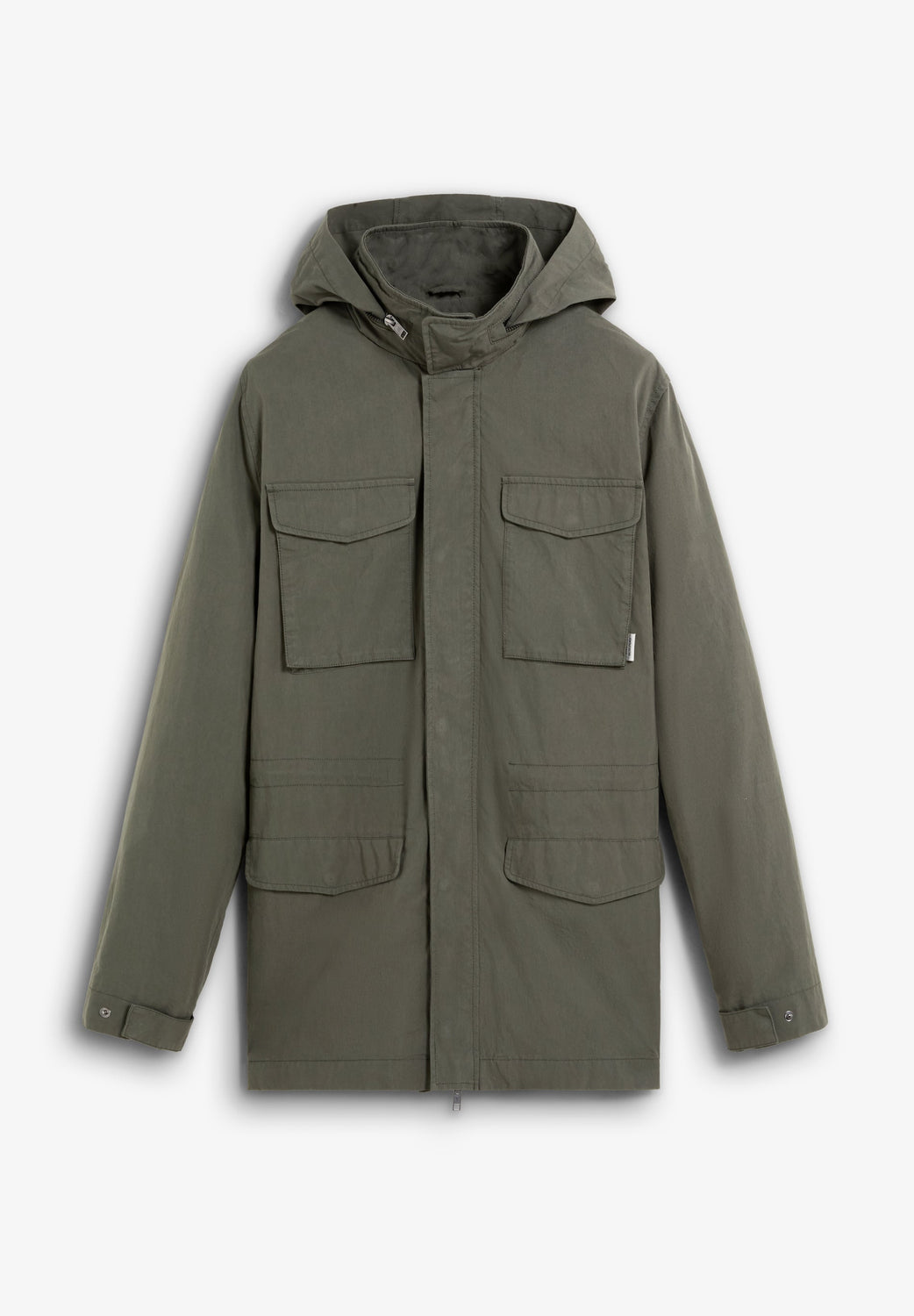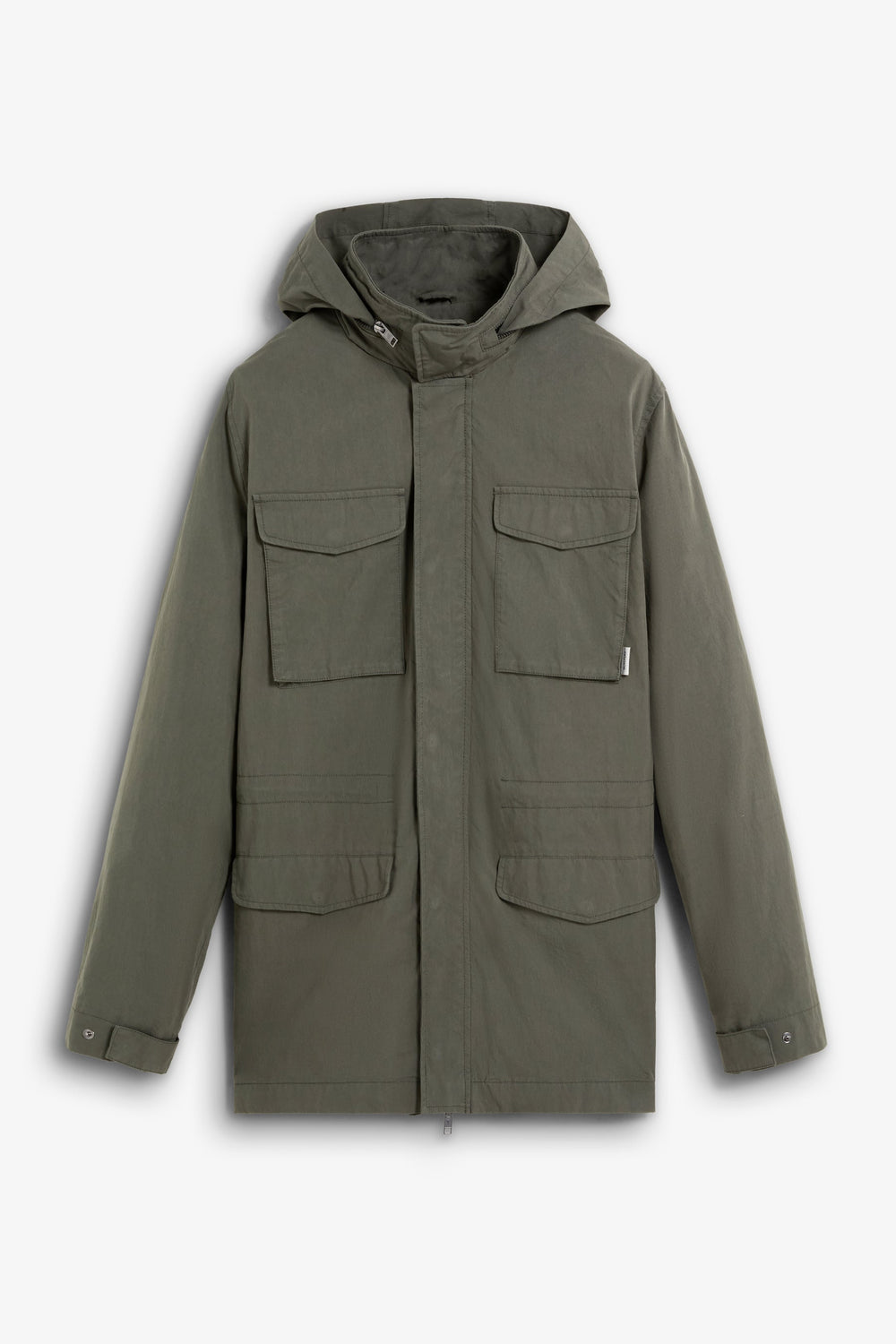 Parka estilo militar confeccionada en algodón BCI. Cuatro bolsillos frontales. Detalle de cierre en el cuello. Ajustador interior con cordón. Cierre delantero con cremallera. Capucha oculta en contraste dentro del cuello. Detalle de etiqueta con logo.