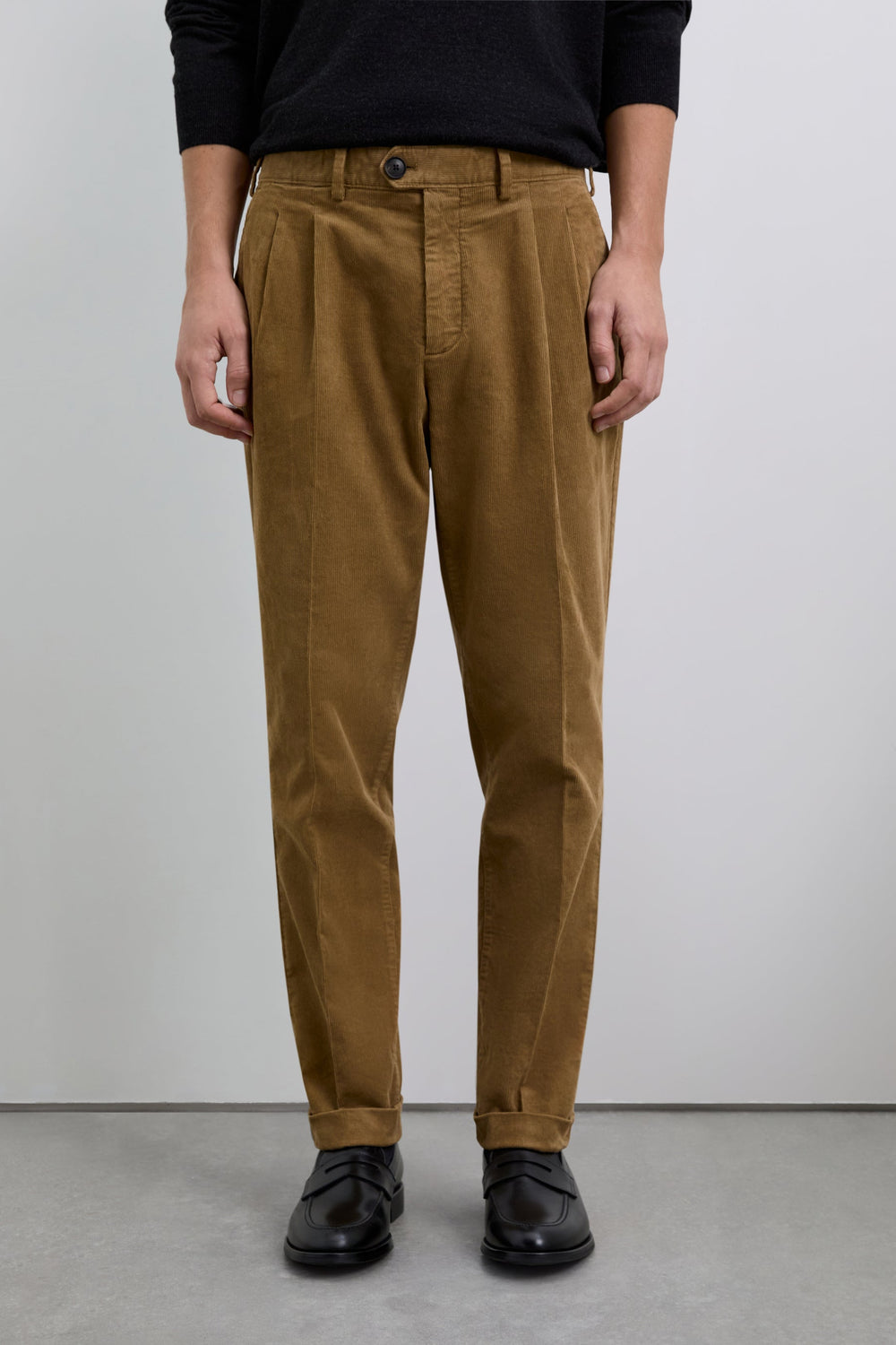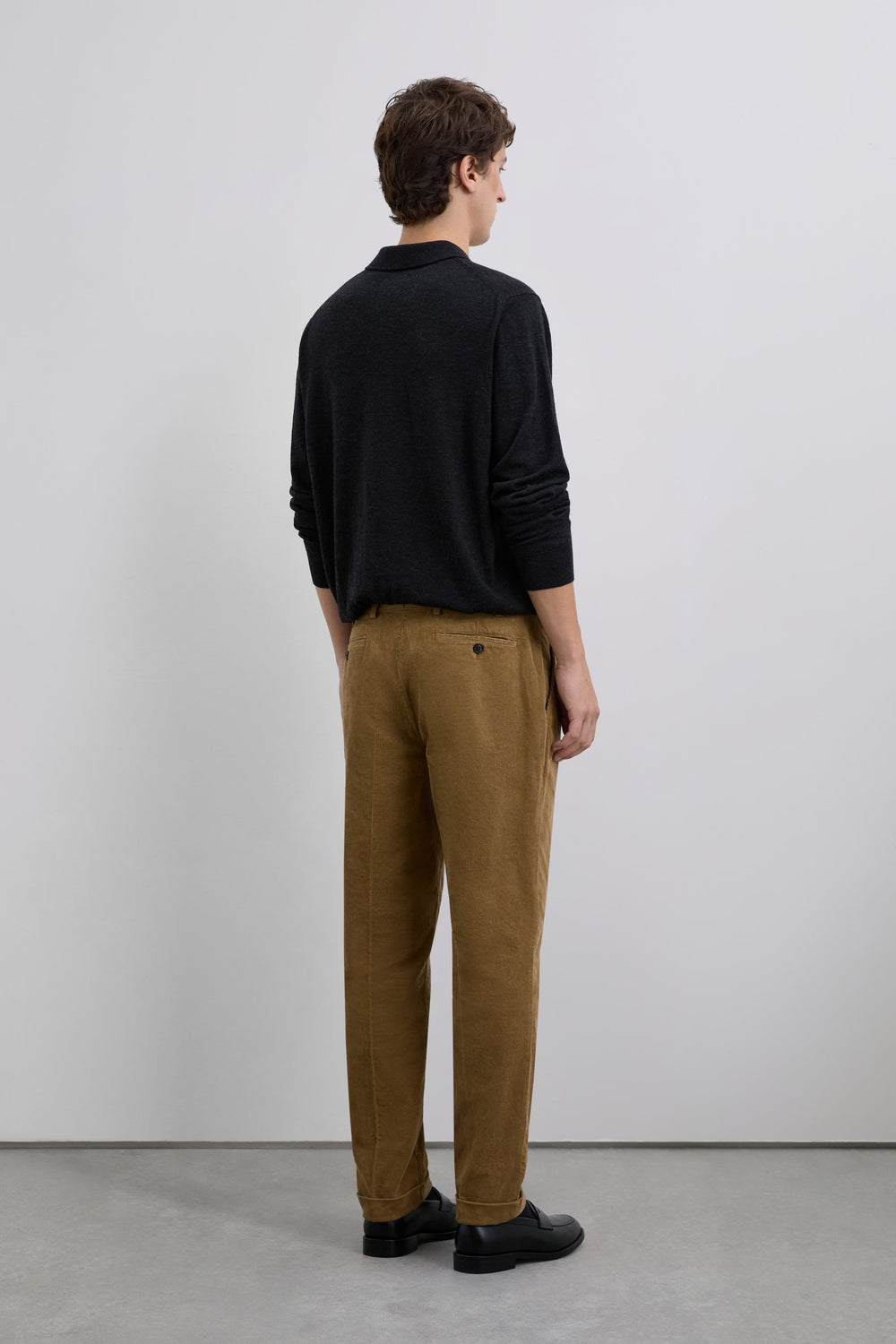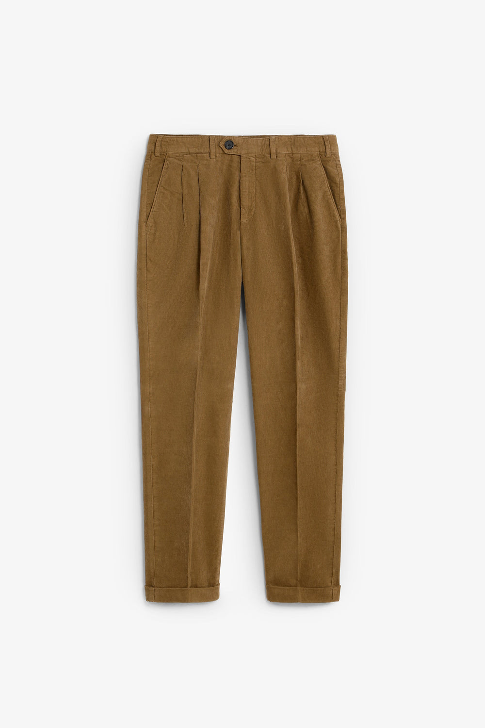 Pantalón chino de pana confeccionado en algodón. Corte loose fit con pinzas. Cierre con cremallera oculta y botón prolongado en cintura. Bolsillos laterales y traseros.