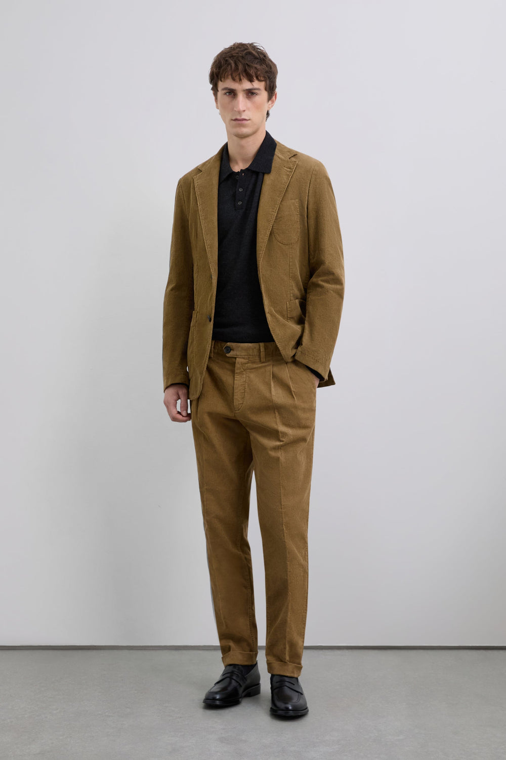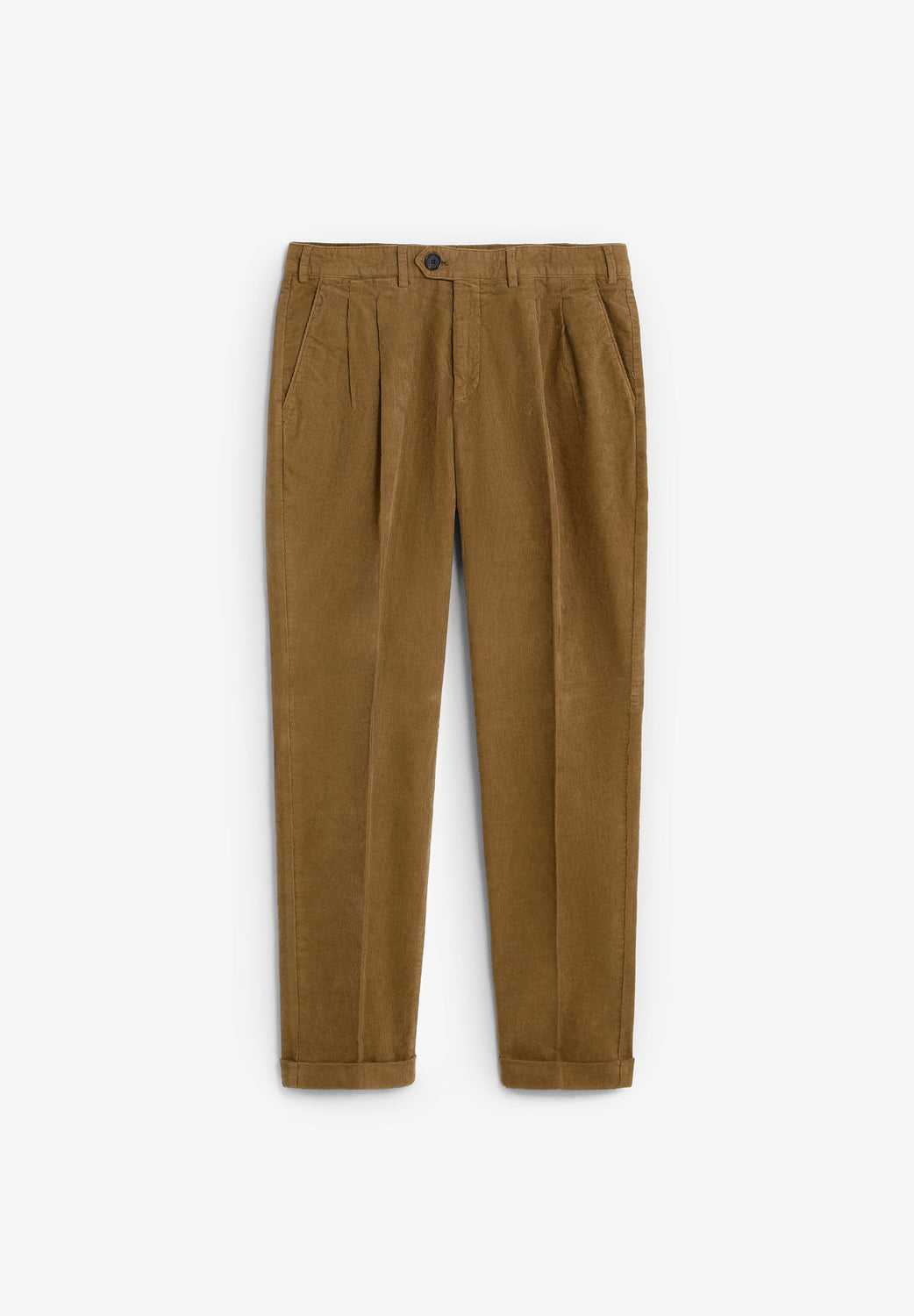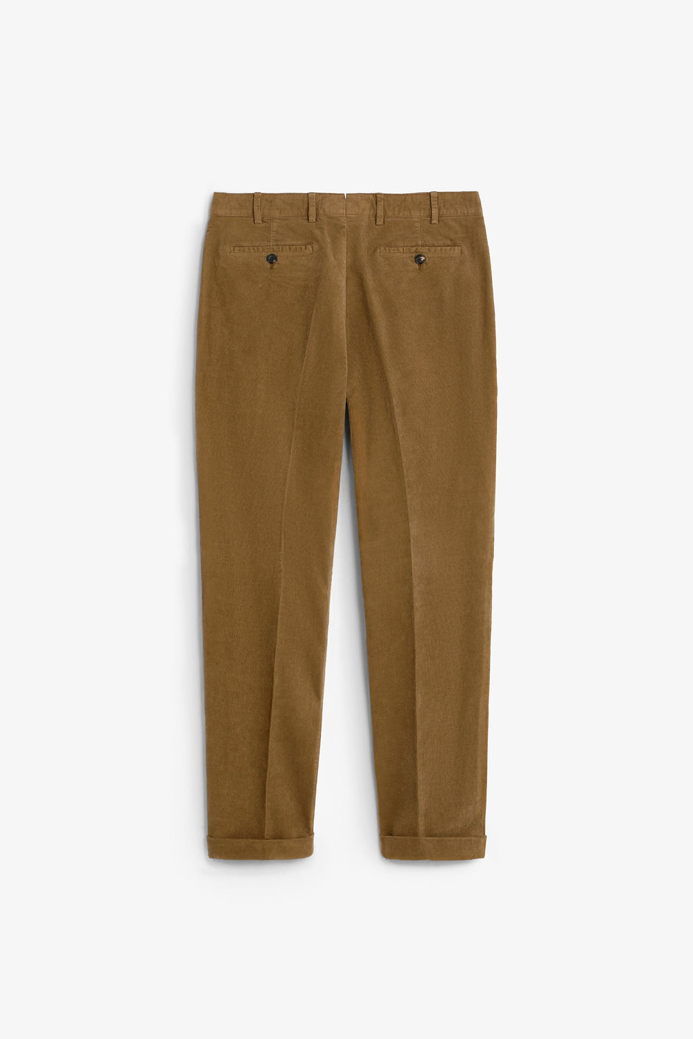 Pantalón chino de pana confeccionado en algodón. Corte loose fit con pinzas. Cierre con cremallera oculta y botón prolongado en cintura. Bolsillos laterales y traseros.