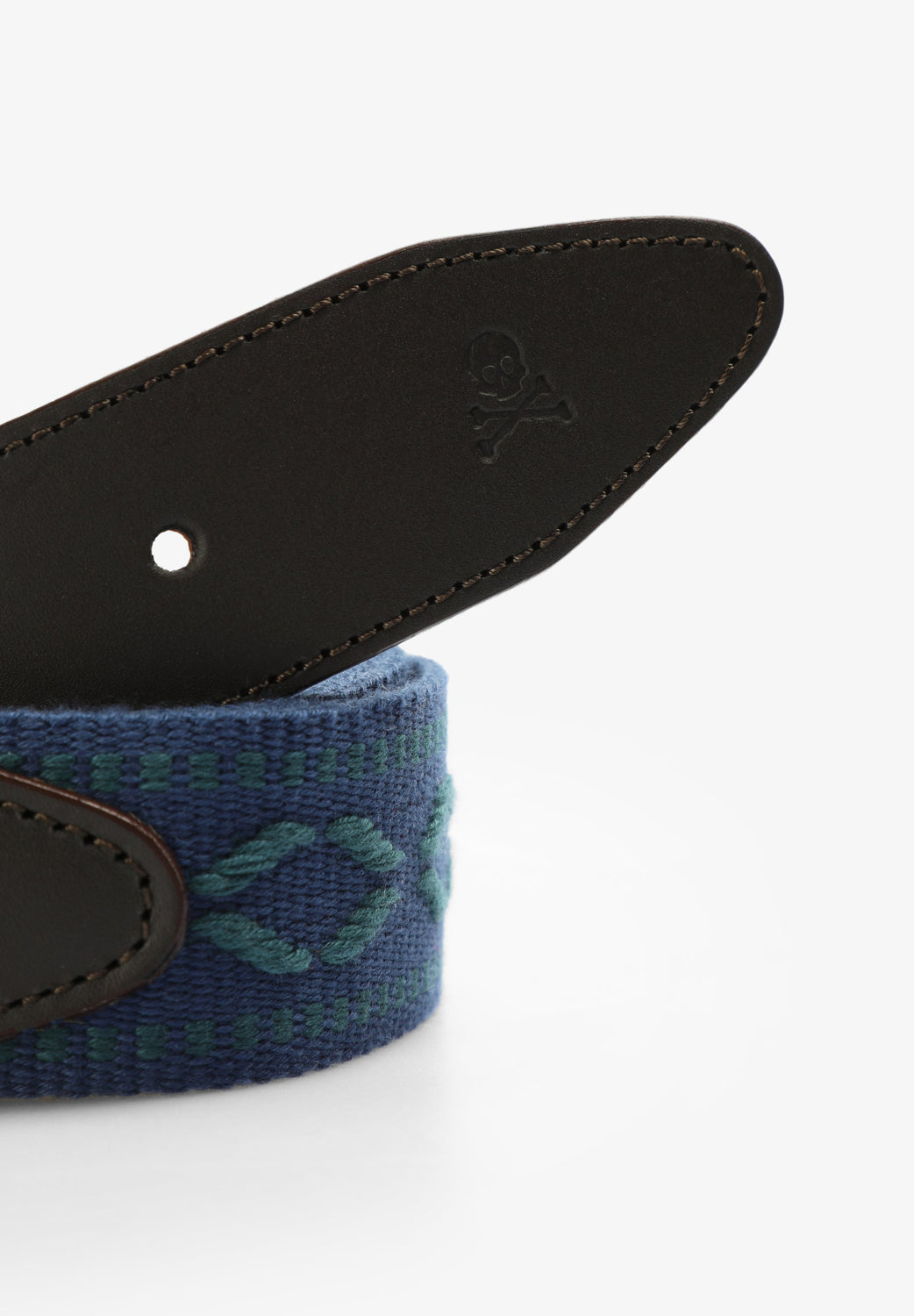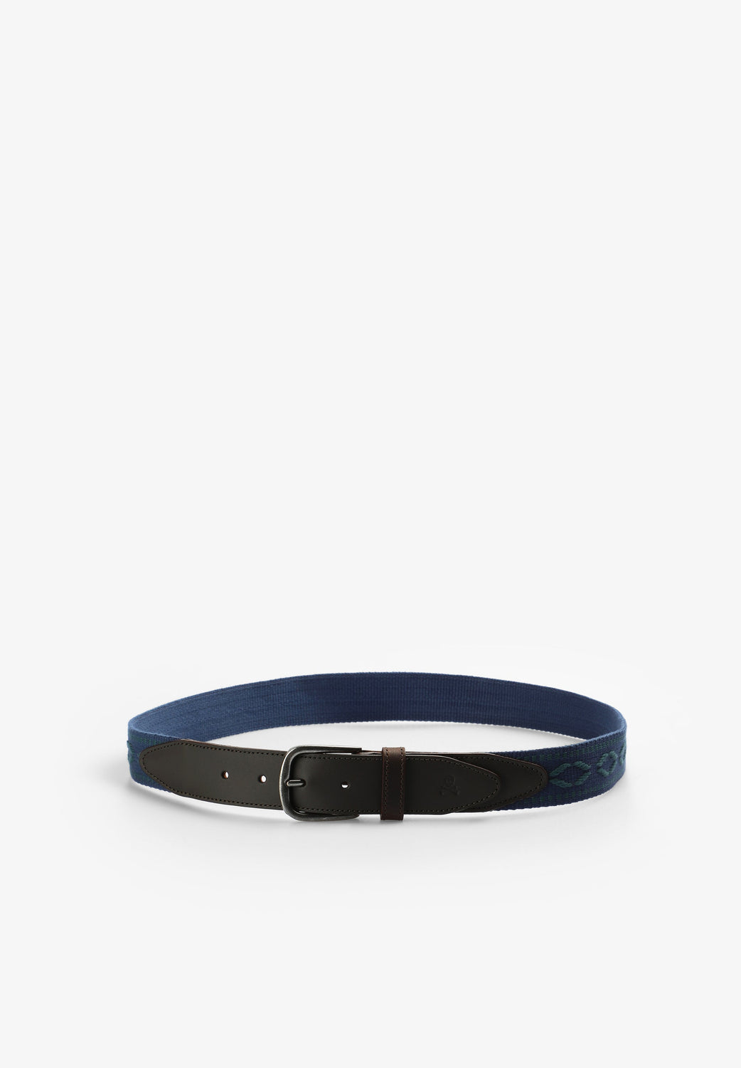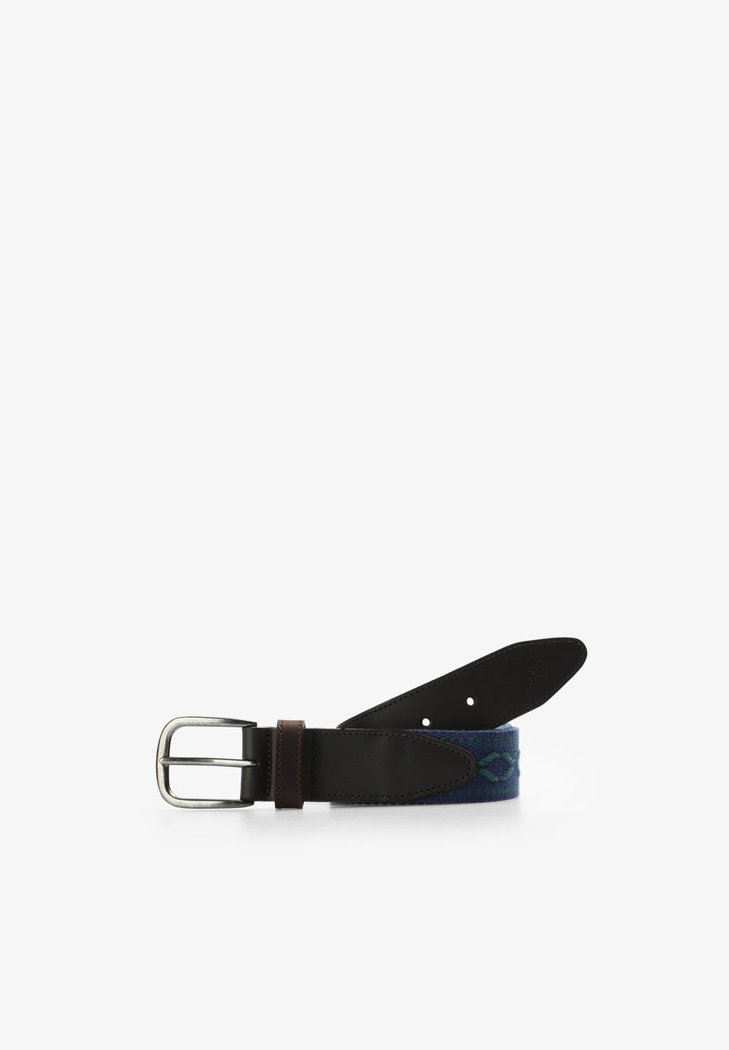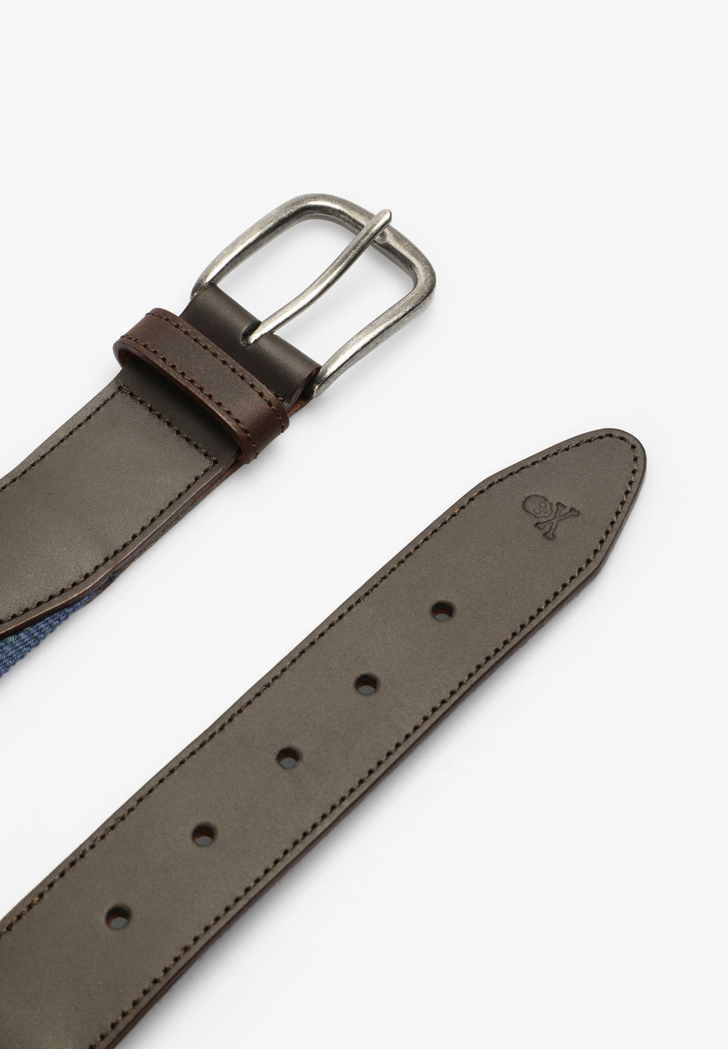 Cinturón con estampado étnico y detalles de piel con cierre de hebilla metálica.