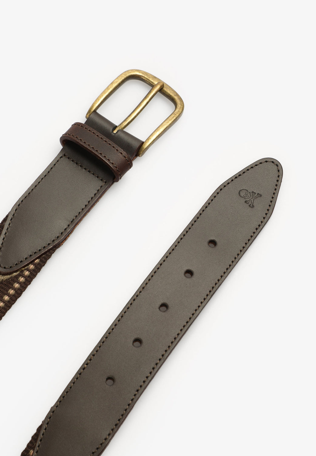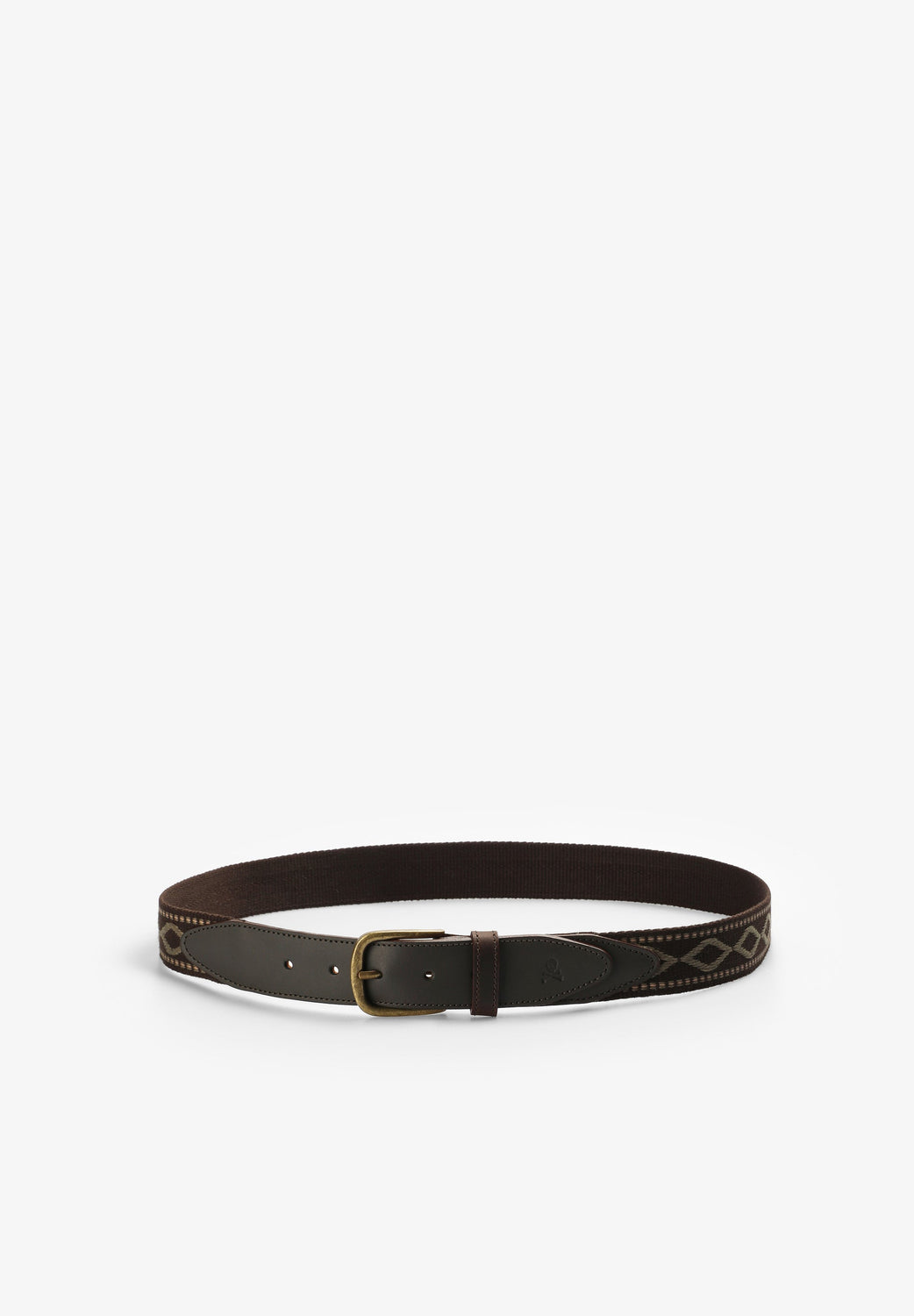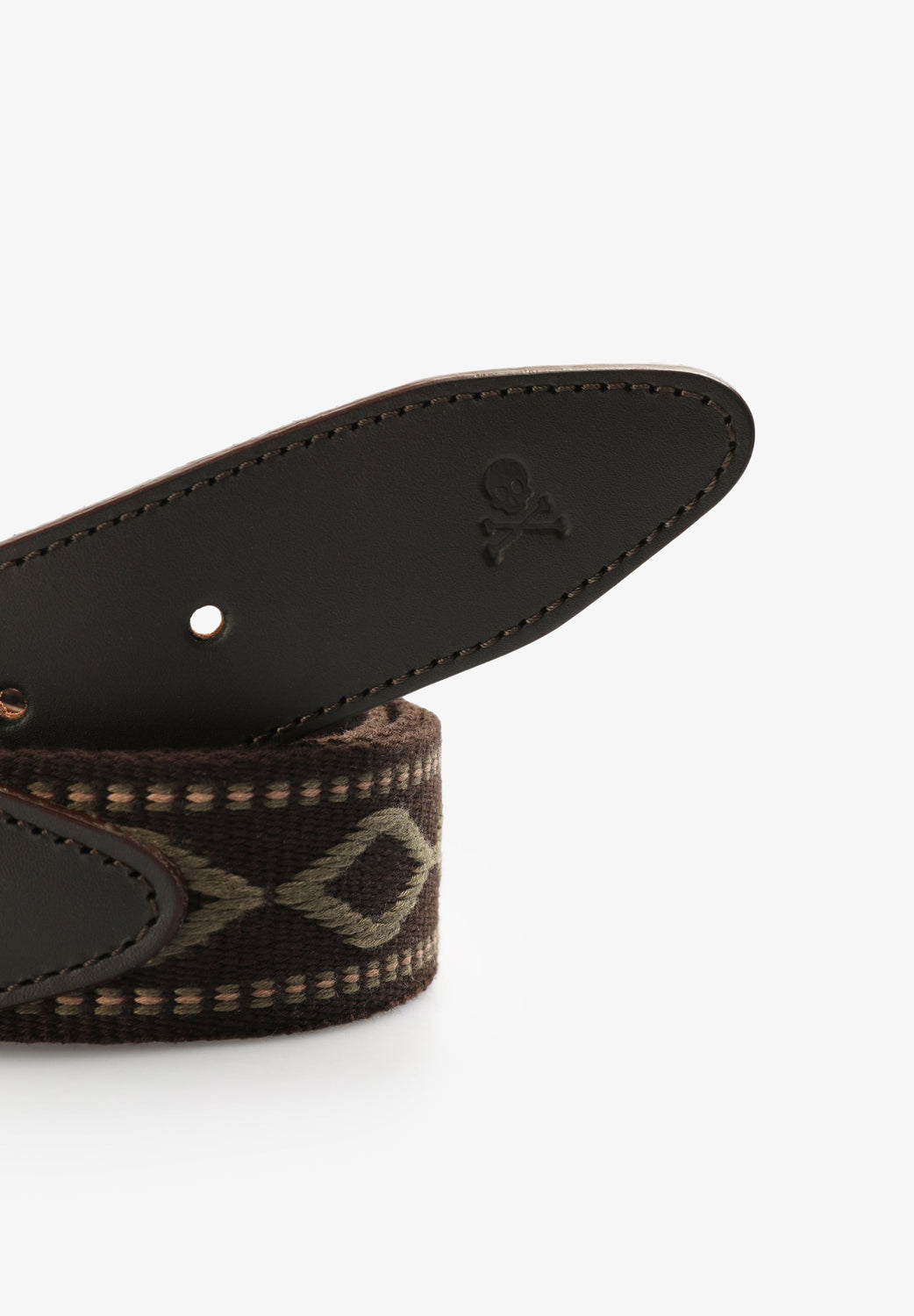 Cinturón con estampado étnico y detalles de piel con cierre de hebilla metálica.