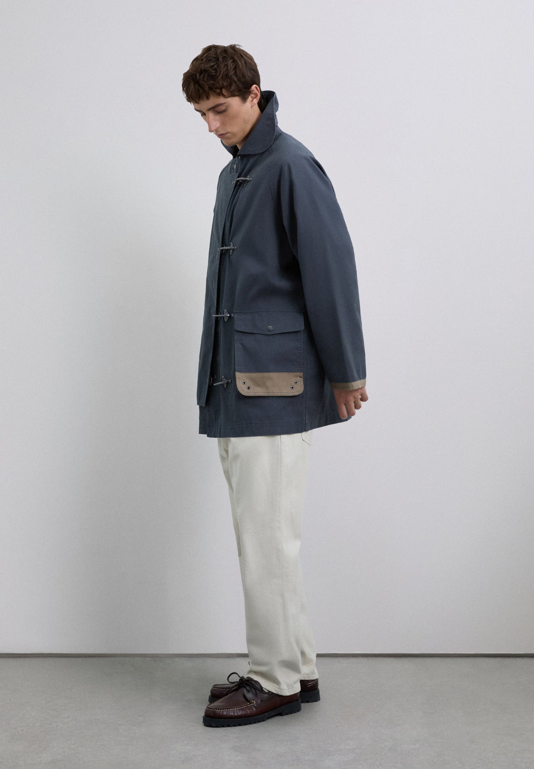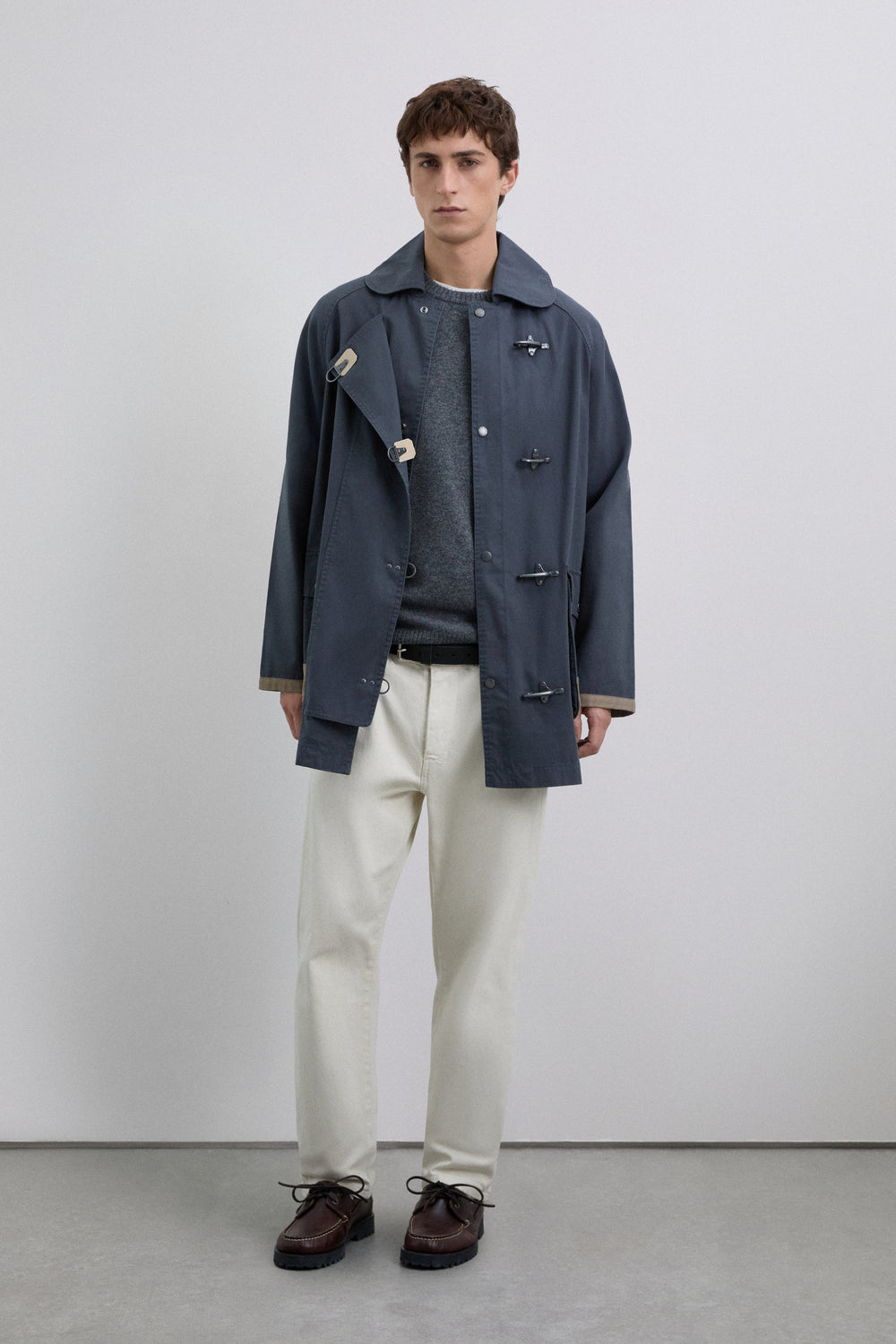 Chaqueta confeccionada en 100% algodón orgánico. Bolsillos de botón en frontal. Bolsillos laterales con detalles de ojales. Corte oversize. Cuello redondeado de estilo camisa. Manga ranglan. Cierre con broches y toggles. Vivos de ante en el bajo de la manga y en el borde inferior del bolsillo.