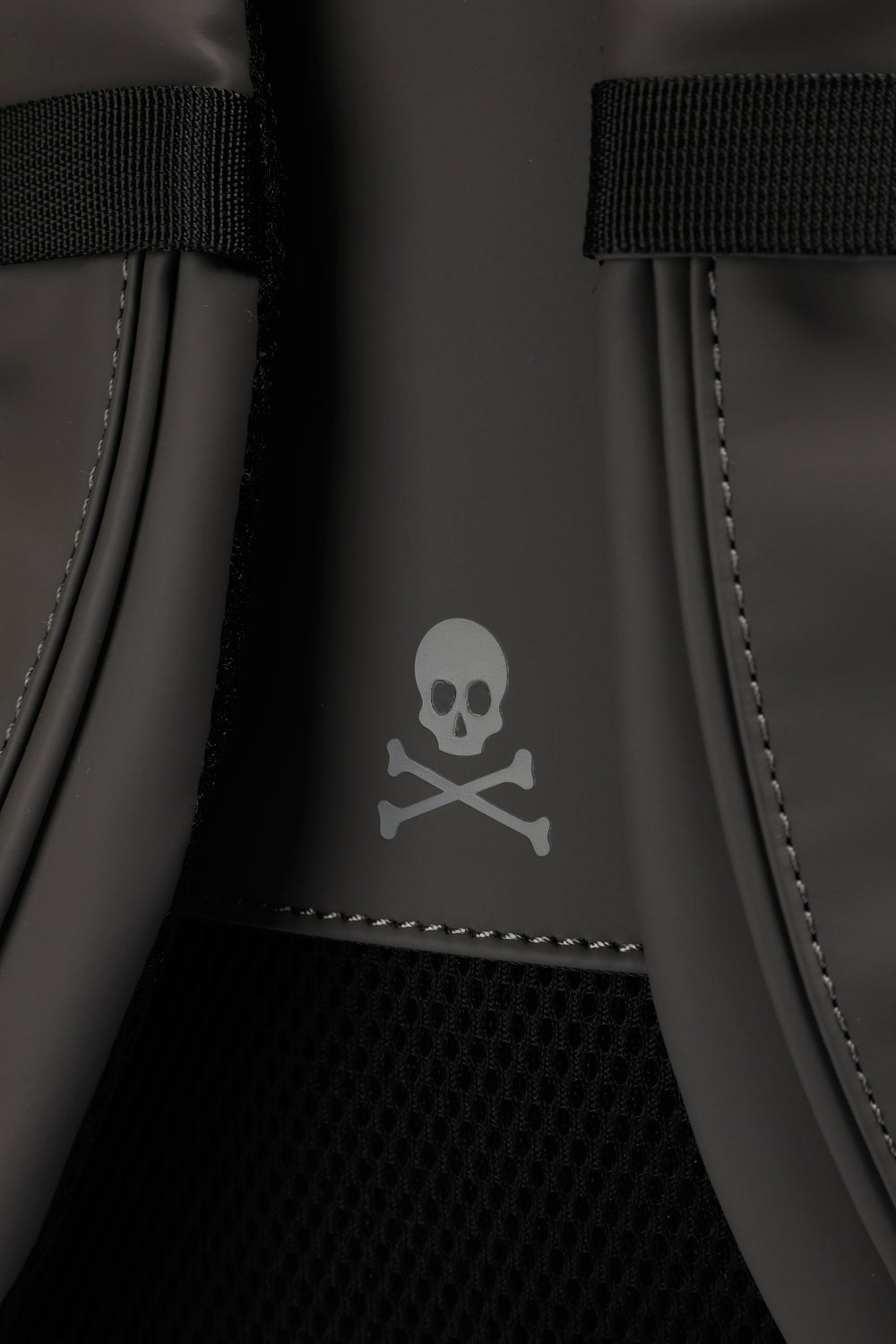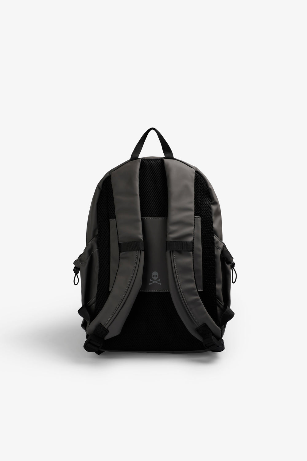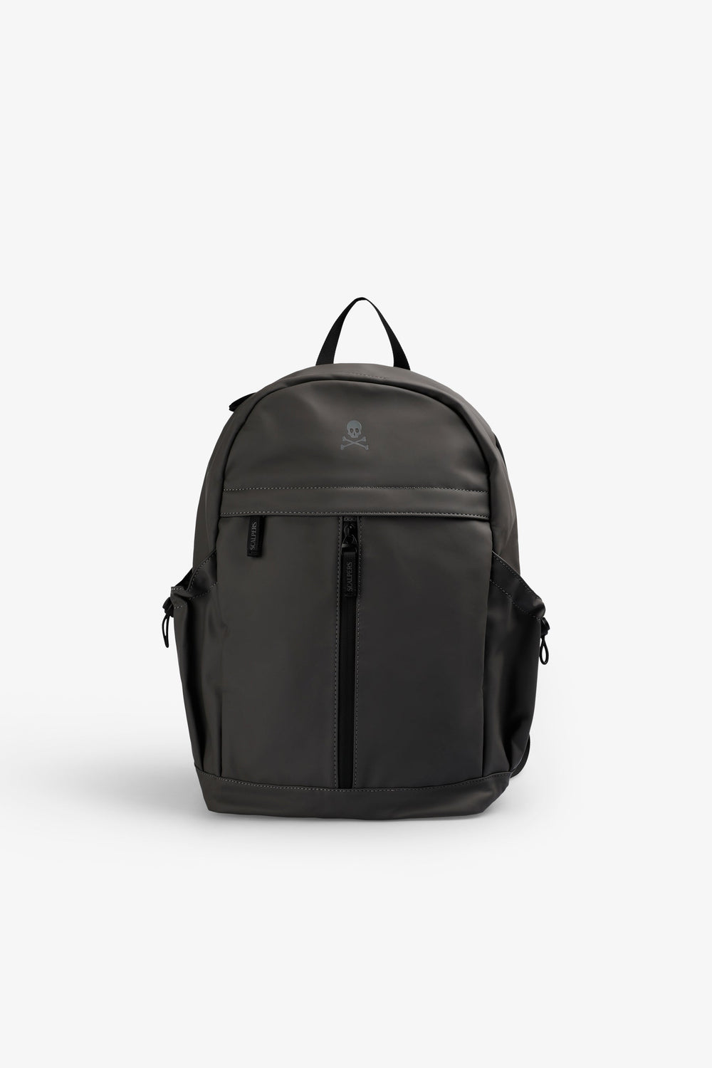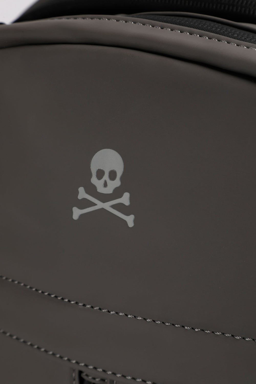 Mochila confeccionada en tejido técnico. Doble bolsillo frontal exterior. Cierre ajustable con hebillas. Detalle de calavera en print frontal y trasero. Asa superior. Ajustes de sujeción en laterales y espalda. Refuerzo acolchado en espalda.