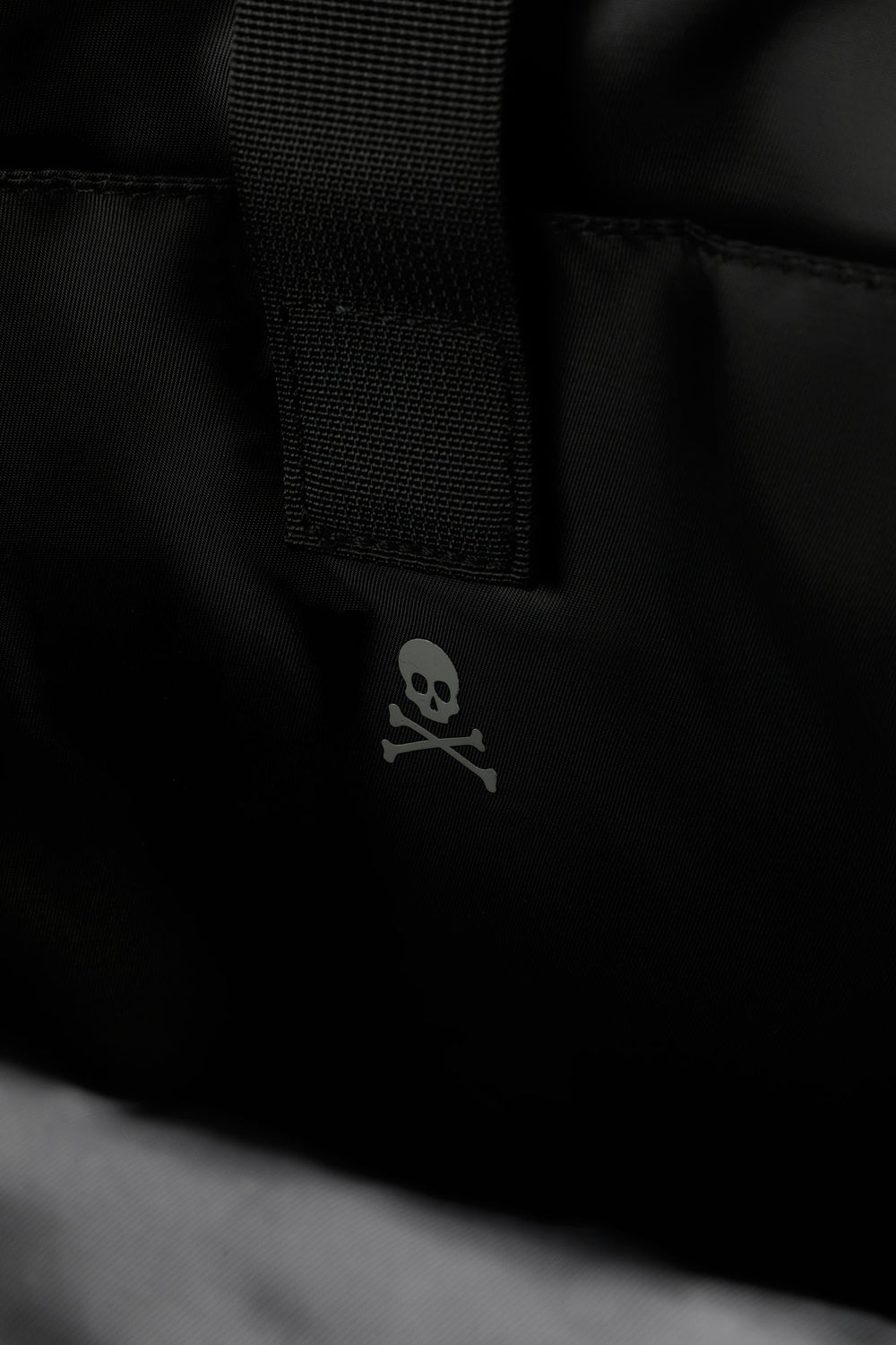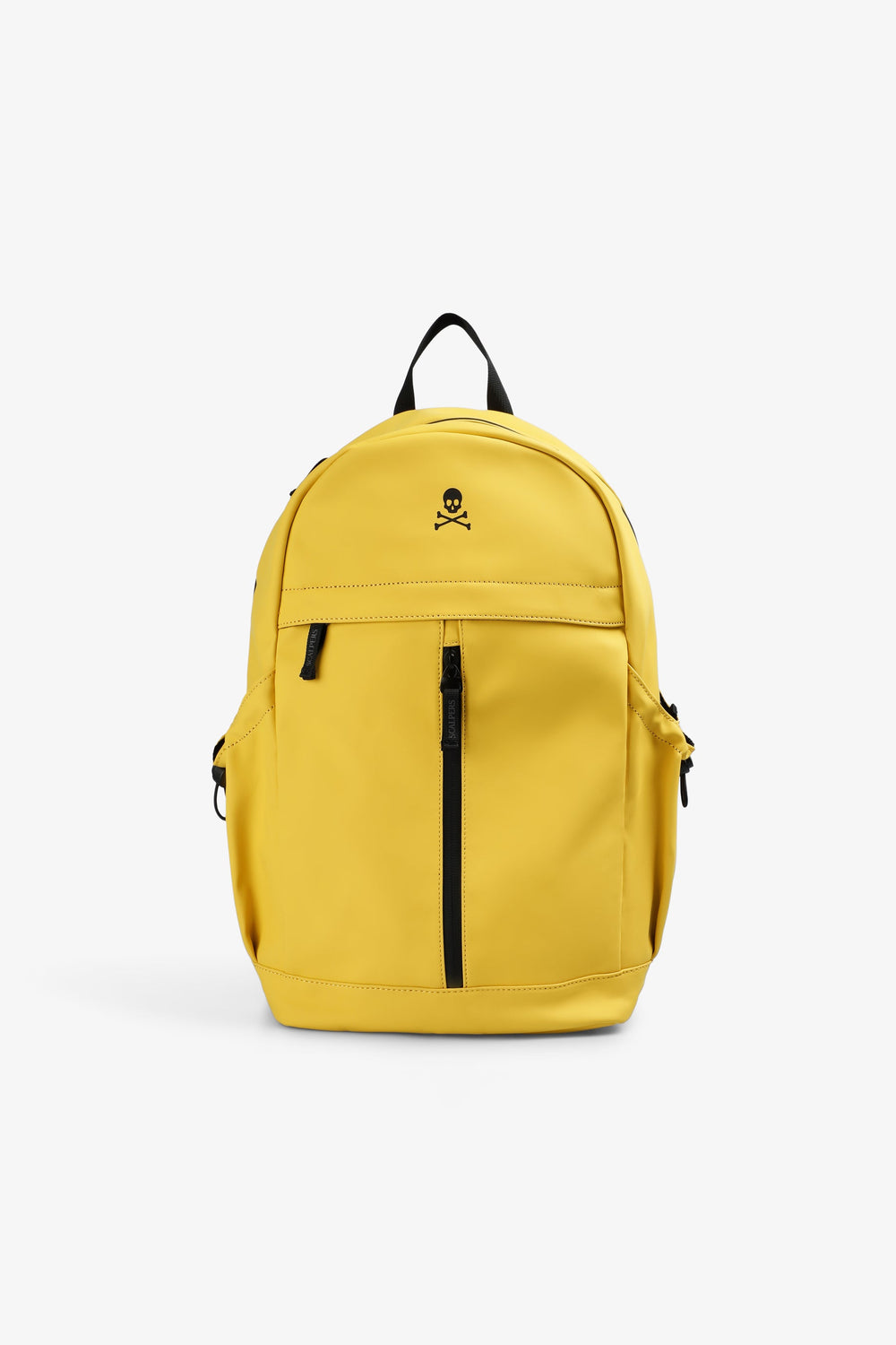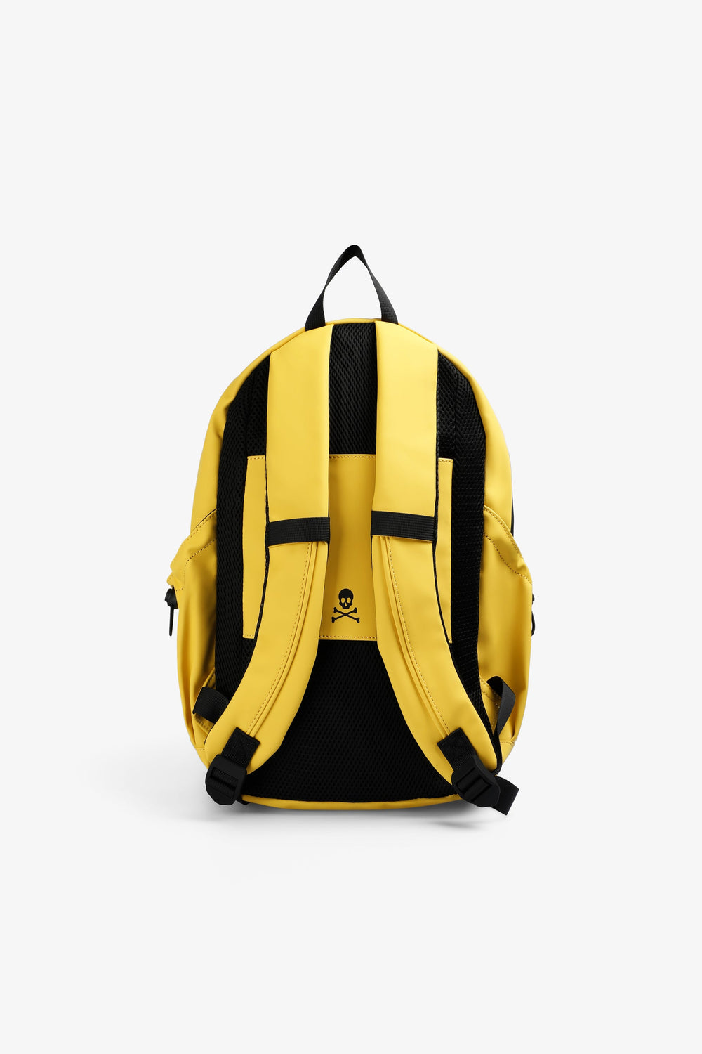 Mochila confeccionada en tejido técnico. Doble bolsillo frontal exterior. Cierre ajustable con hebillas. Detalle de calavera en print frontal y trasero. Asa superior. Ajustes de sujeción en laterales y espalda. Refuerzo acolchado en espalda.