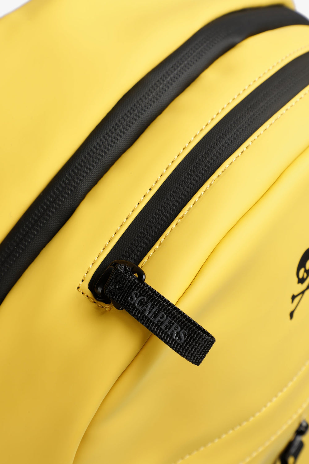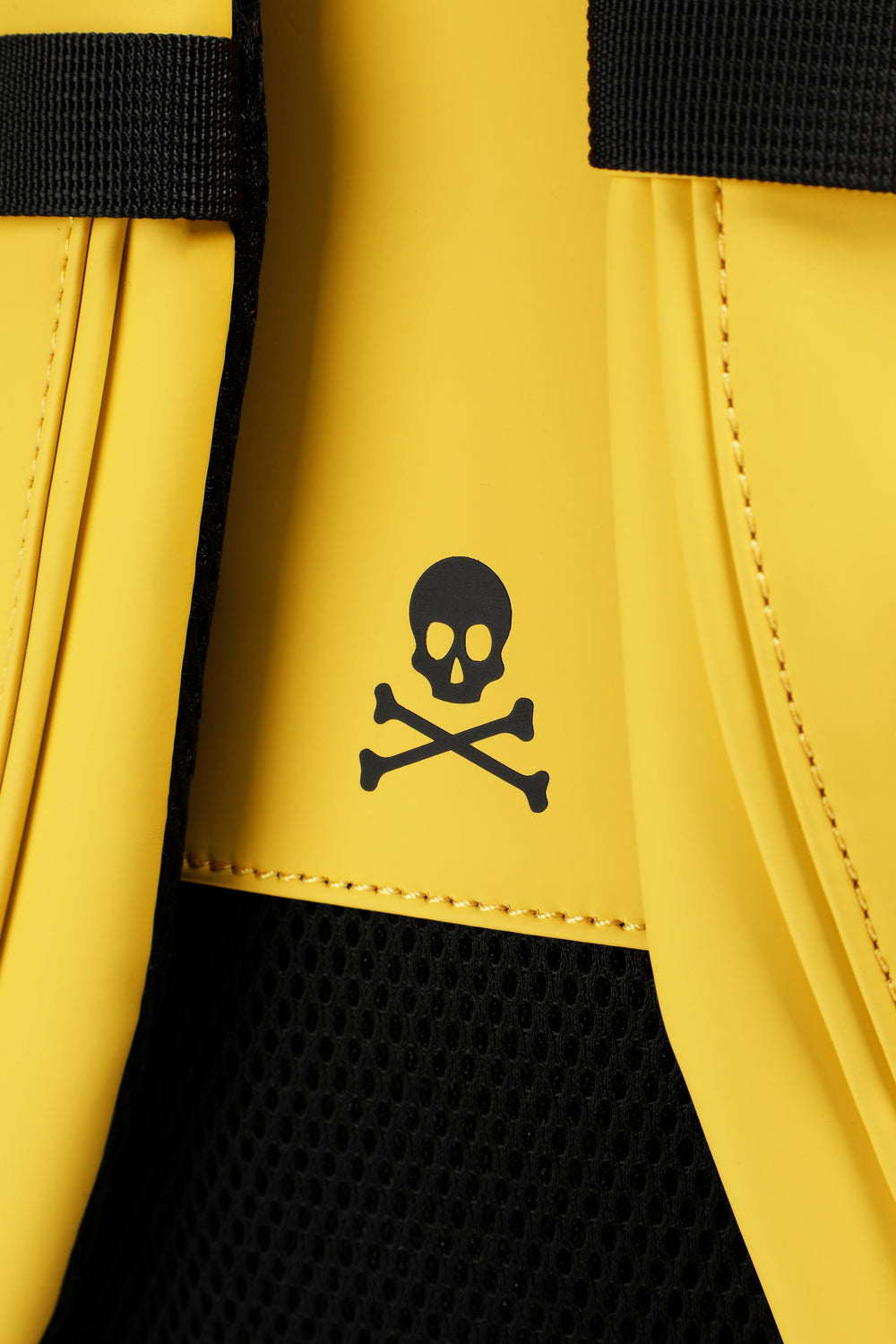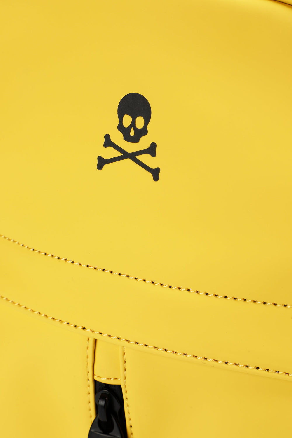 Mochila confeccionada en tejido técnico. Doble bolsillo frontal exterior. Cierre ajustable con hebillas. Detalle de calavera en print frontal y trasero. Asa superior. Ajustes de sujeción en laterales y espalda. Refuerzo acolchado en espalda.