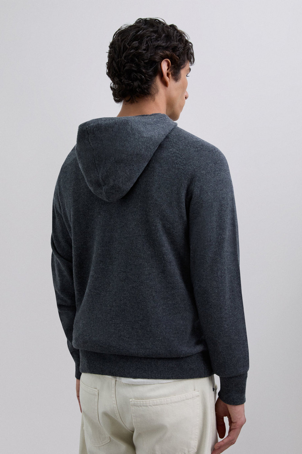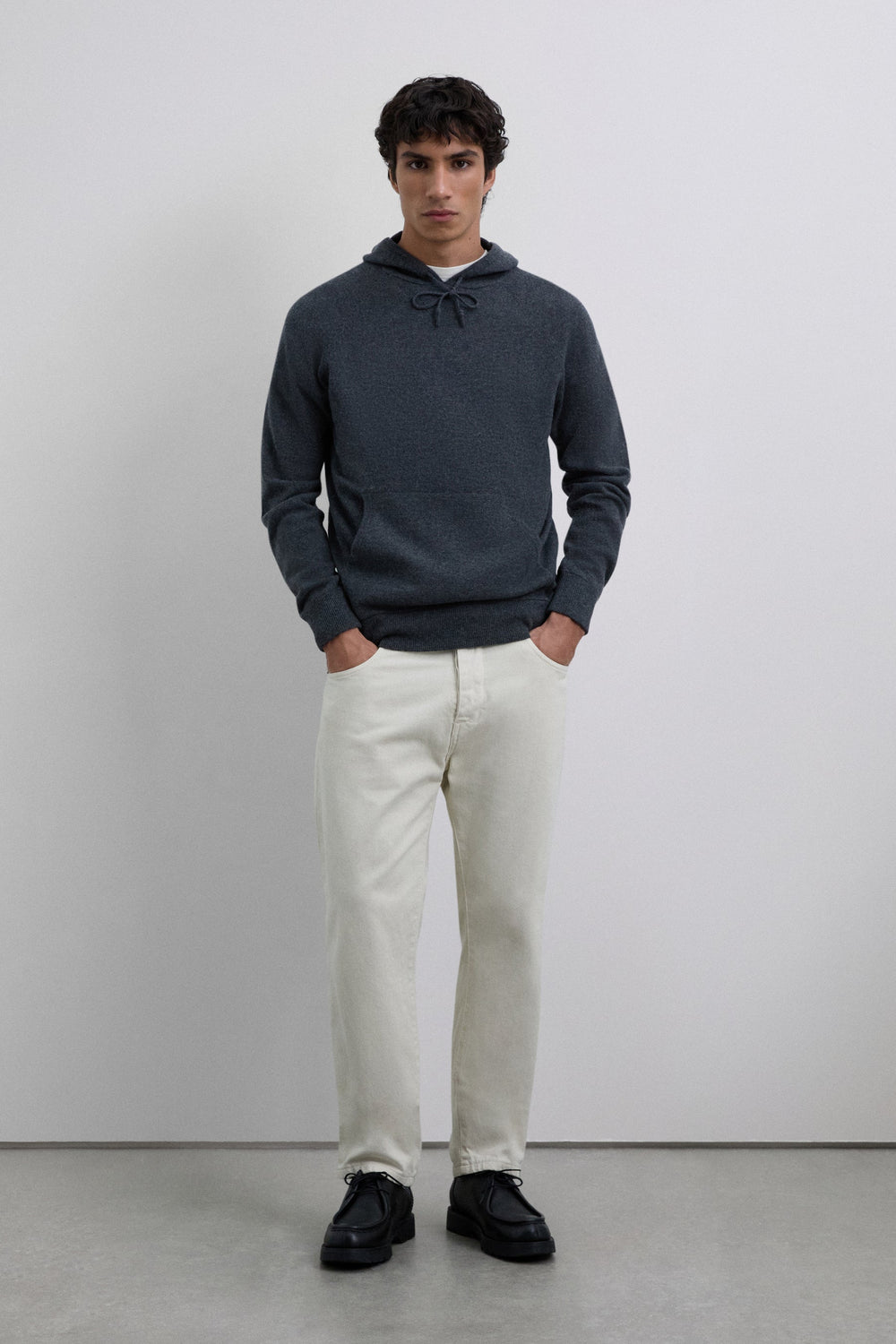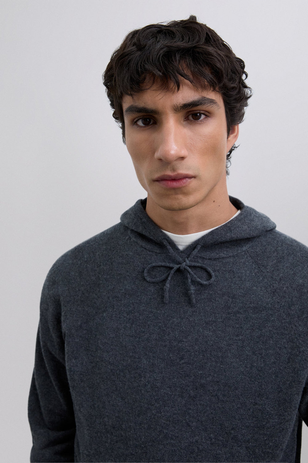 Jersey de punto confeccionado en 100% lana. Capucha ajustable mediante cordones. Manga larga. Bolsillo frontal estilo canguro. Mangas y cintura acabados en rib.