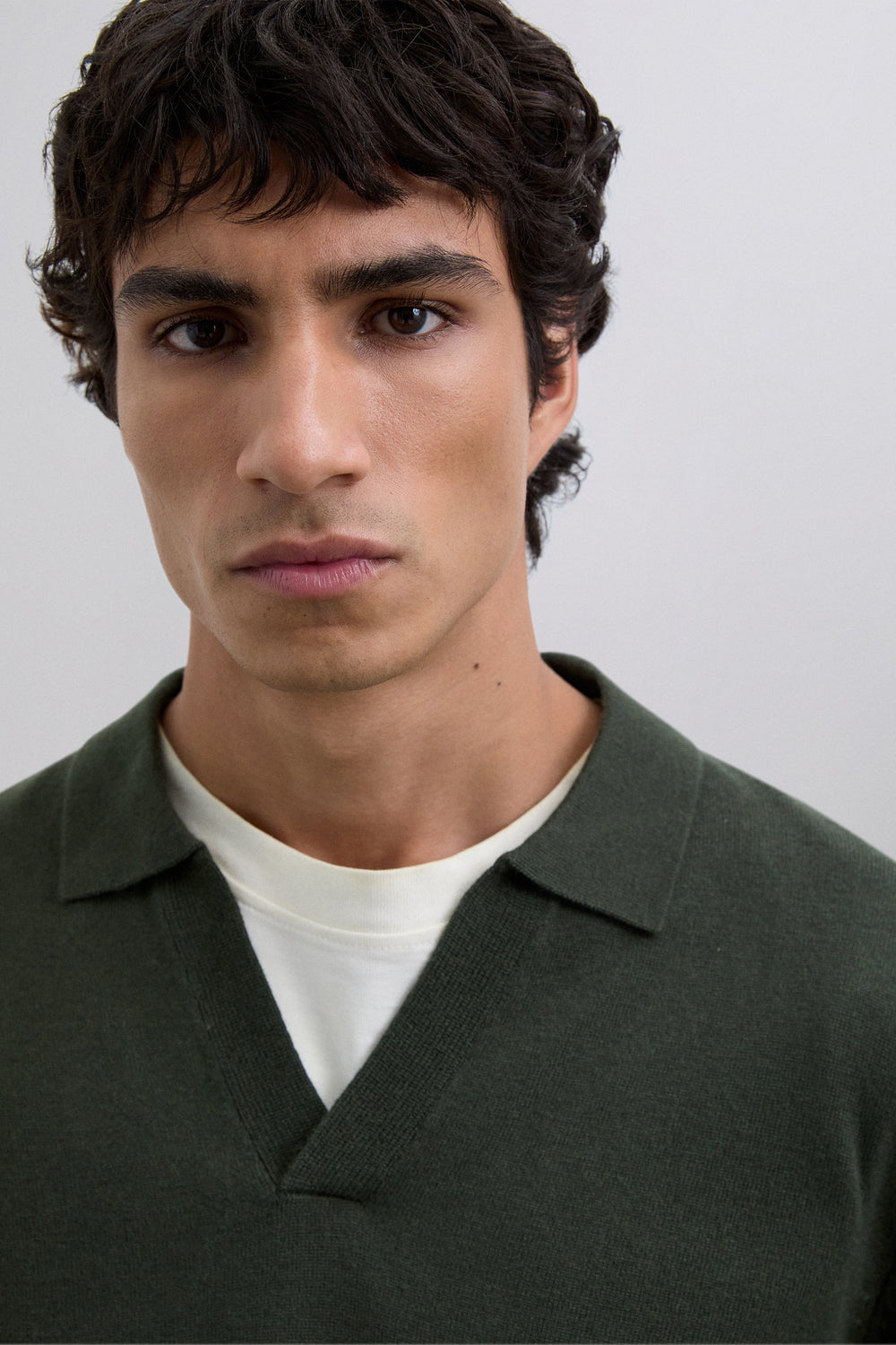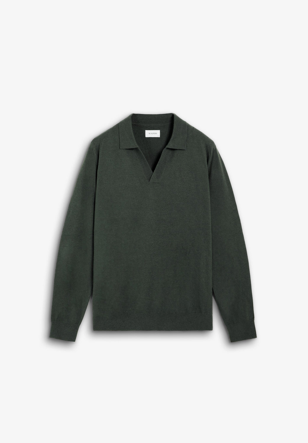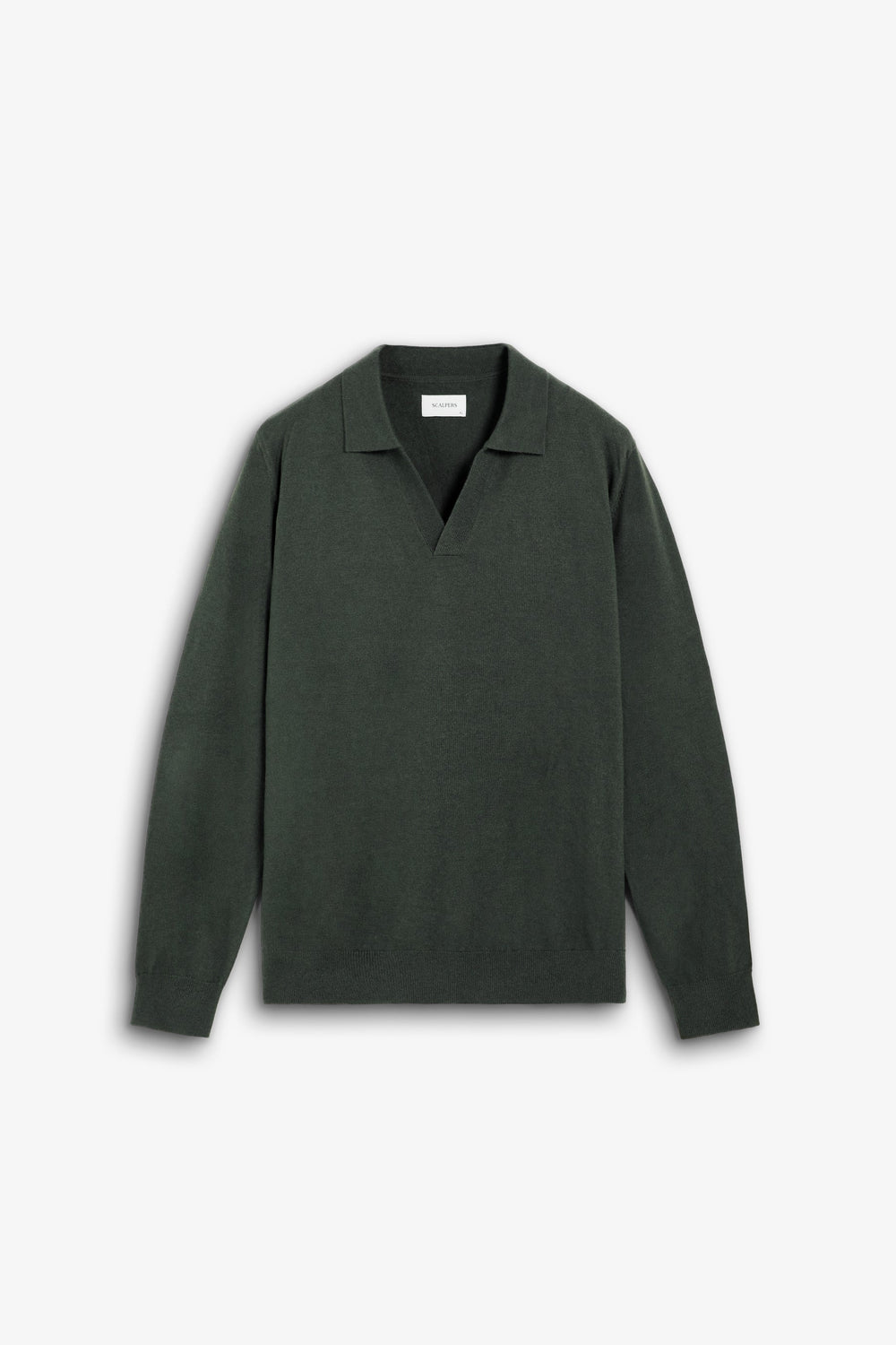 Polo de punto confeccionado en lana. Manga larga. Acabados en rib. Cuello de pico.