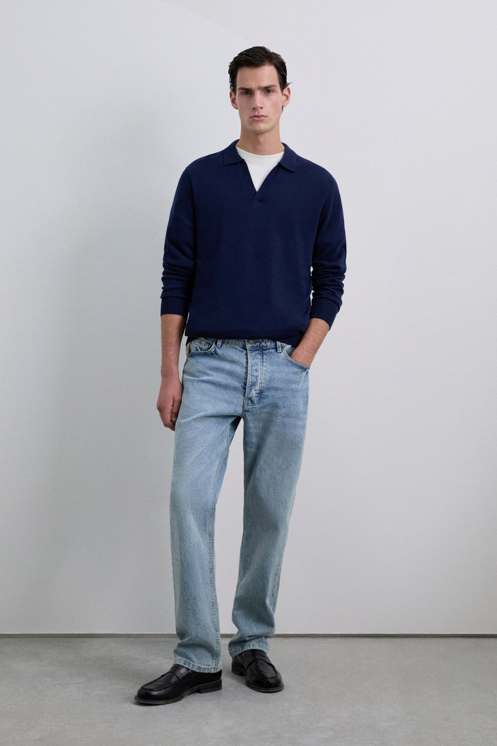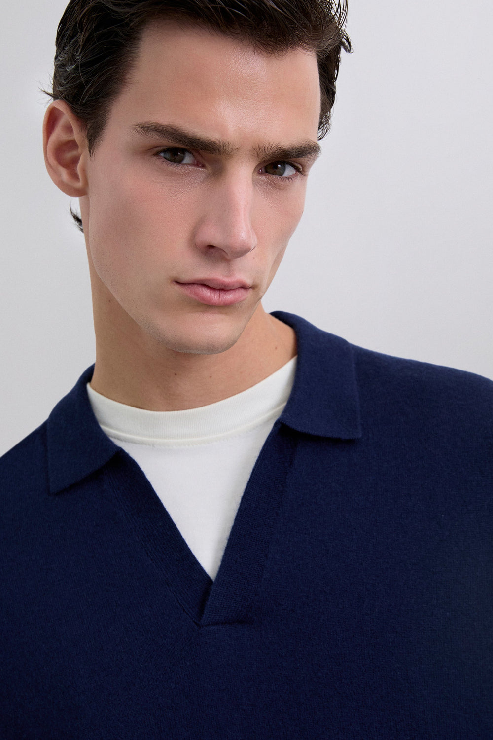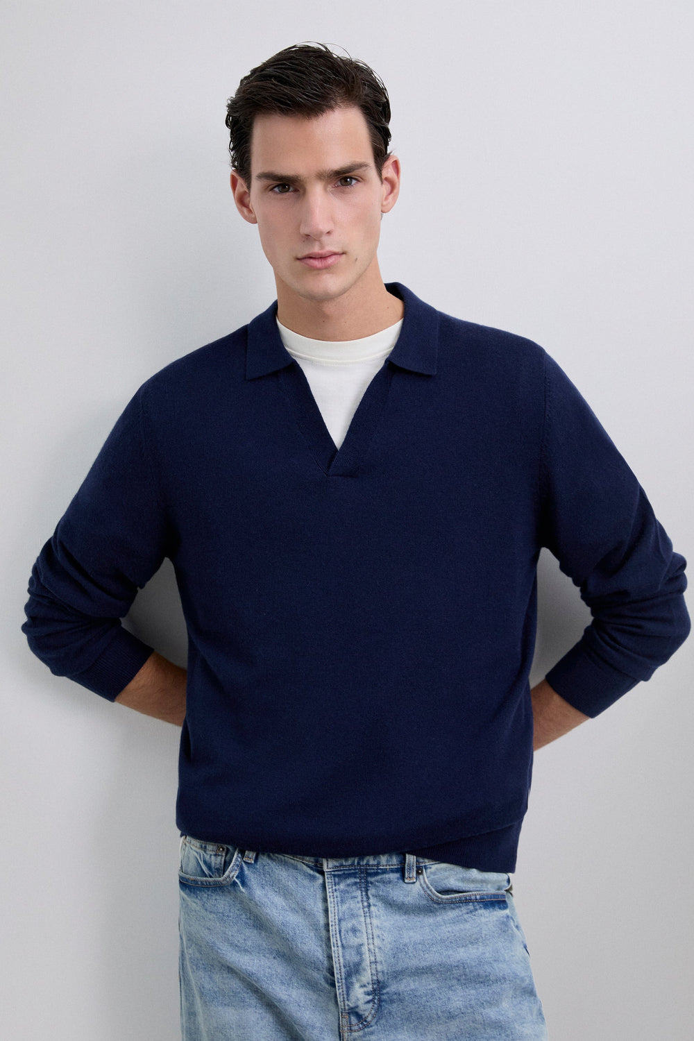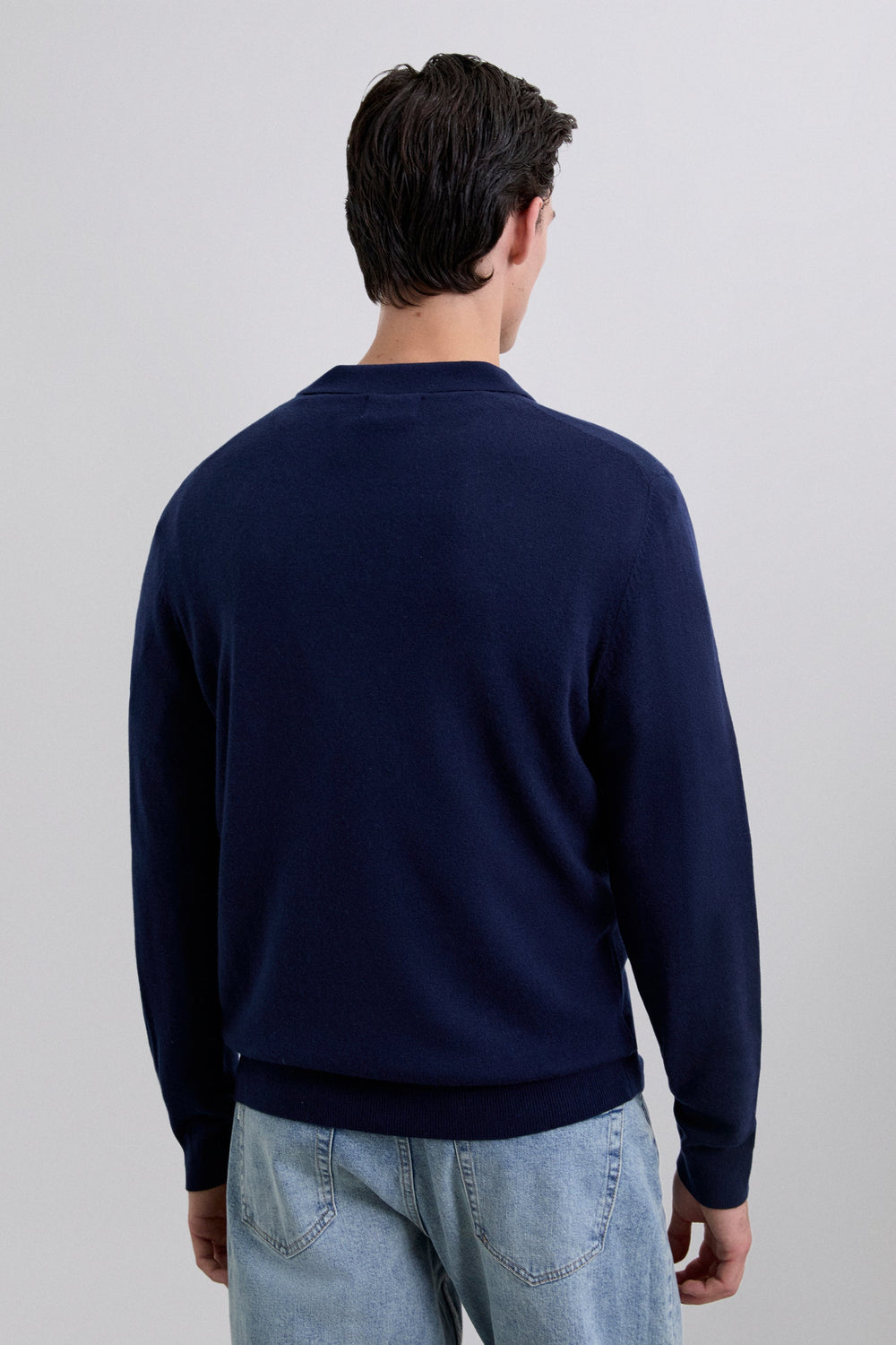 Polo de punto confeccionado en lana. Manga larga. Acabados en rib. Cuello de pico.