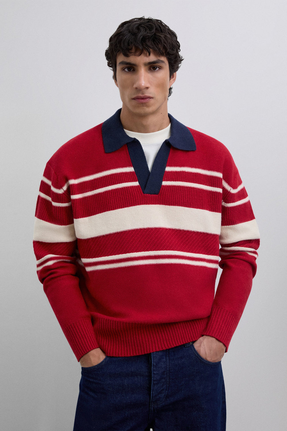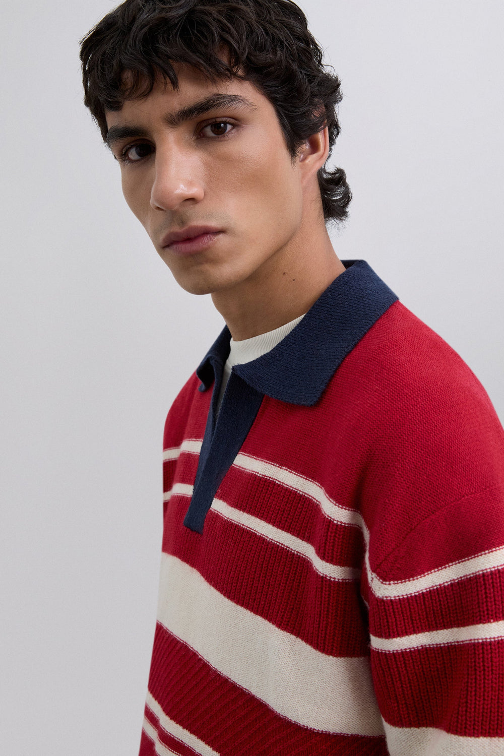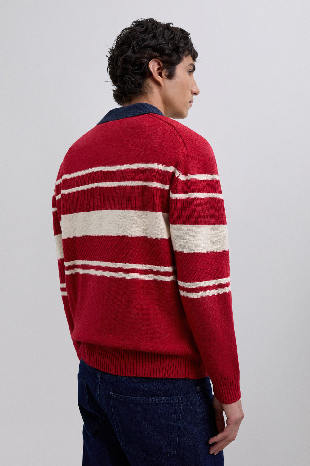 Jersey confeccionado en lana y algodón BCI. Regular Fit. Estampado de rayas. Cuello tipo polo a contraste. Manga larga. Acabados en rib.