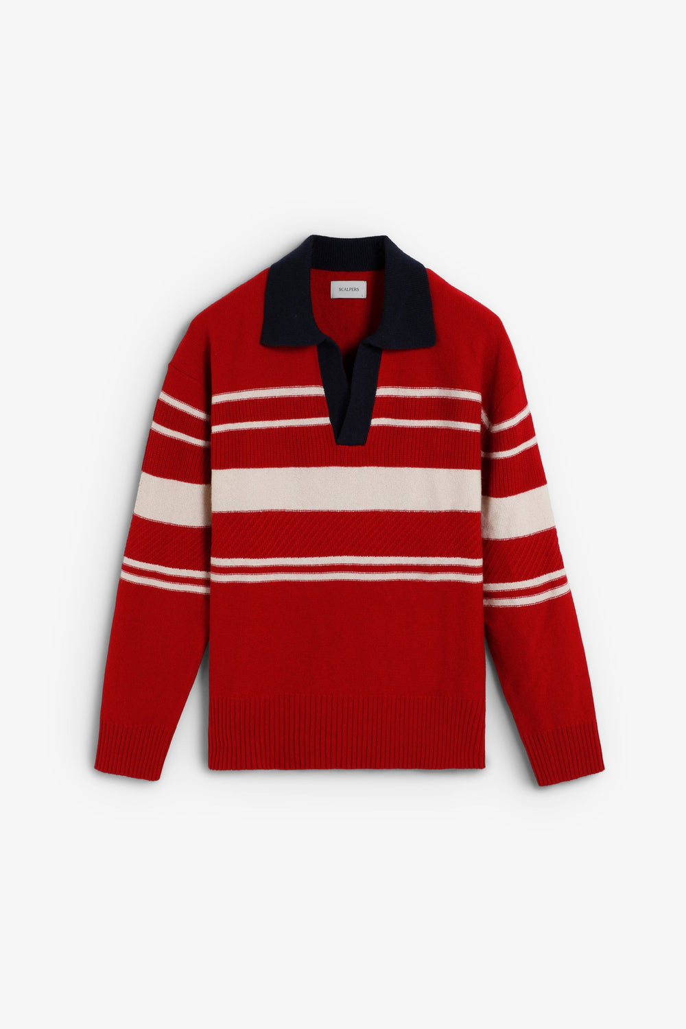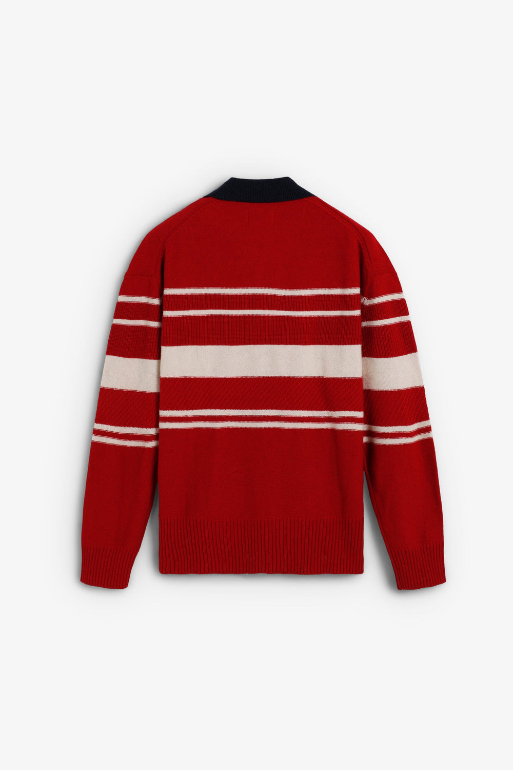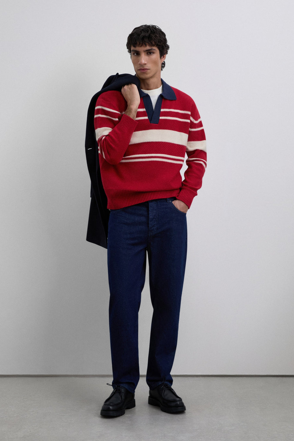 Jersey confeccionado en lana y algodón BCI. Regular Fit. Estampado de rayas. Cuello tipo polo a contraste. Manga larga. Acabados en rib.