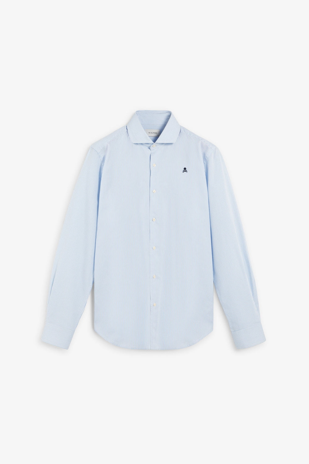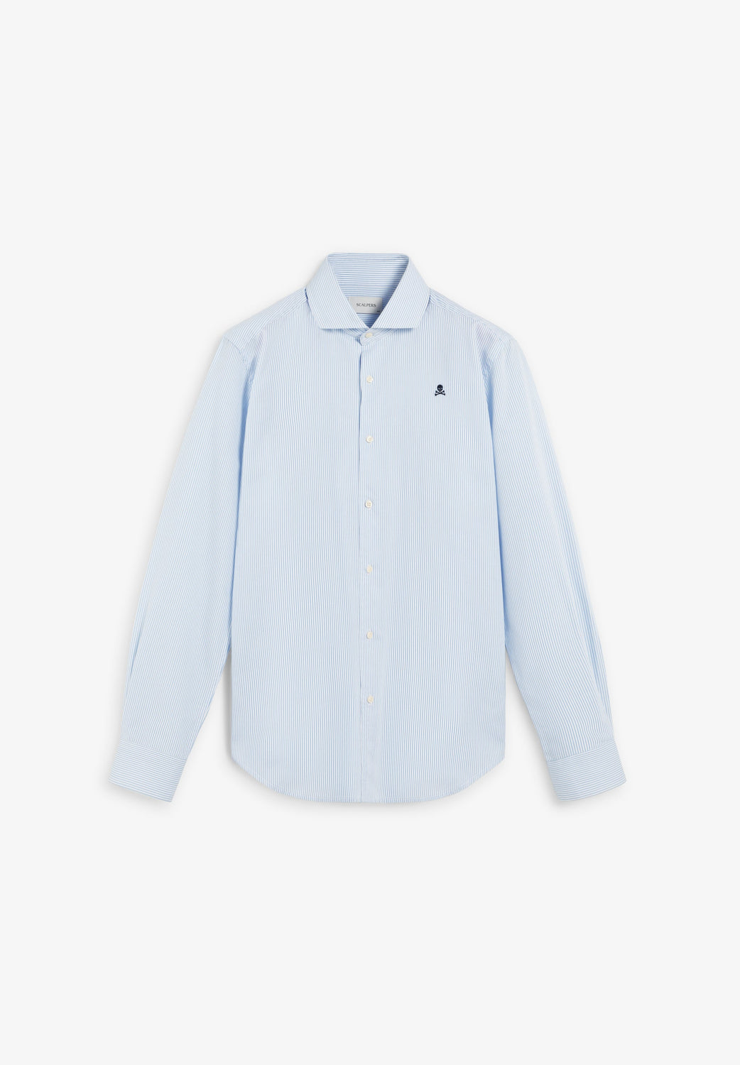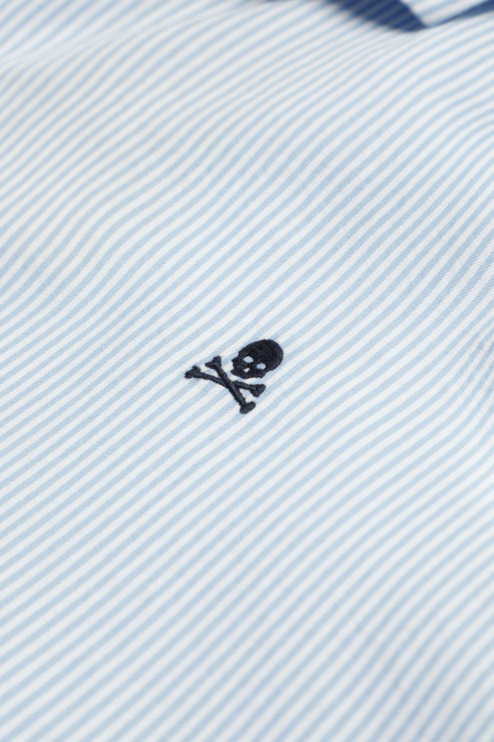 Camisa confeccionada en 100% algodón BCI. Regular Fit. Manga larga. Estampado de rayas. Cierre frontal y en puño mediante abotonadura. Detalle calavera bordada a contraste en pecho.