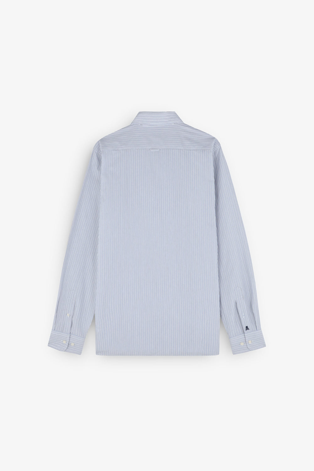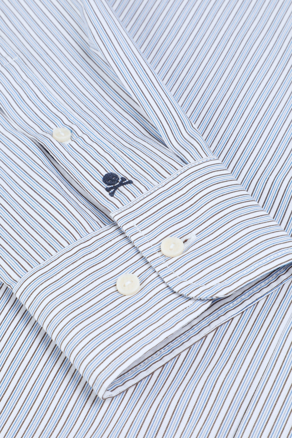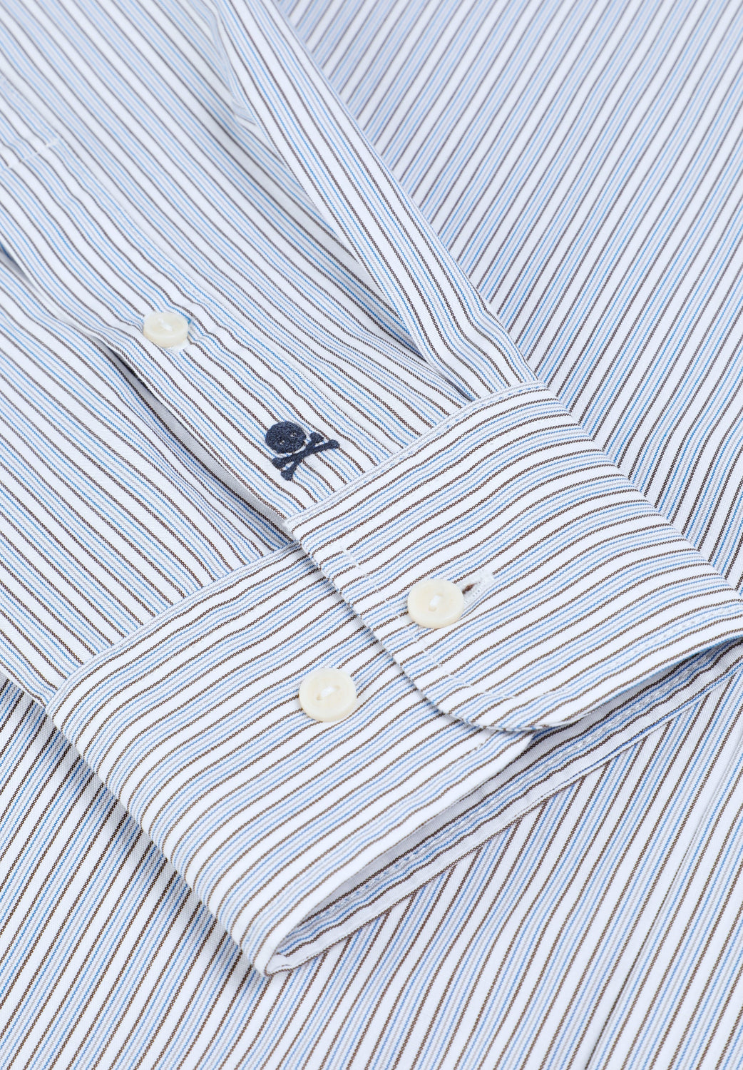 Camisa confeccionada en 100% algodón BCI. Manga larga. Estampado de rayas. Bolsillo frontal en pecho. Detalle calavera bordada a contraste en puño.