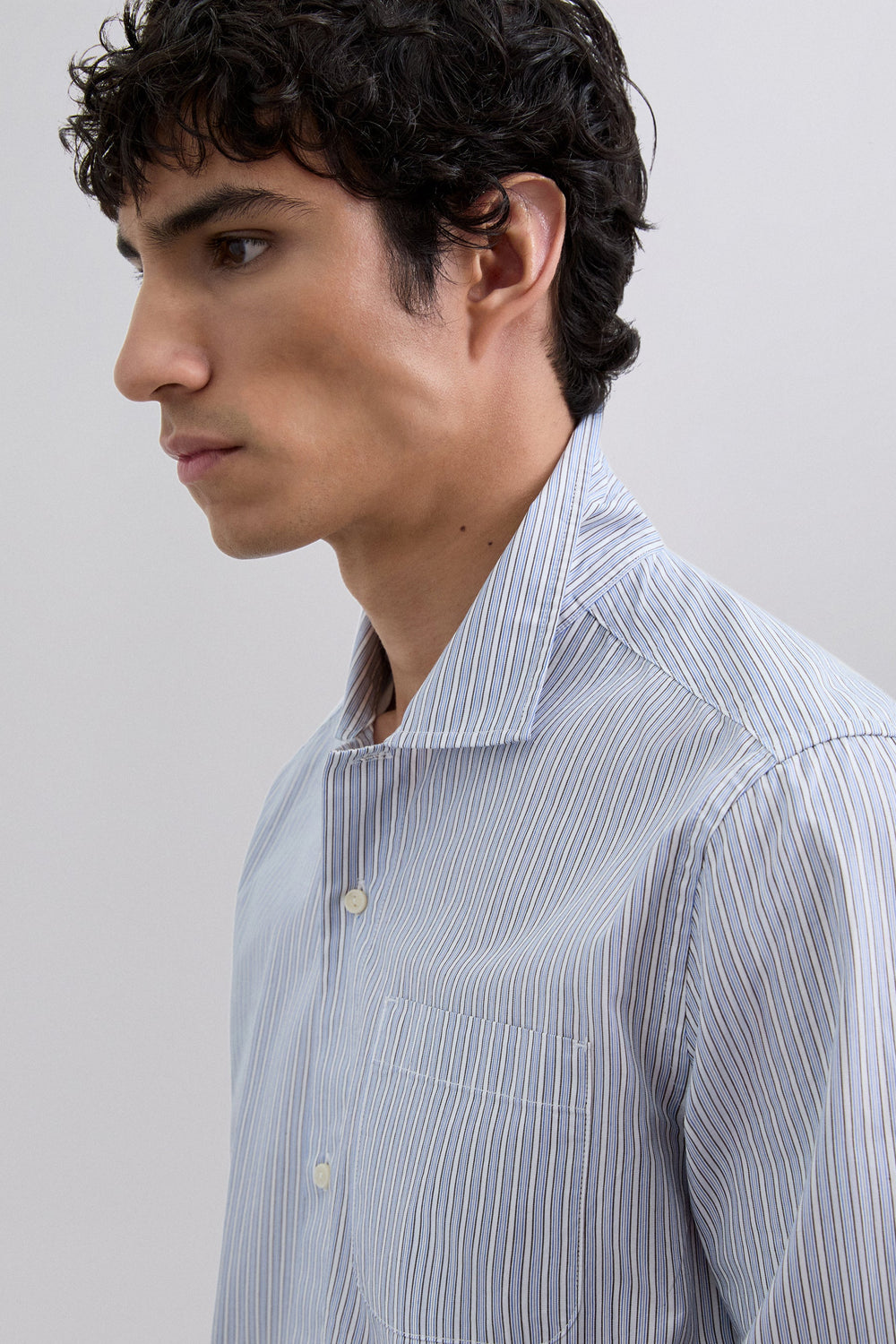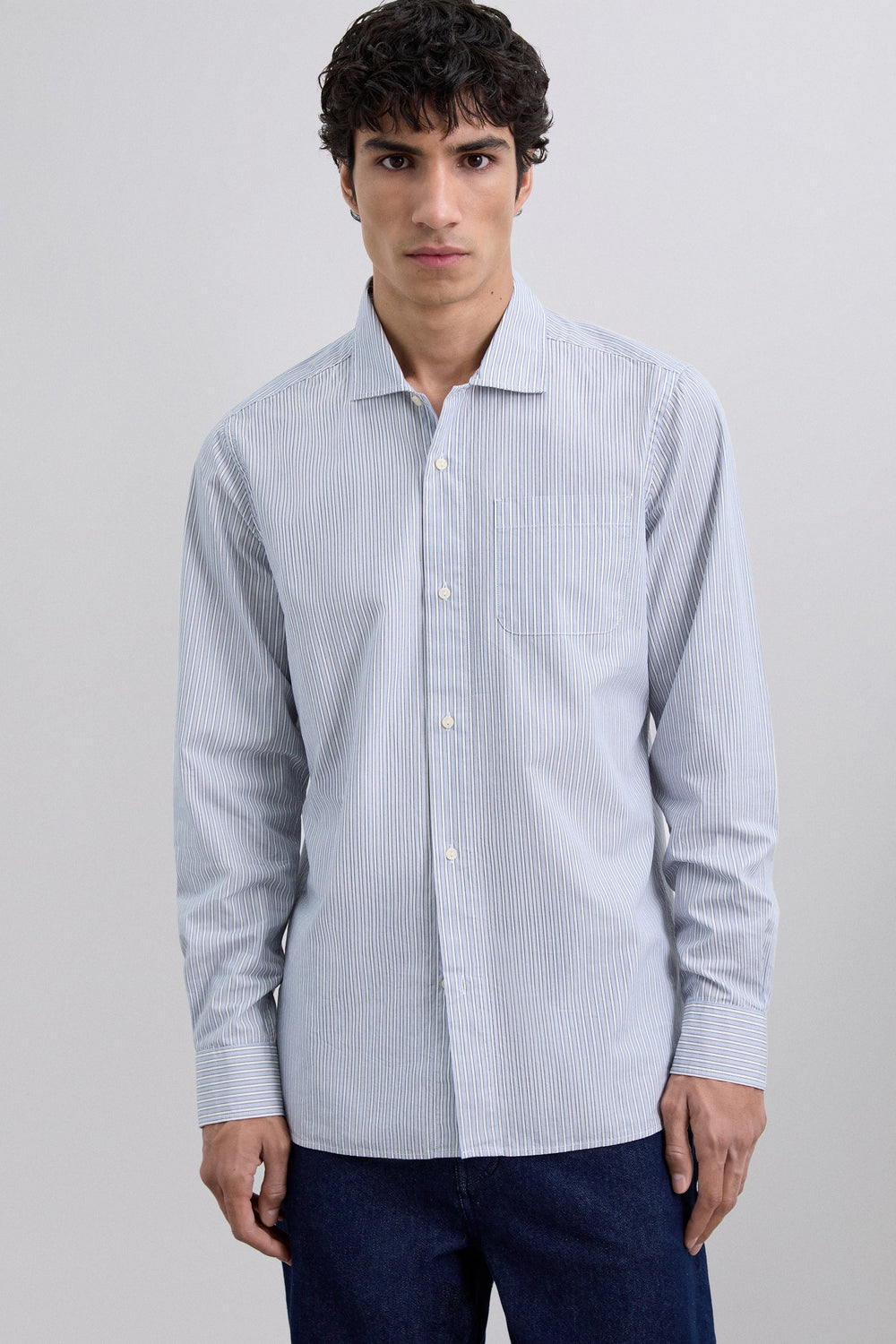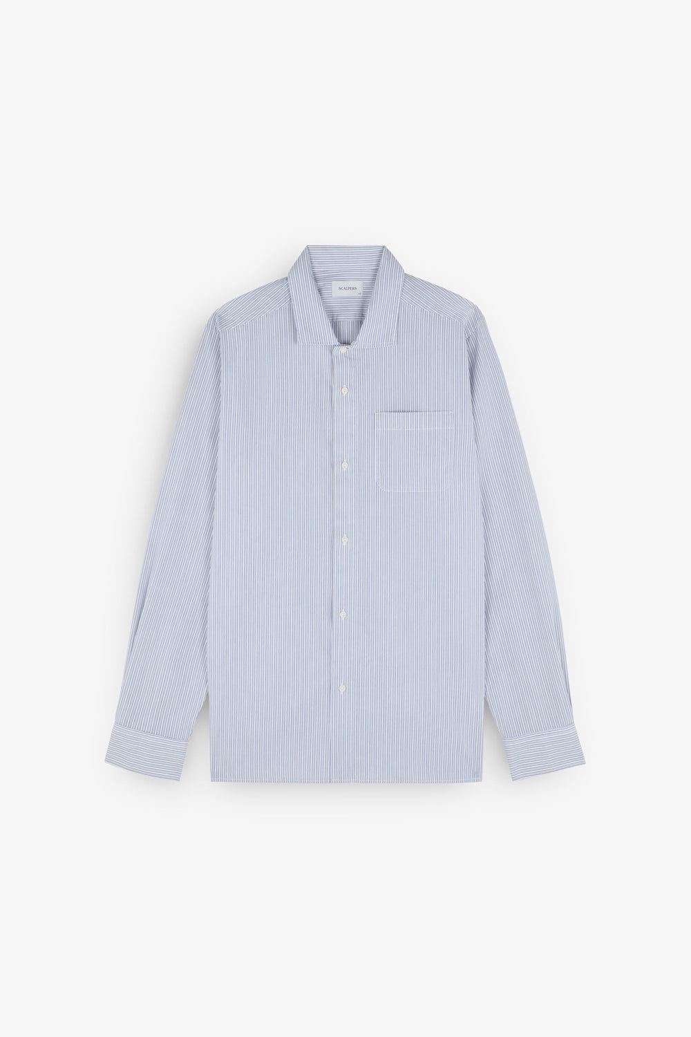 Camisa confeccionada en 100% algodón BCI. Manga larga. Estampado de rayas. Bolsillo frontal en pecho. Detalle calavera bordada a contraste en puño.