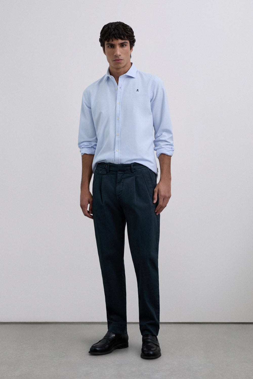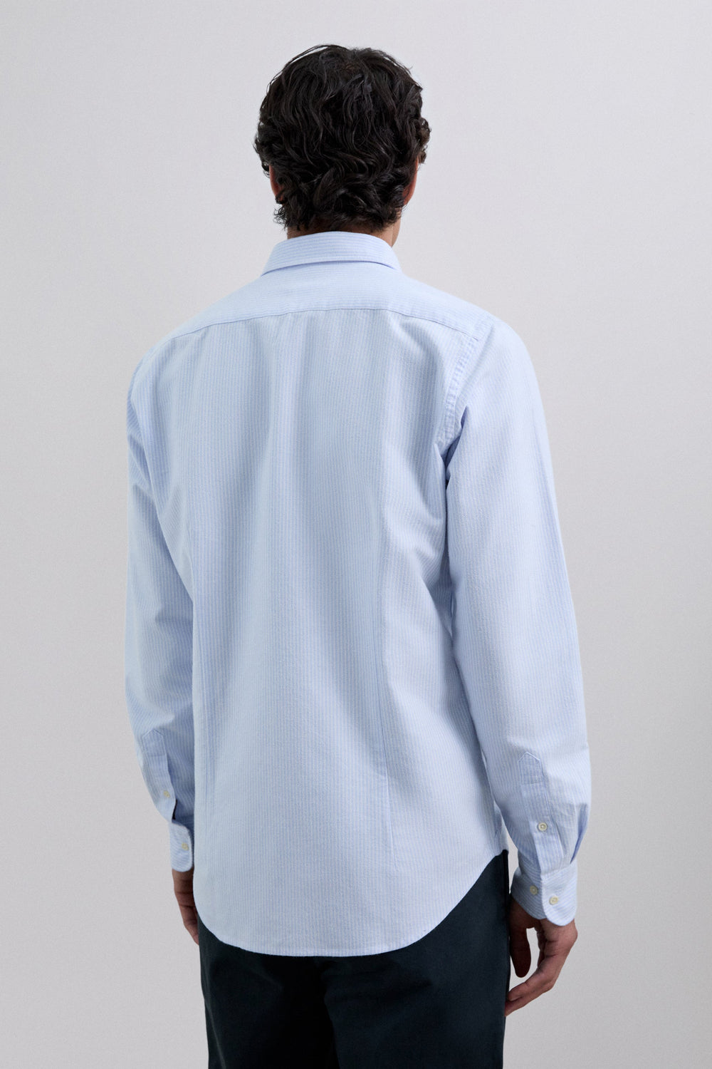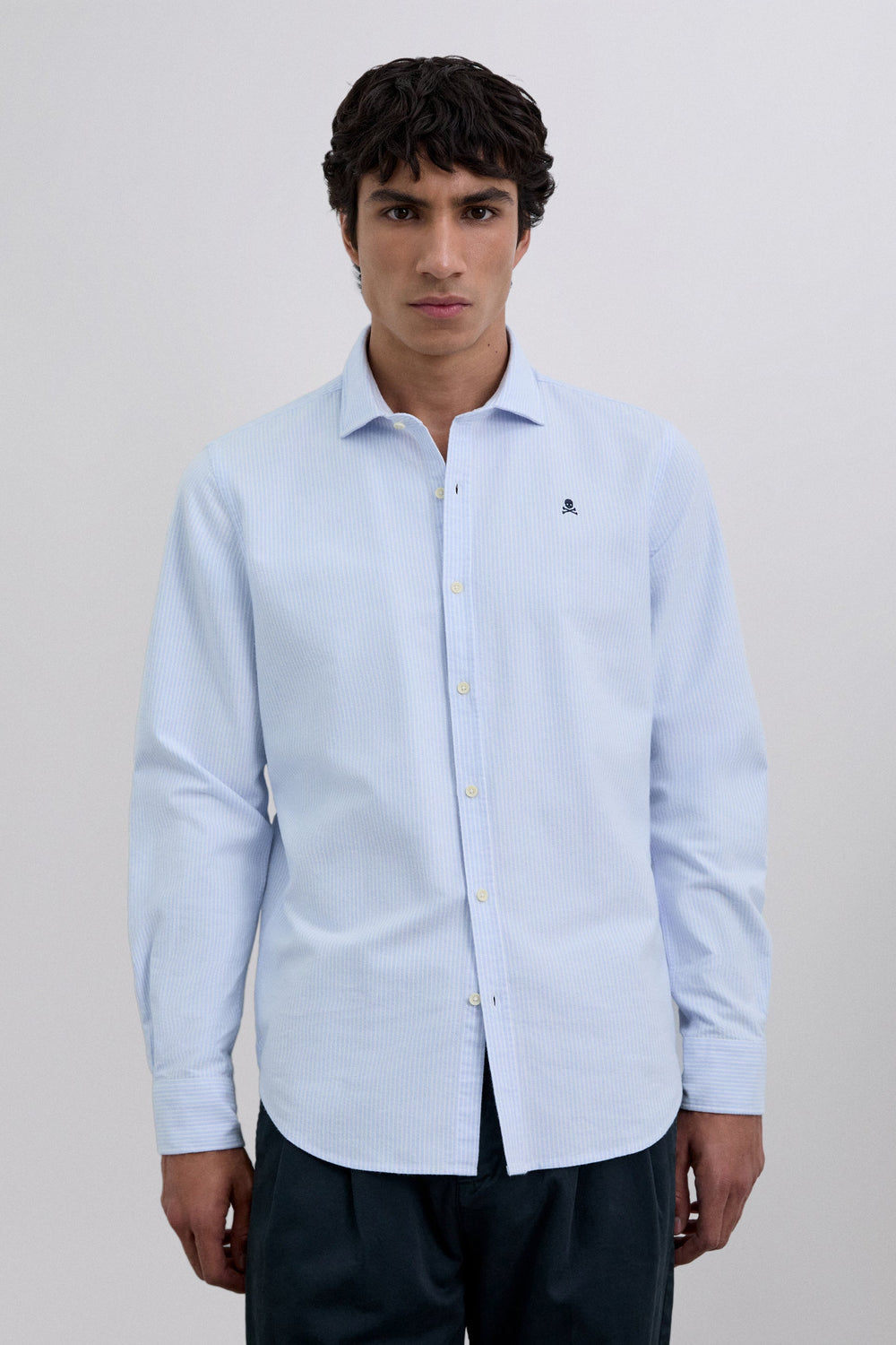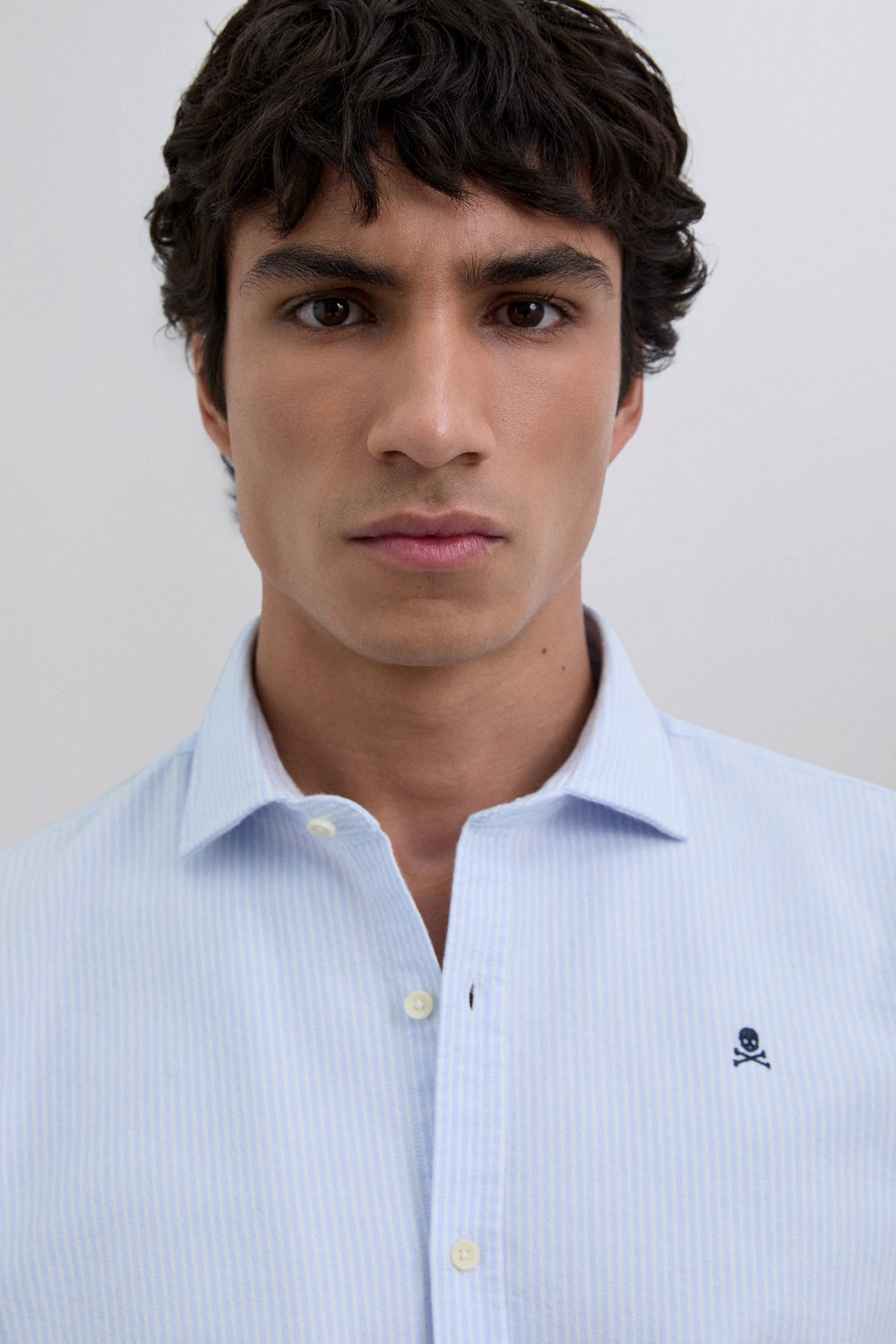 Camisa Oxford confeccionada en 100% algodón BCI. Regular Fit. Estampado de rayas. Manga larga. Cierre frontal y en puños mediante abotonadura. Detalle de calavera bordada a contraste en pecho.