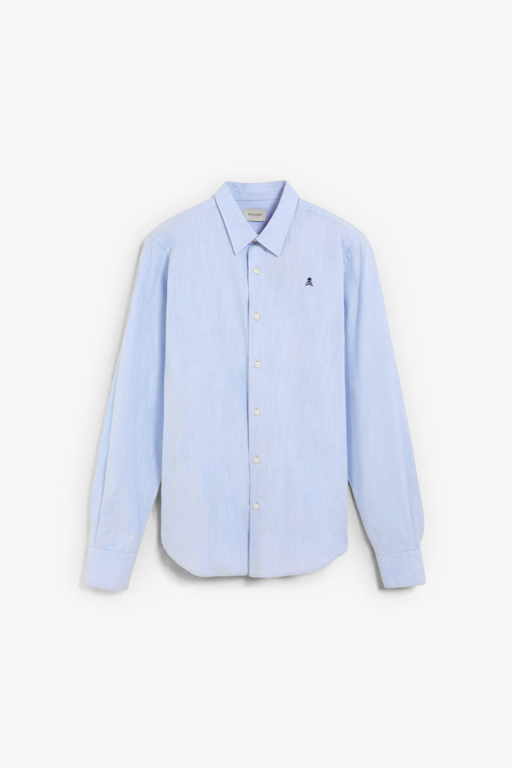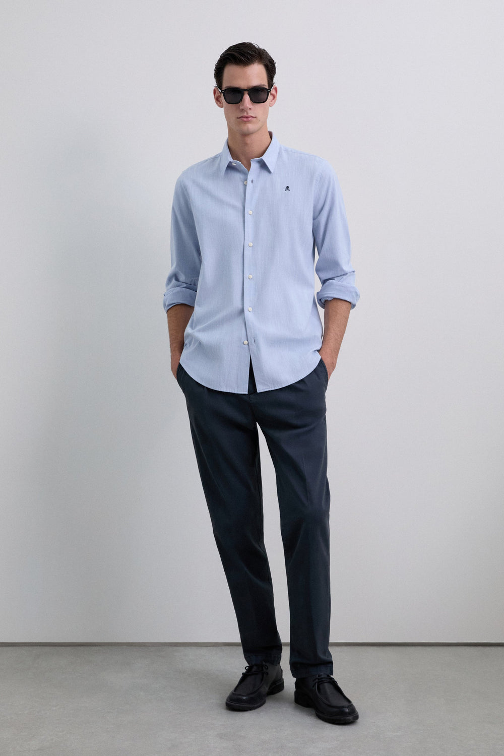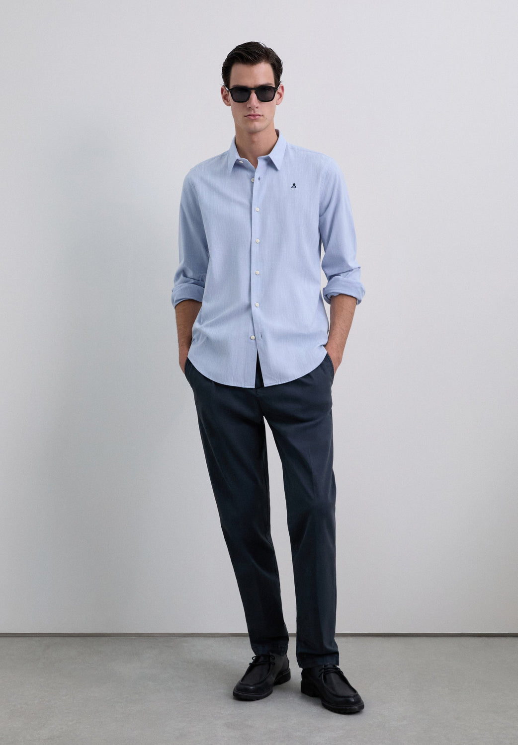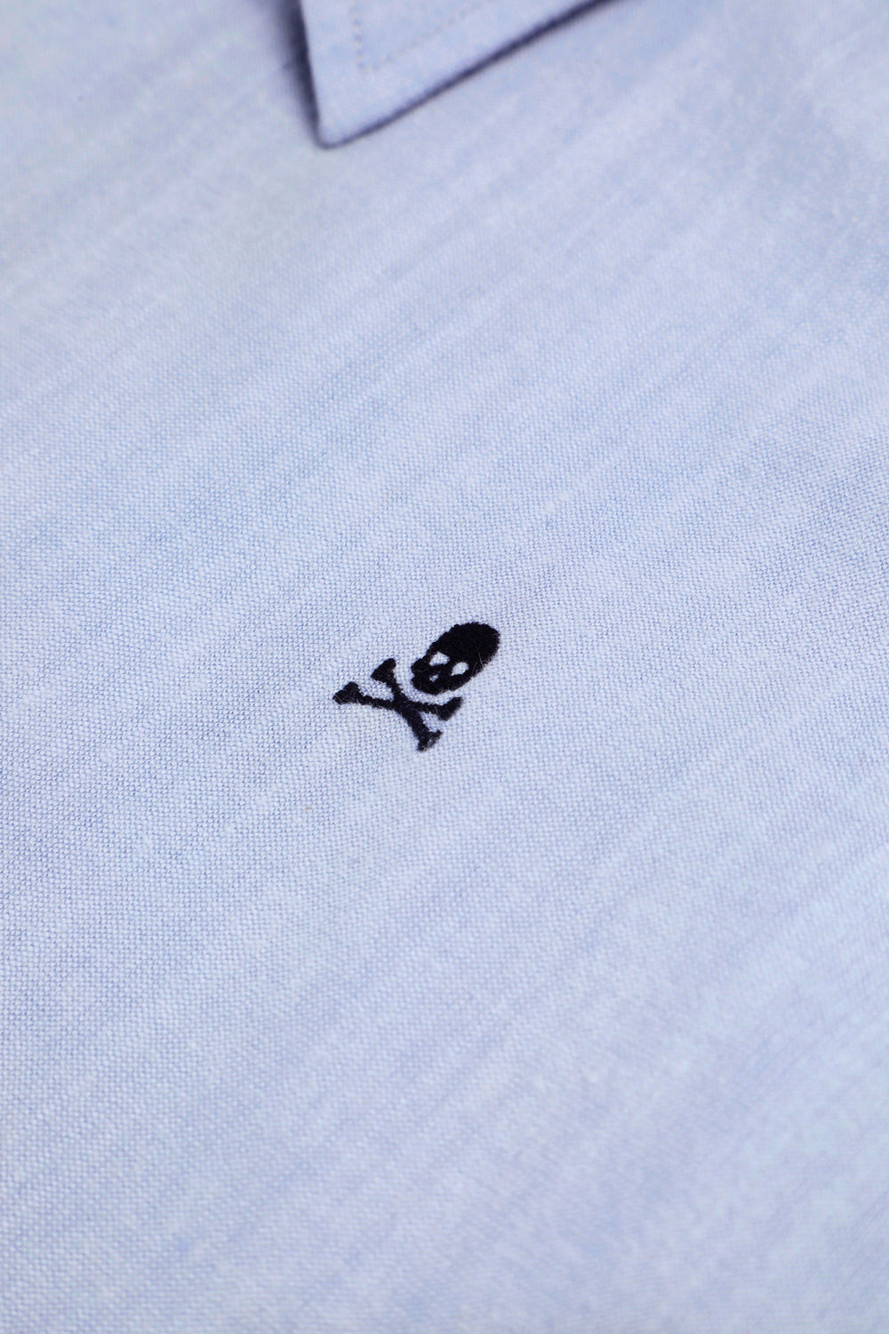 Camisa confeccionada en 100% algodón BCI. Regular Fit. Manga larga. Cuello italiano. Cierre frontal y en puños mediante abotonadura. Detalle de calavera bordada a contraste en pecho.
