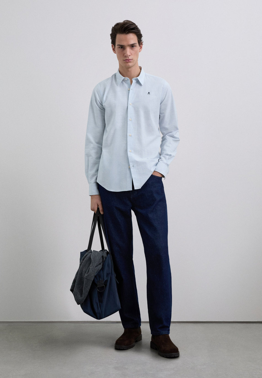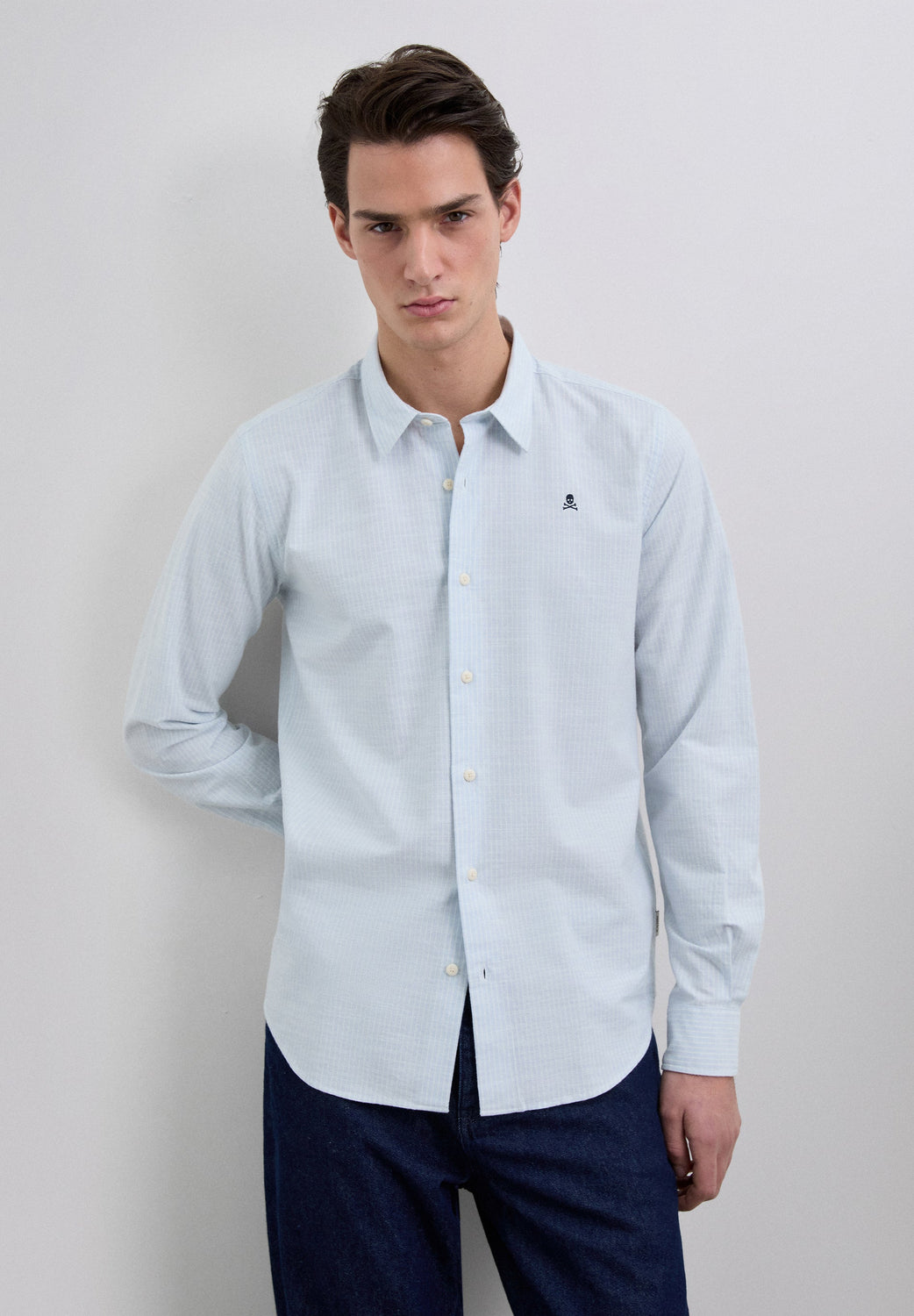 Camisa confeccionada en 100% algodón BCI. Regular Fit. Estampado de rayas. Manga larga. Cuello italiano. Cierre frontal y en puños mediante abotonadura. Detalle de calavera bordada a contraste en pecho.