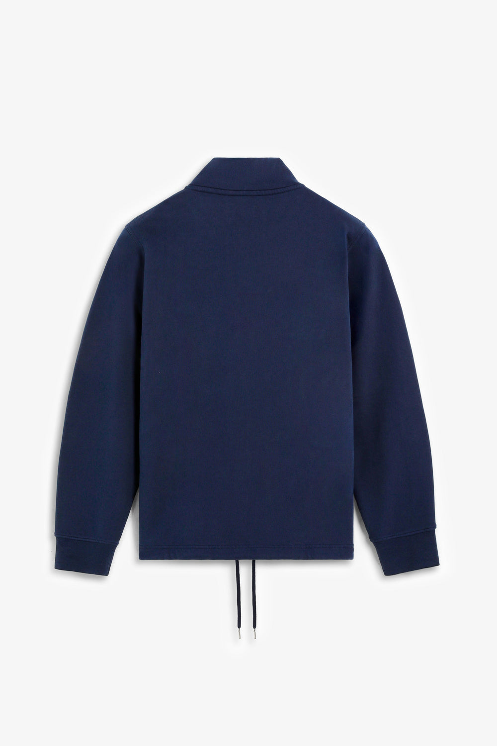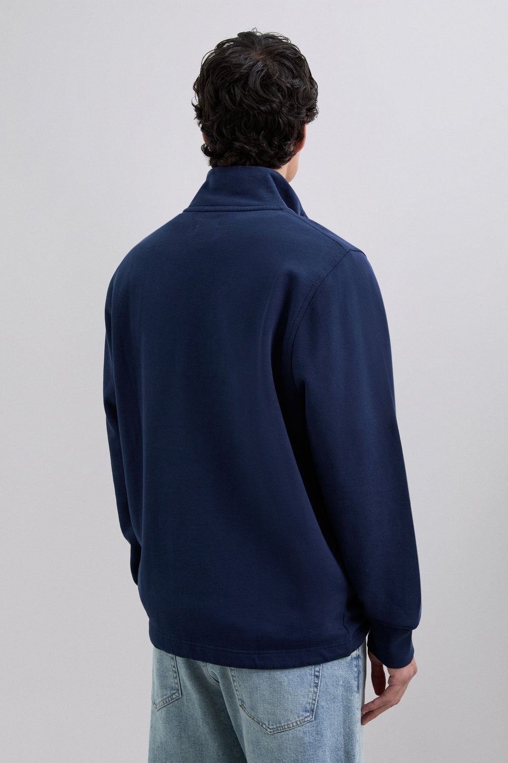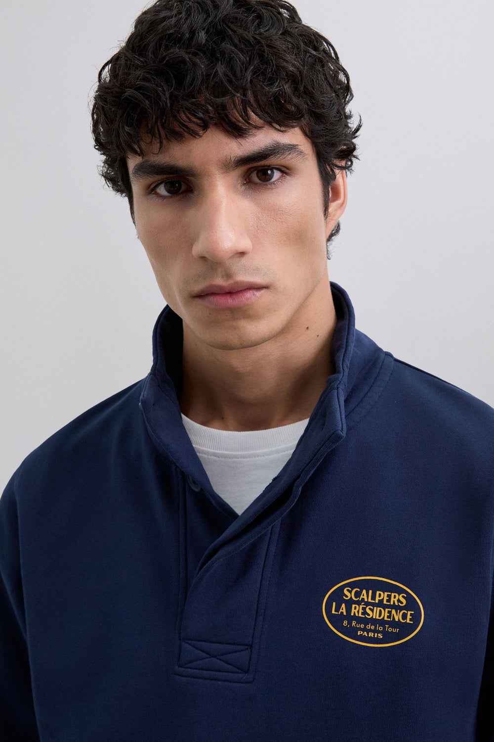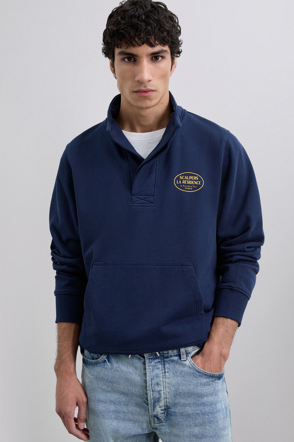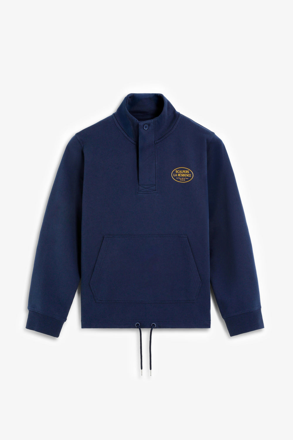 Sudadera confeccionada en 100% algodón BCI. Manga larga. Cuello alto y cierre mediante botón. Print con logo en pecho. Bolsillo frontal tipo canguro. Cierre ajustable mediante cordón en cintura.