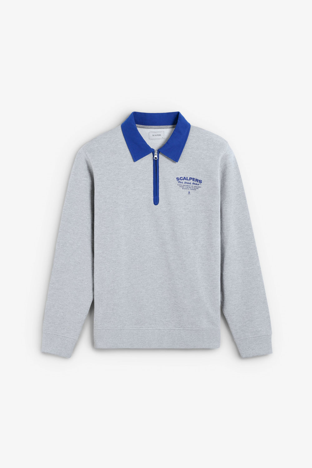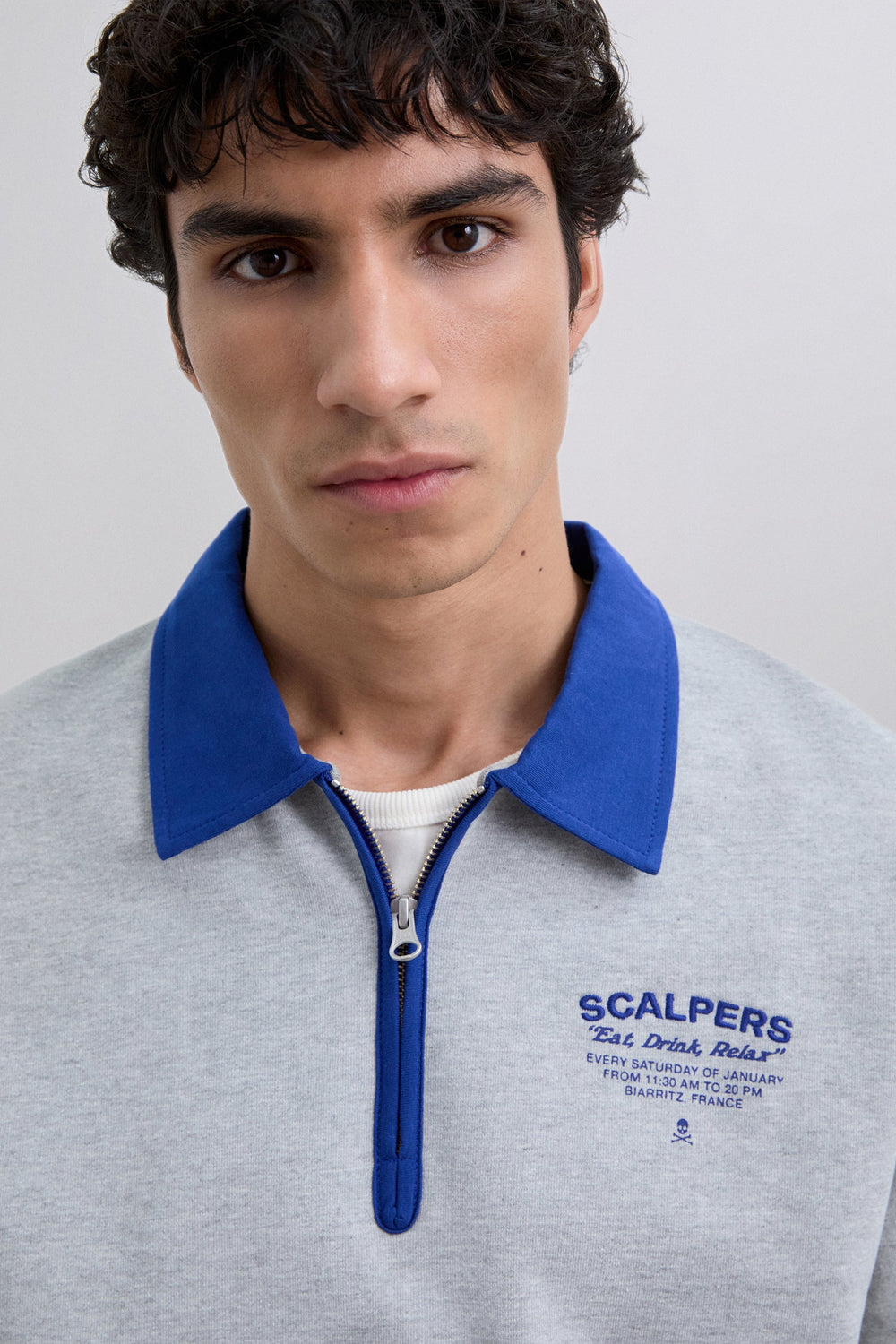 Sudadera confeccionada en 100% algodón BCI. Cuello polo con media cremallera. Corte Regular Fit. Manga larga. Detalle de logo y calavera bordados a contraste. Acabados en rib.