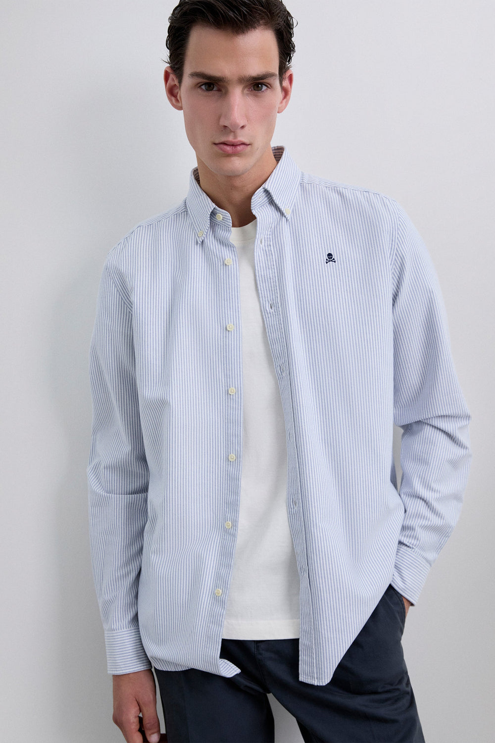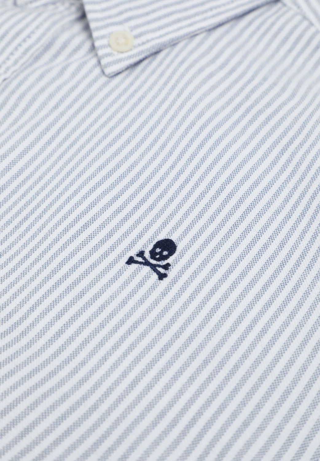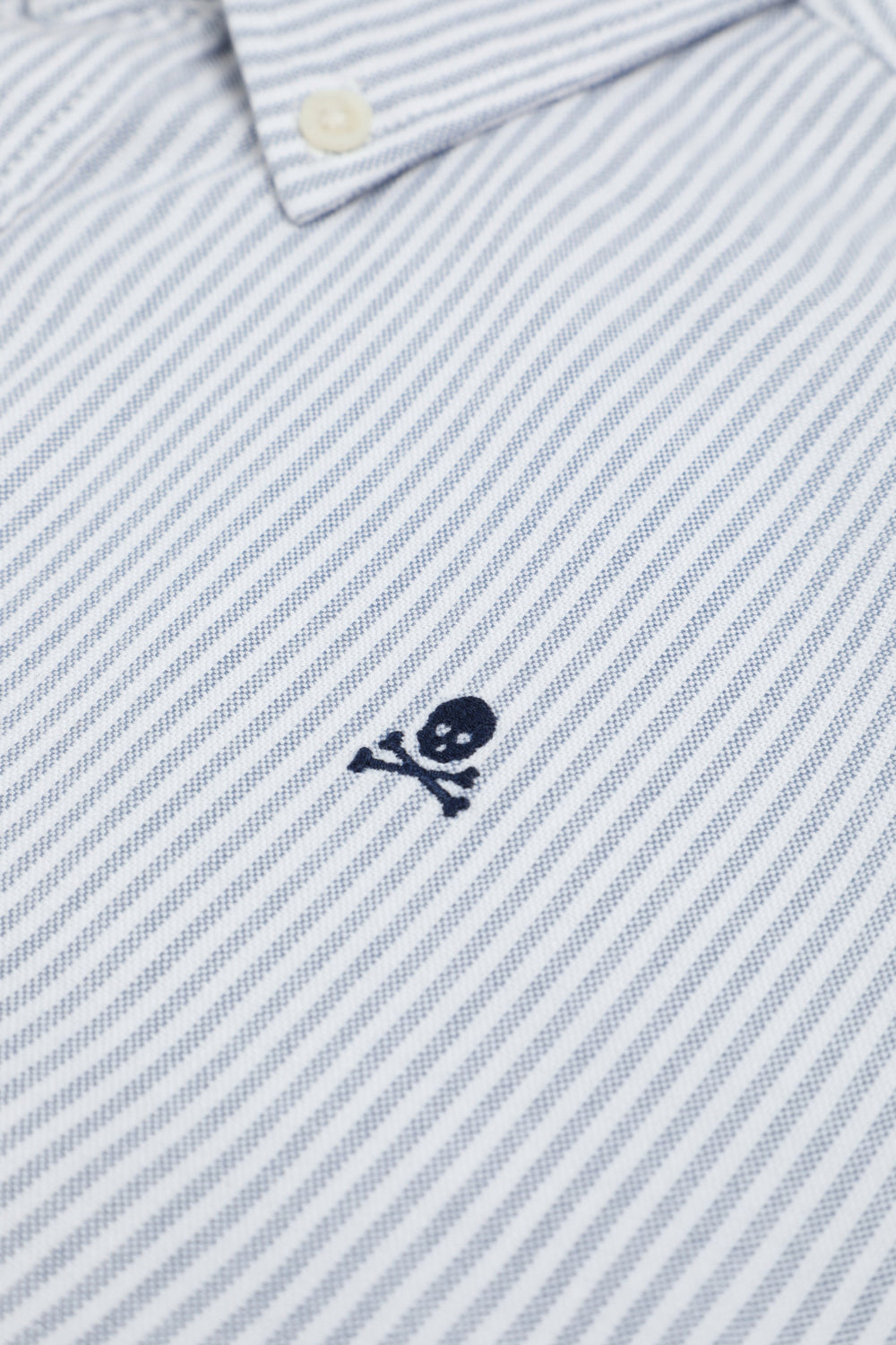 Camisa de rayas confeccionada en 100% algodón BCI. Cuello clásico, cierre con botones, regular fit, calavera en pecho a contraste. Acabado de botones en puño.