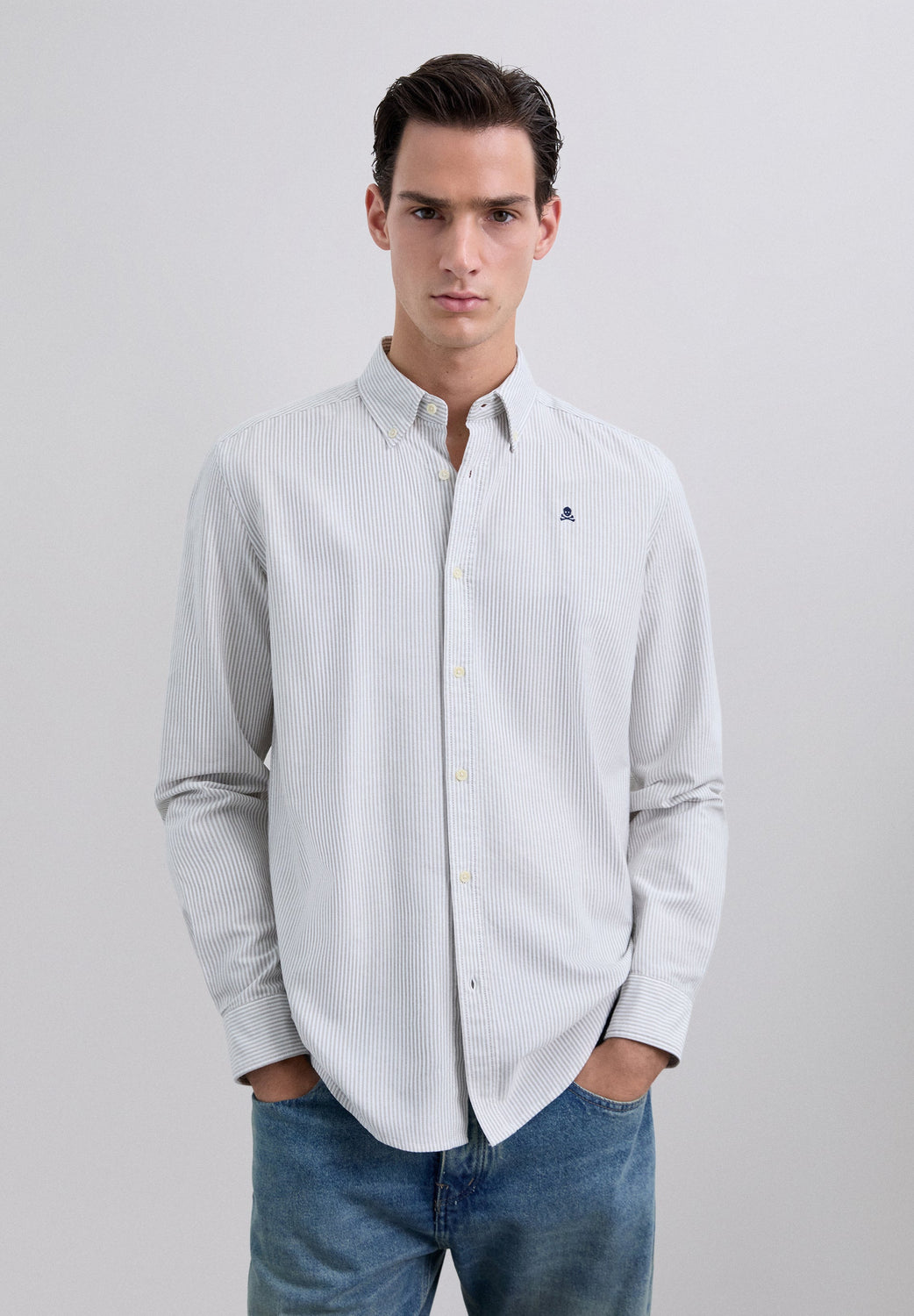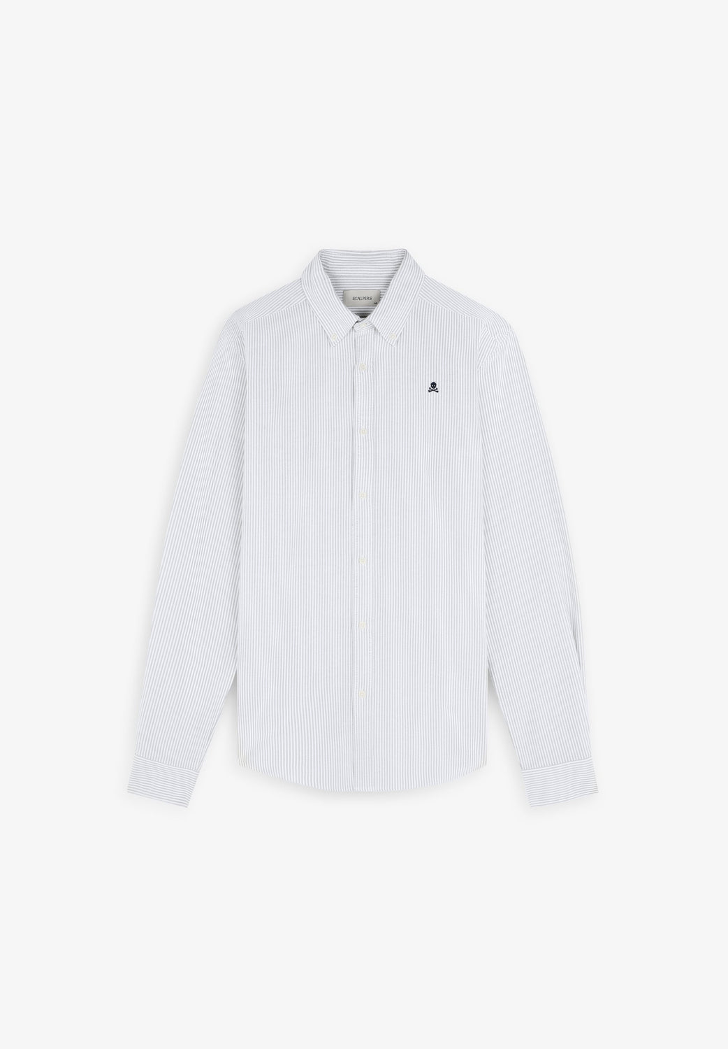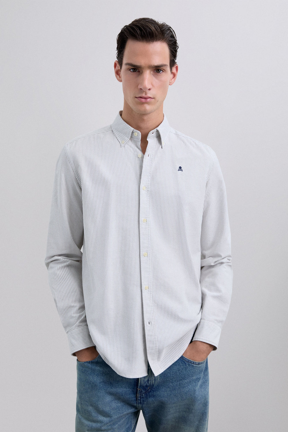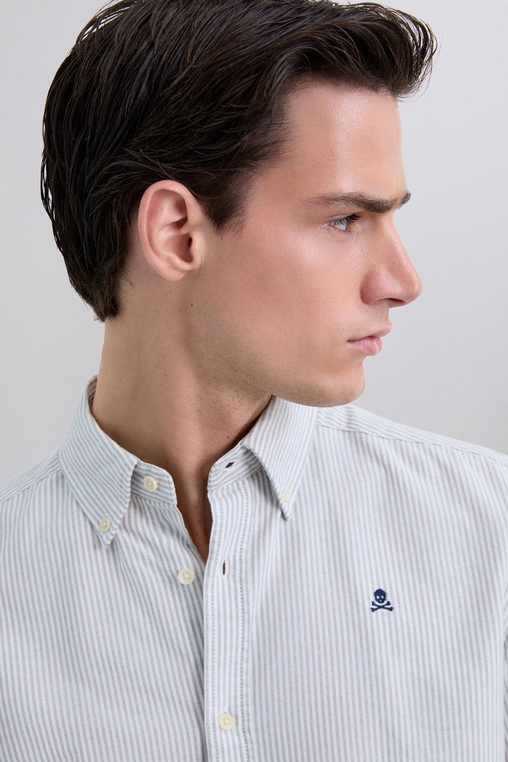 Camisa de rayas confeccionada en 100% algodón BCI. Cuello clásico, cierre con botones, regular fit, calavera en pecho a contraste. Acabado de botones en puño.