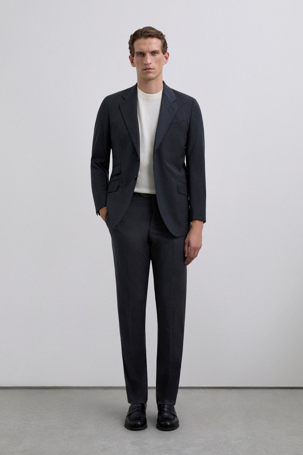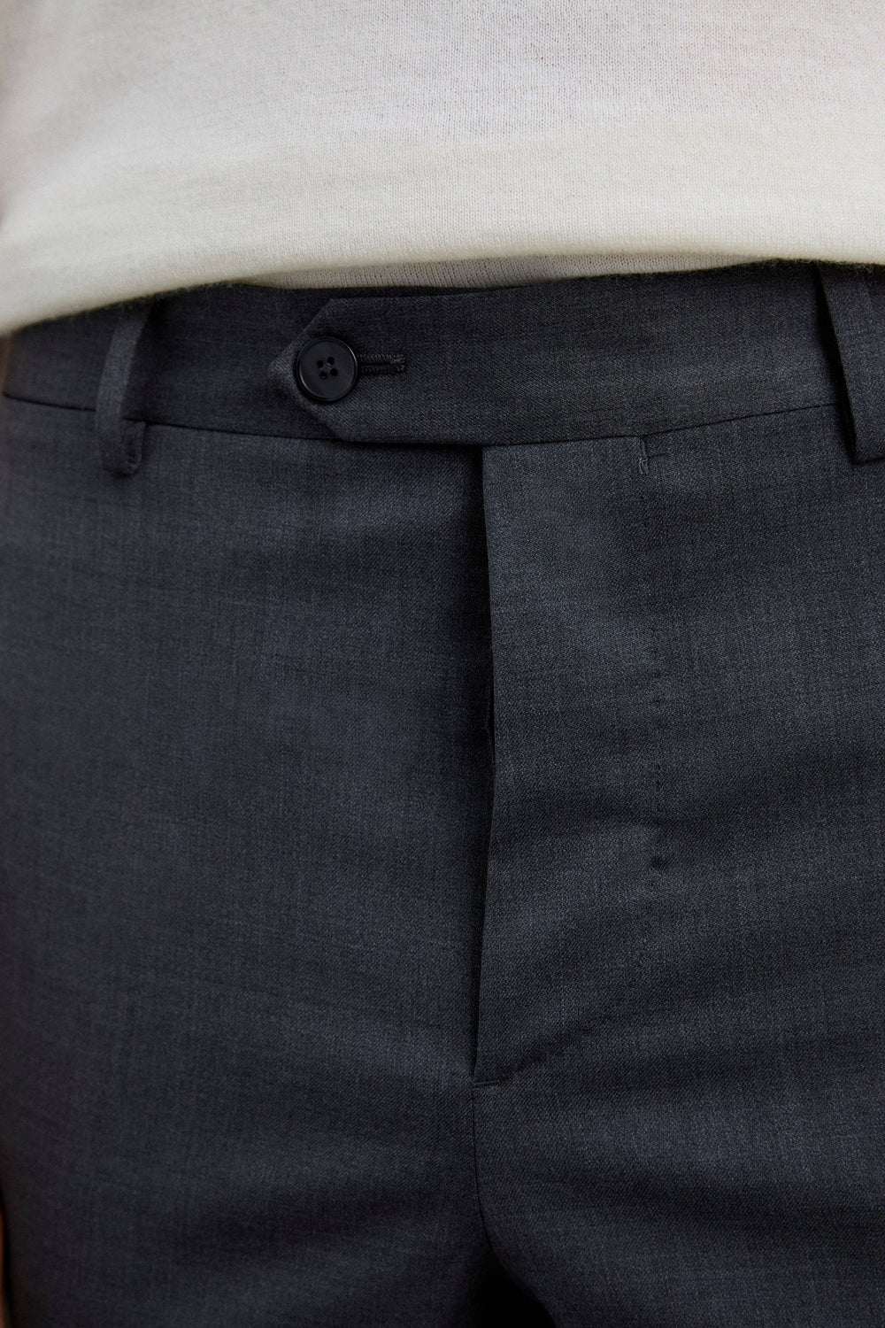Pantalón de vestir con pinzas confeccionado en mezcla de lana ligeramente elástica. Cierre de cremallera oculta y botón en cintura prolongada con trabillas. Bolsillos inclinados delanteros y traseros de vivo con botón.