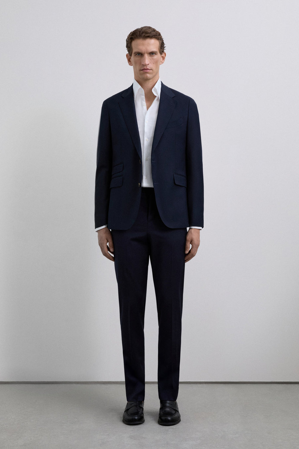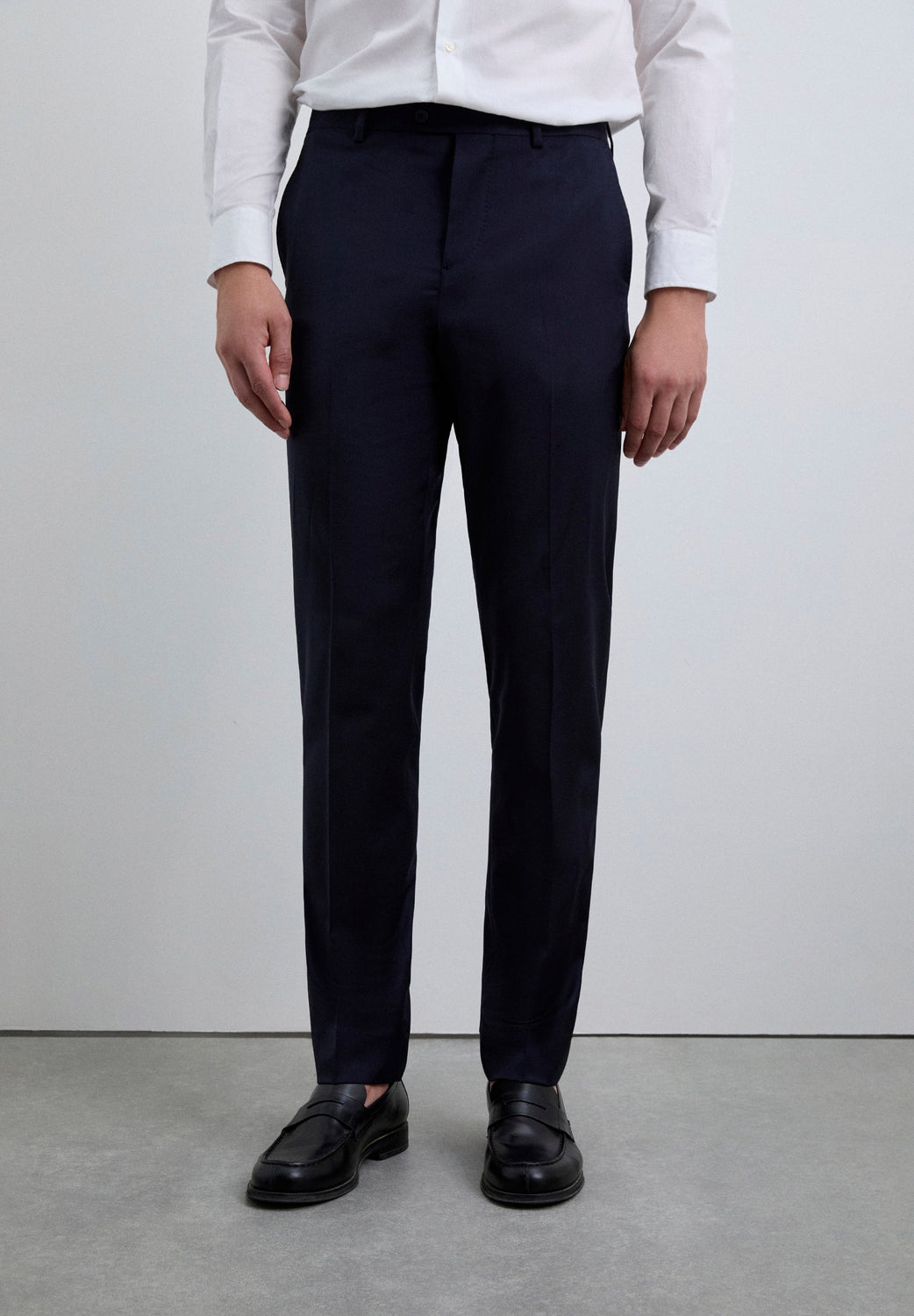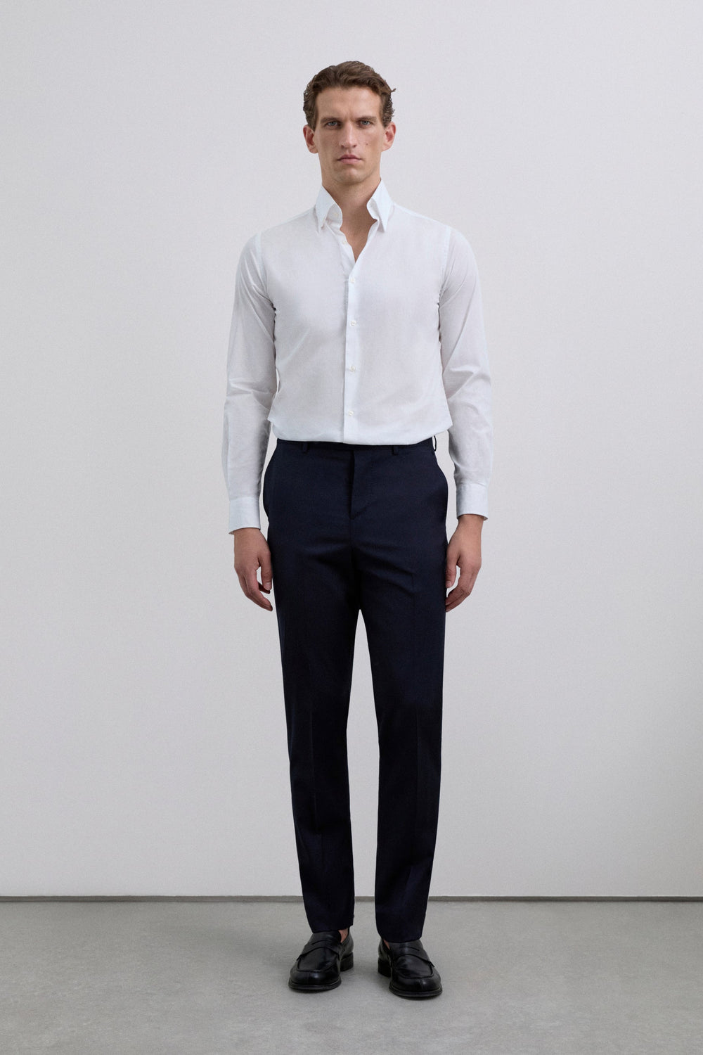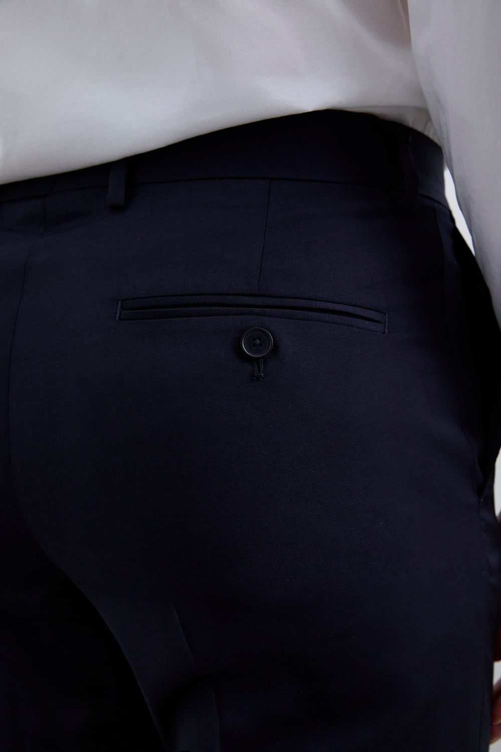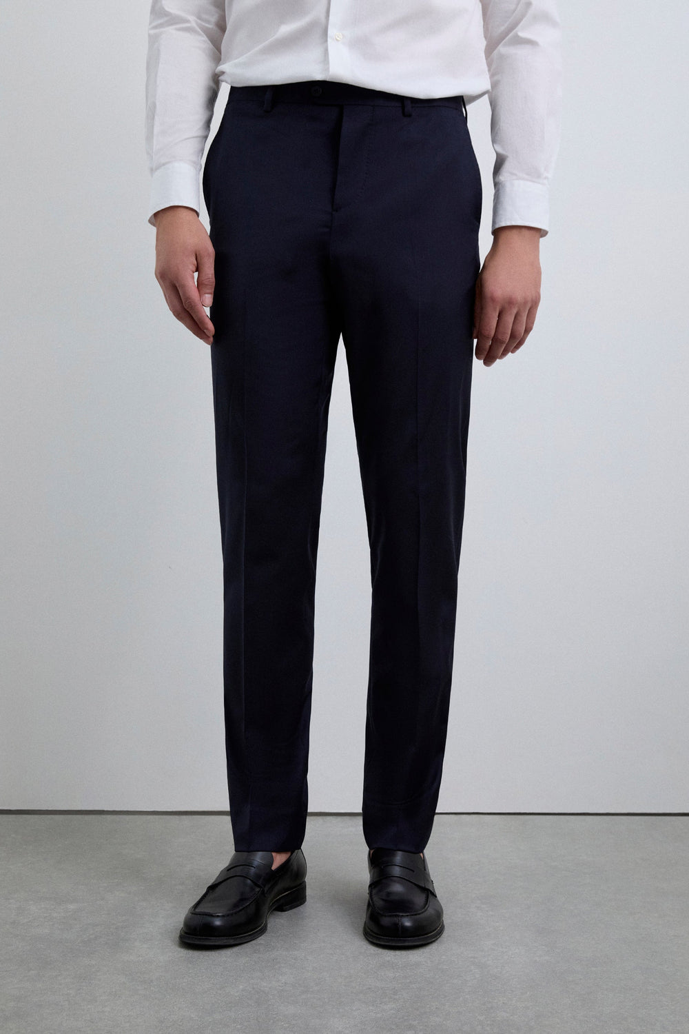 Pantalón de vestir con pinzas confeccionado en mezcla de lana ligeramente elástica. Cierre de cremallera oculta y botón en cintura prolongada con trabillas. Bolsillos inclinados delanteros y traseros de vivo con botón.