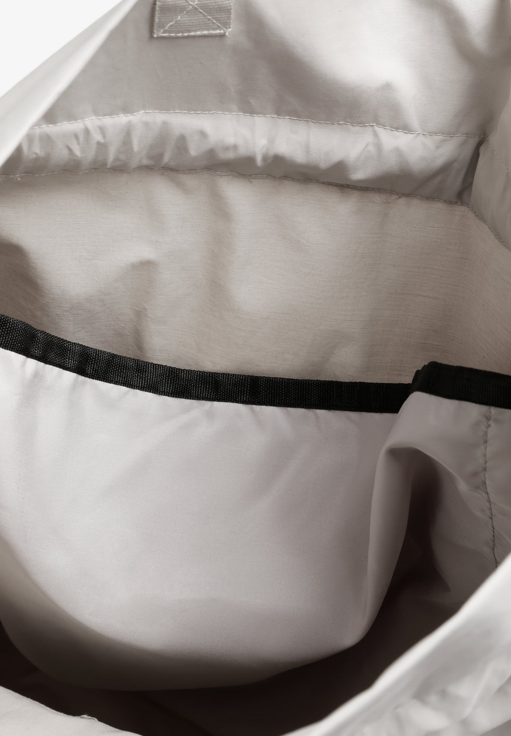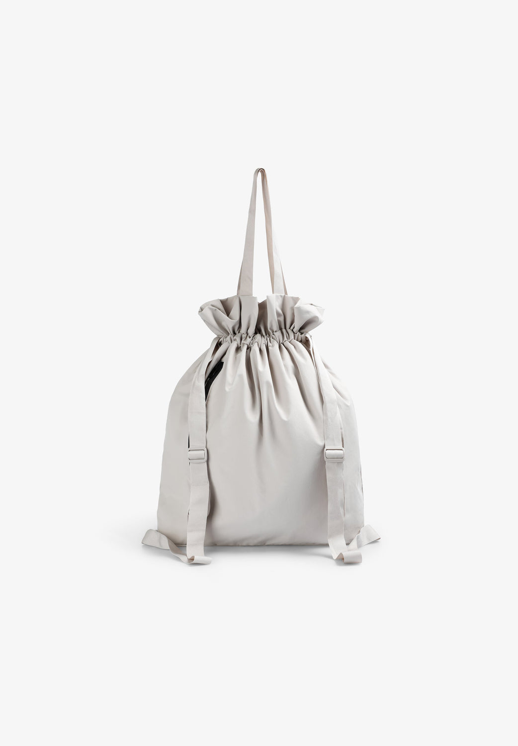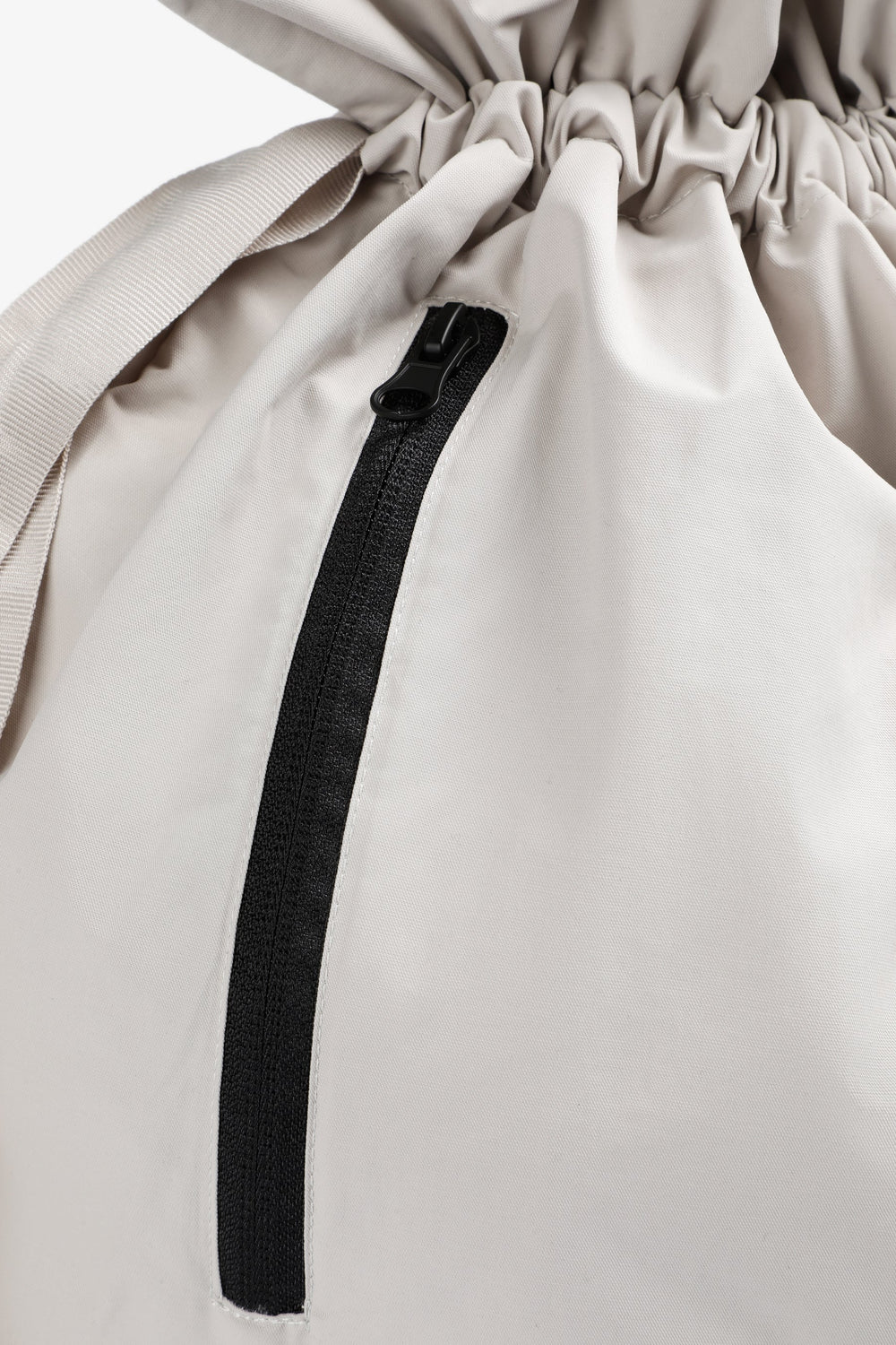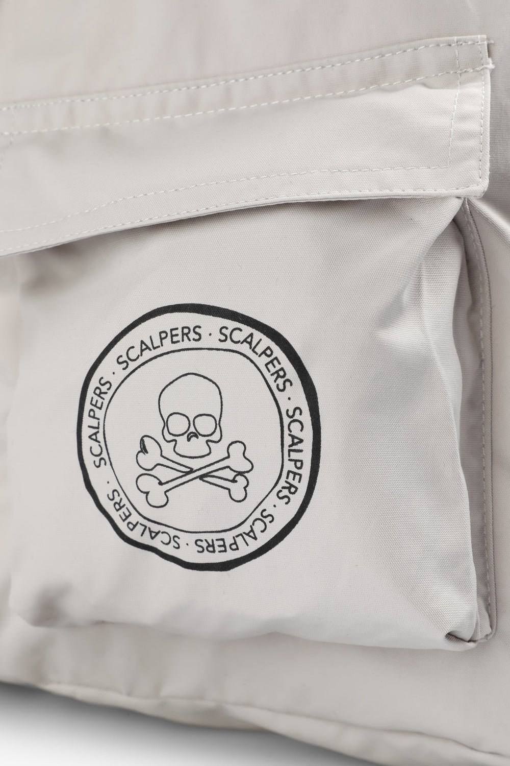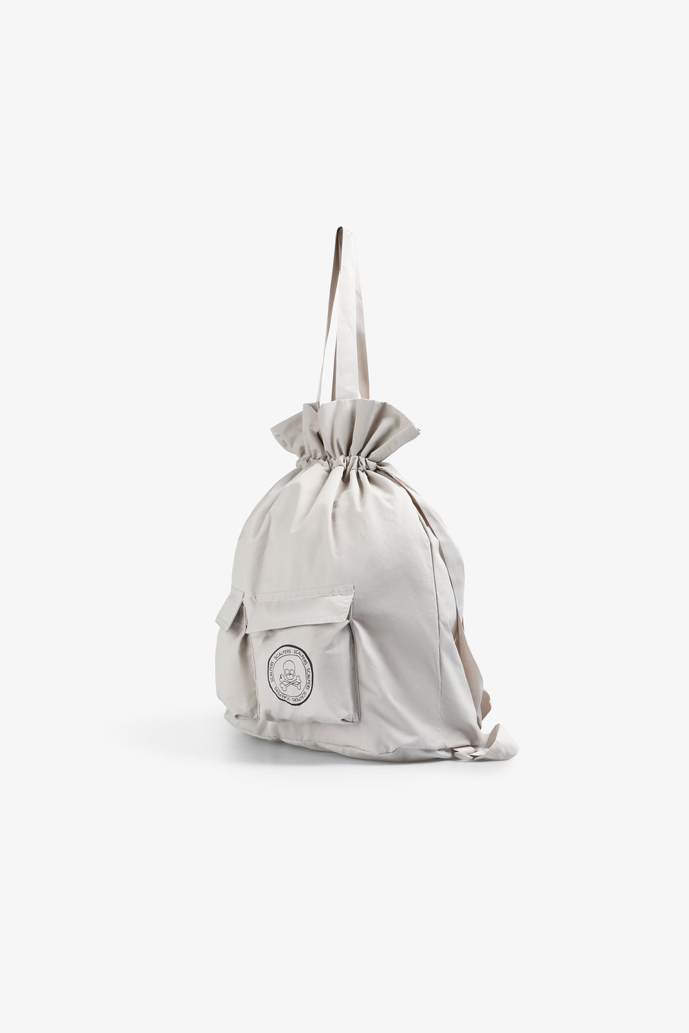 Mochila ligera con cierre en nudo. Doble asa ajustable. Dos bolsillos frontales con tapeta. Print con calavera en bolsillo. Detalle cremallera lateral a contraste.