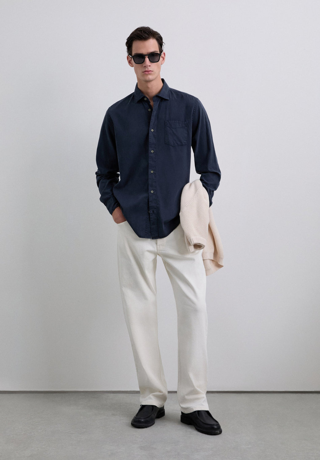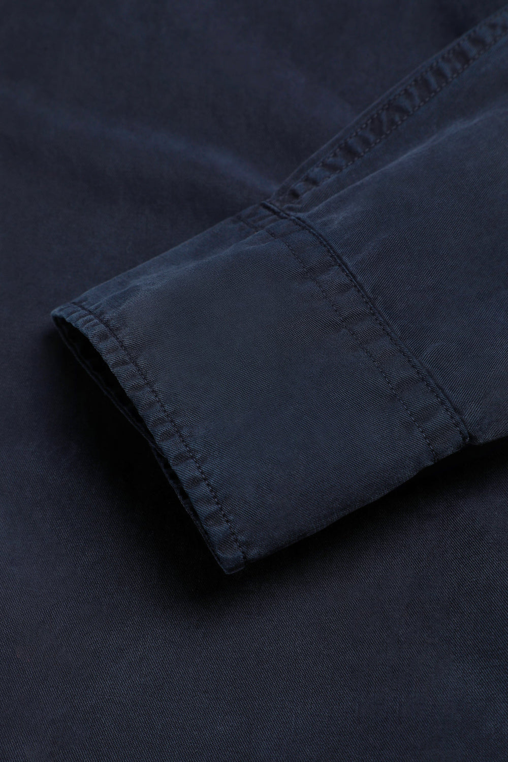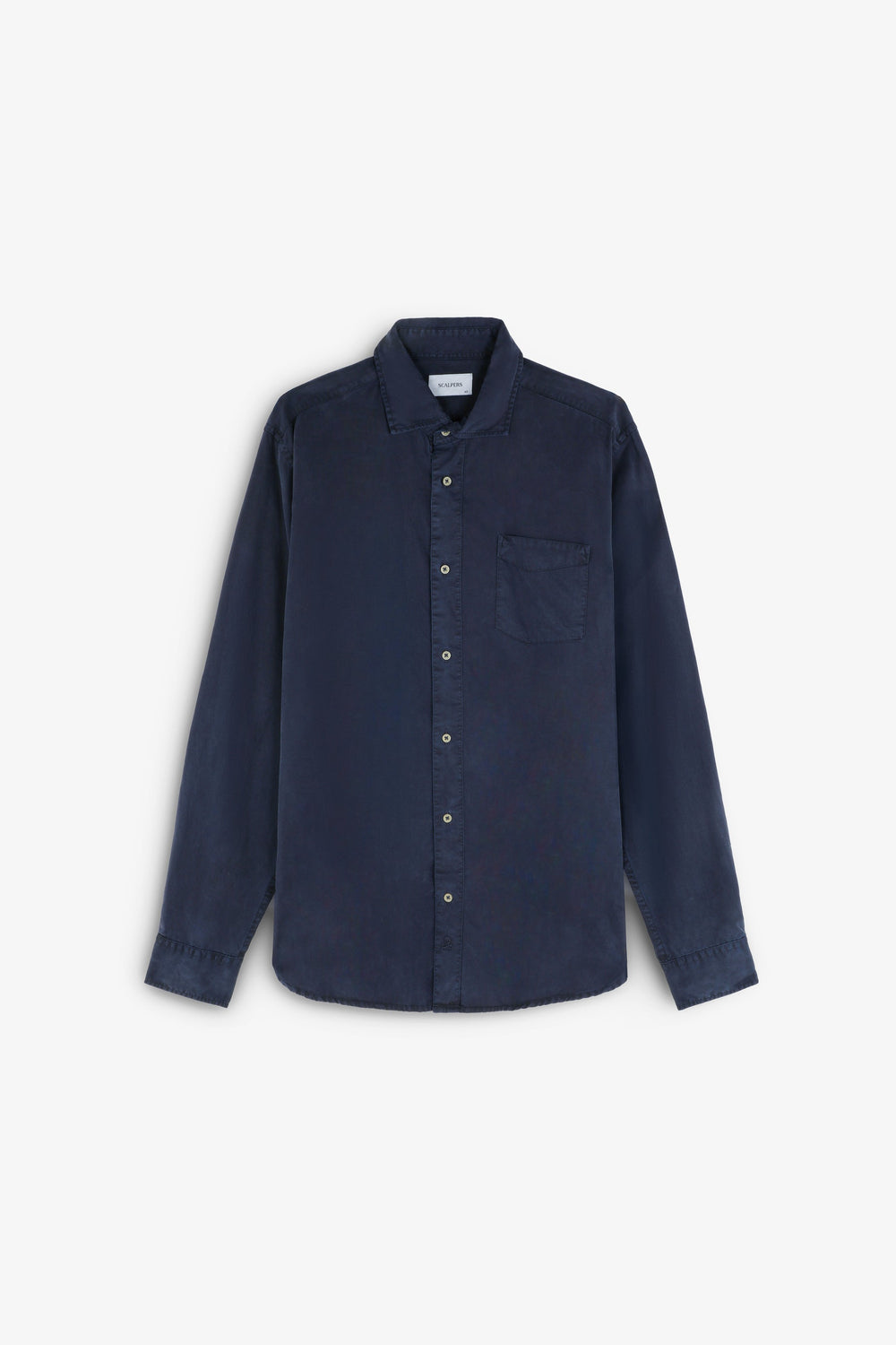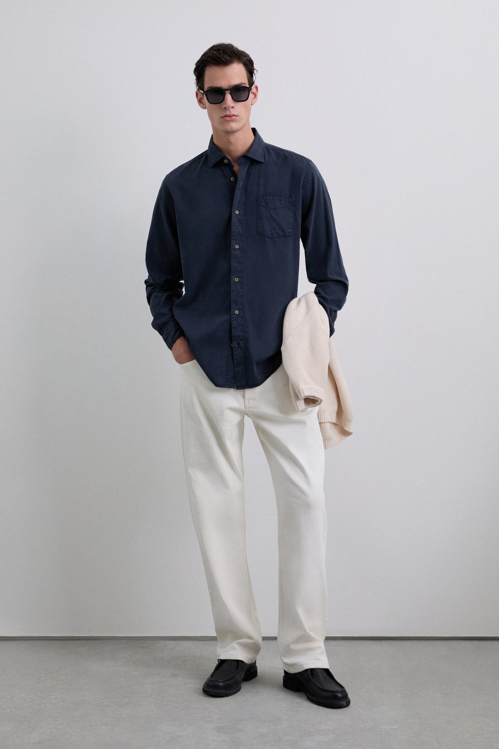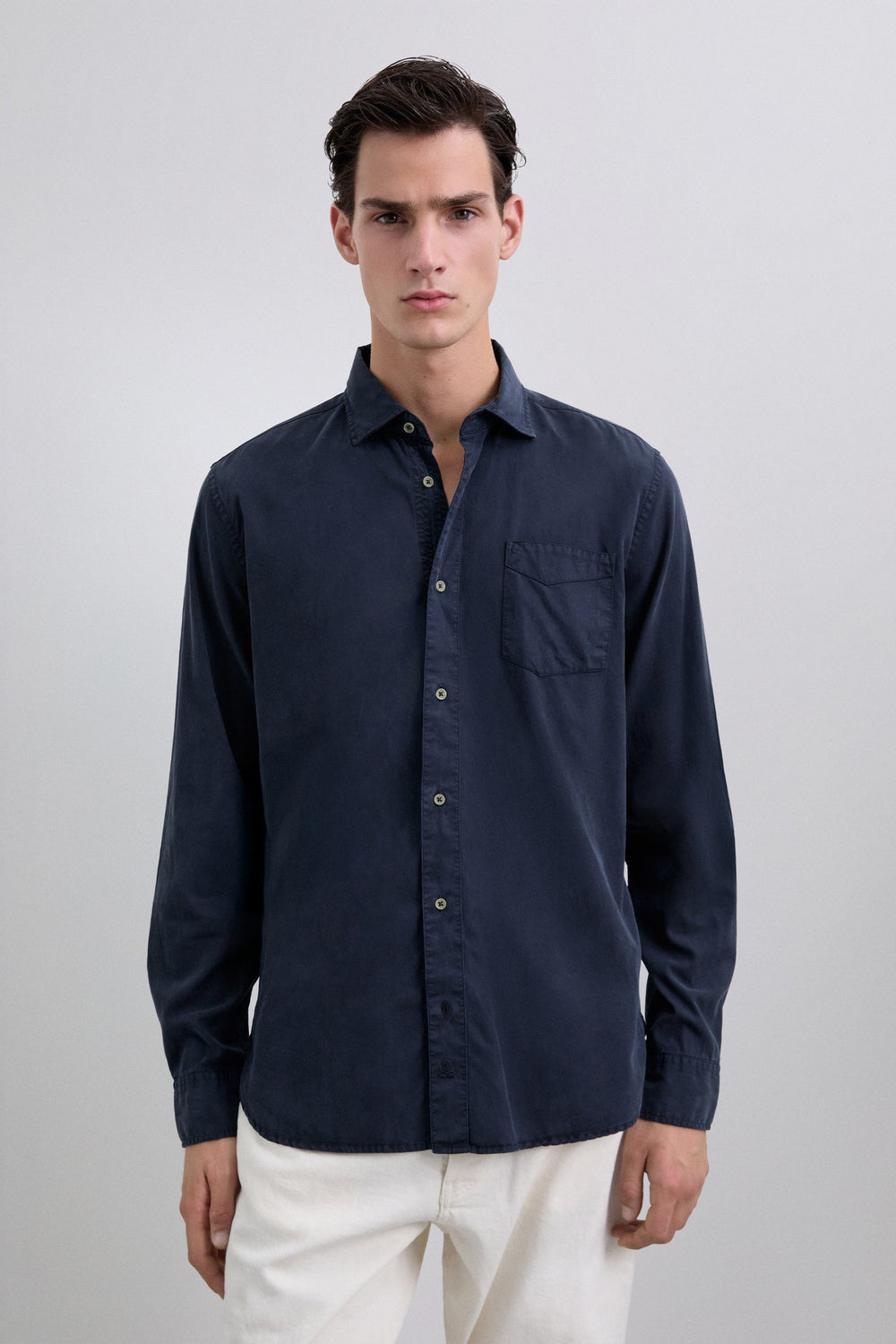 Camisa con calavera bordada a tono en la parte frontal. Corte Regular fit. Cuello con botones. Manga larga terminada en puño con botones. Cierre frontal con botones. Bolsillo tipo parche en pecho.