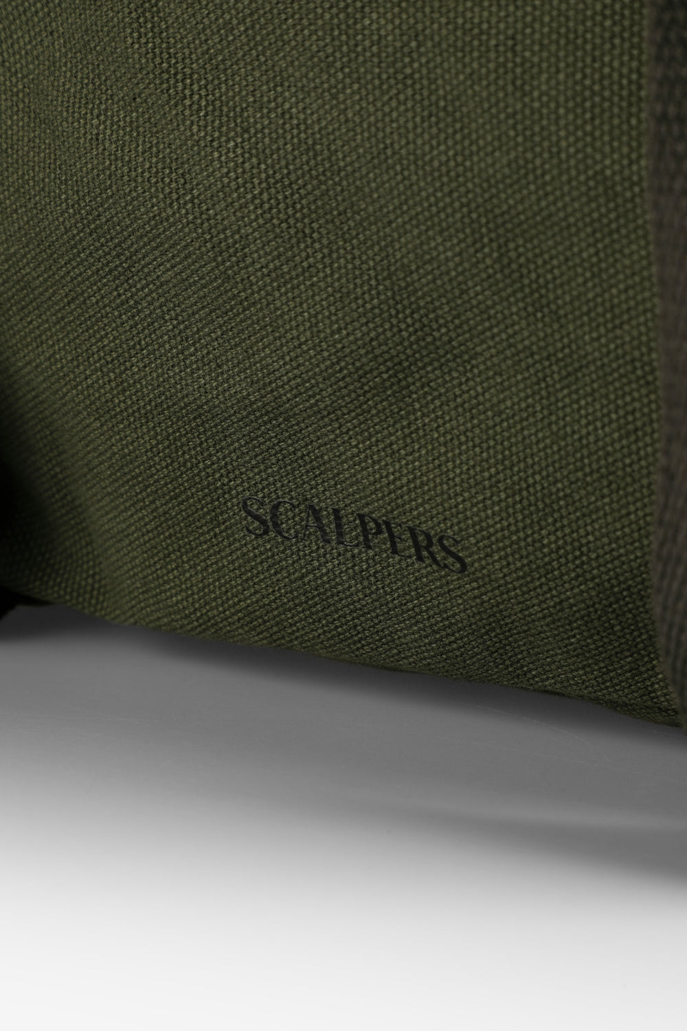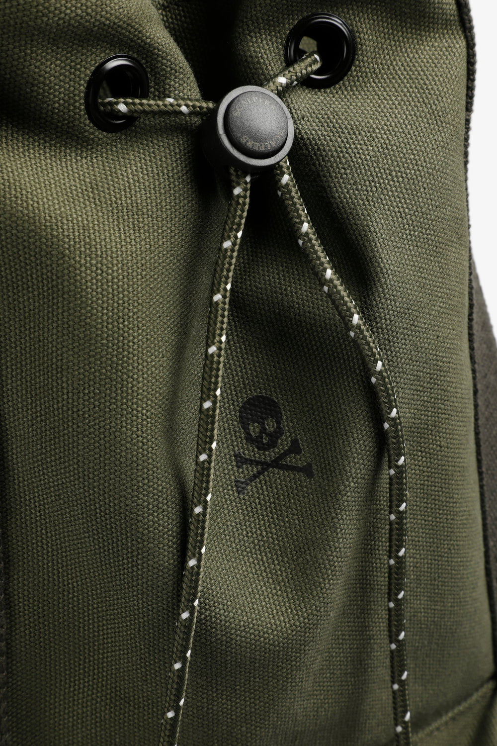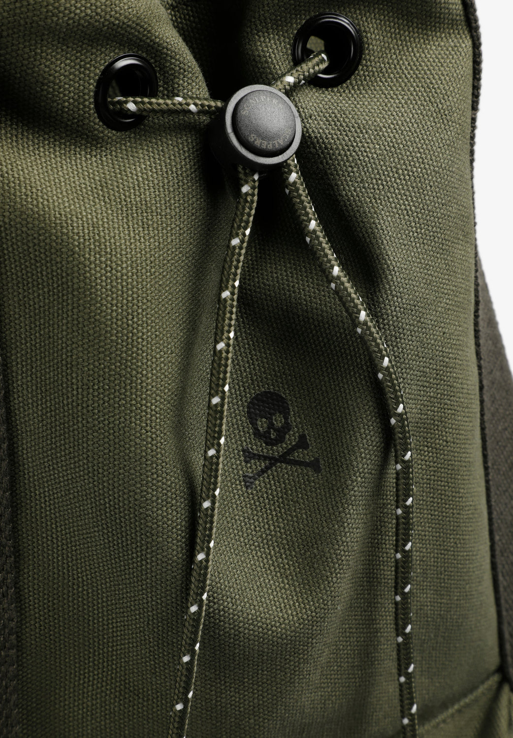 Bolsa confeccionada en 100% algodón. Doble asa. Cremallera ajustable, bolsillo interior y bolsillo exterior con fuelle. Detalle de calavera y logo a contraste.