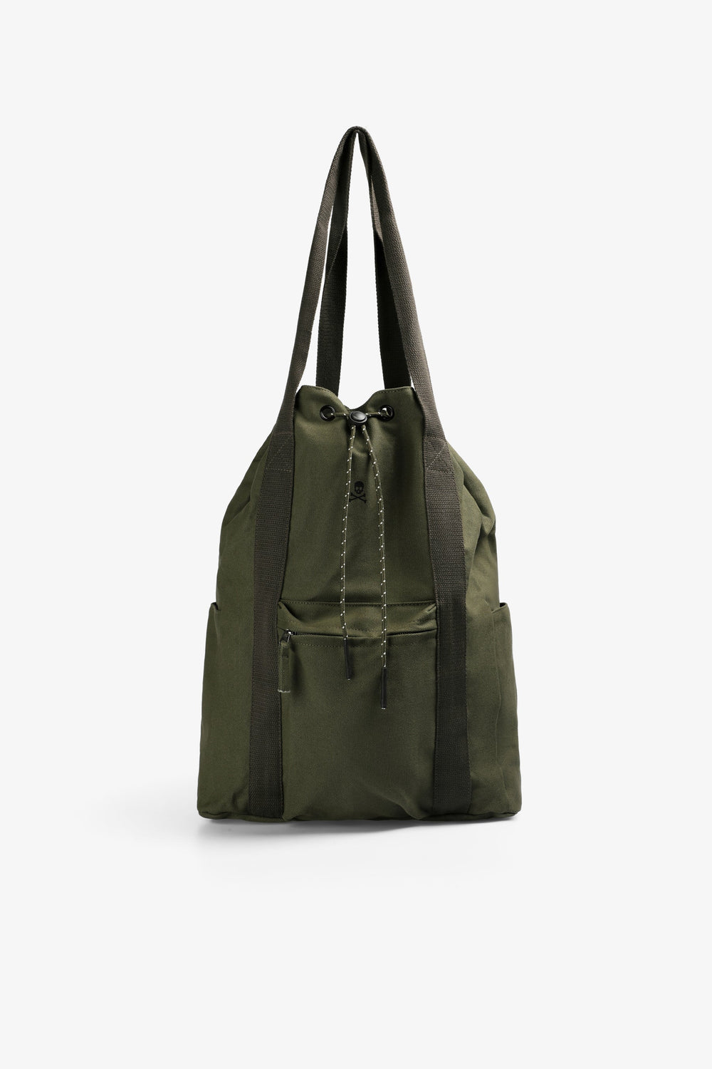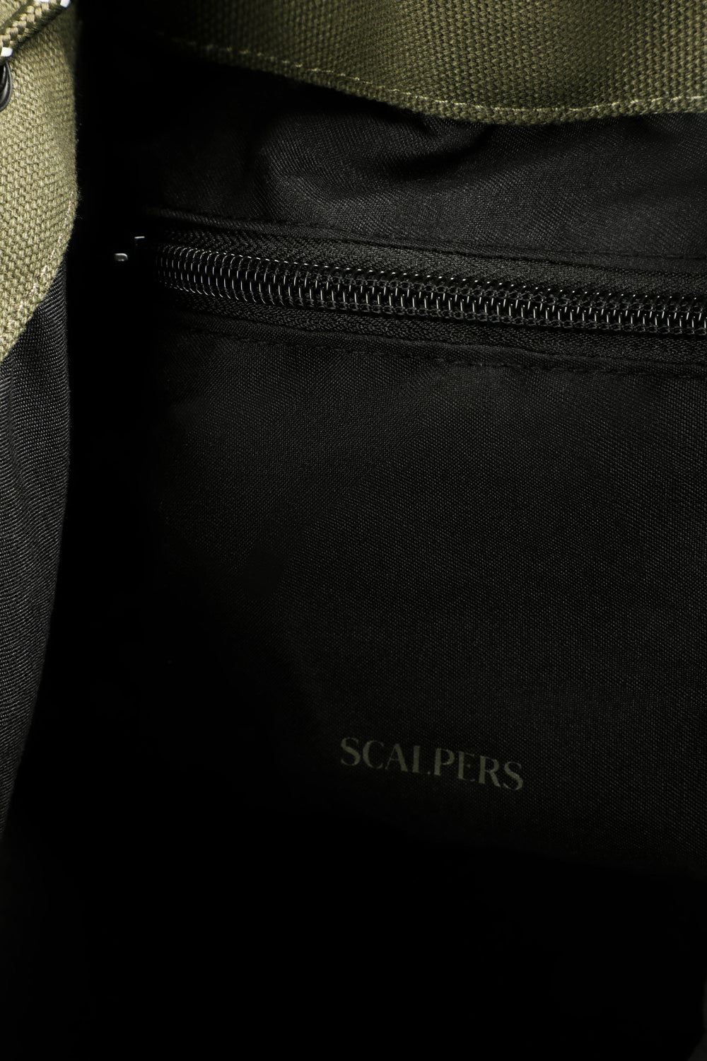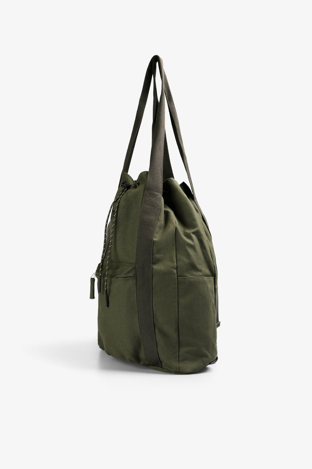Bolsa confeccionada en 100% algodón. Doble asa. Cremallera ajustable, bolsillo interior y bolsillo exterior con fuelle. Detalle de calavera y logo a contraste.