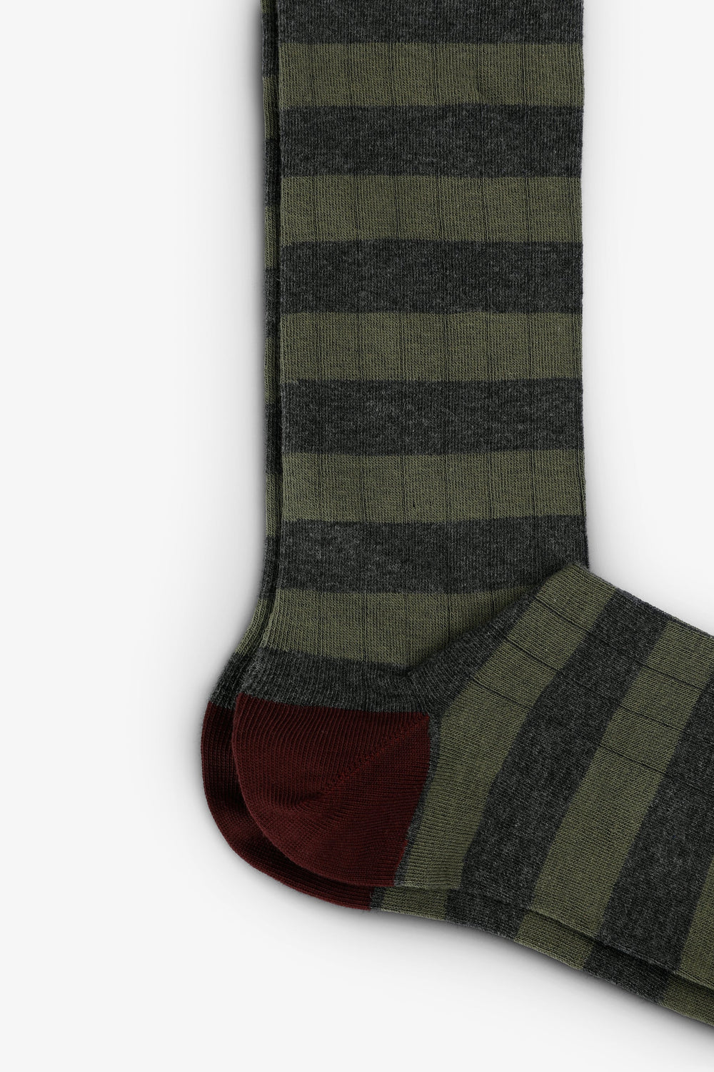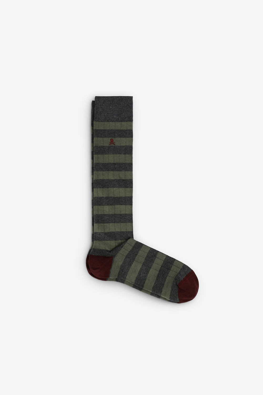 Calcetines confeccionados en mezcla de algodón orgánico. Estampado de rayas. Detalle de calavera bordada a contraste. Alto: 36cm / Largo pie: 23cm.