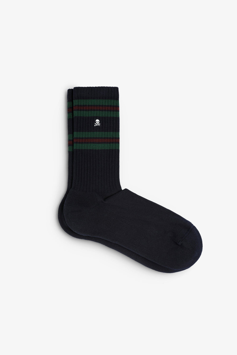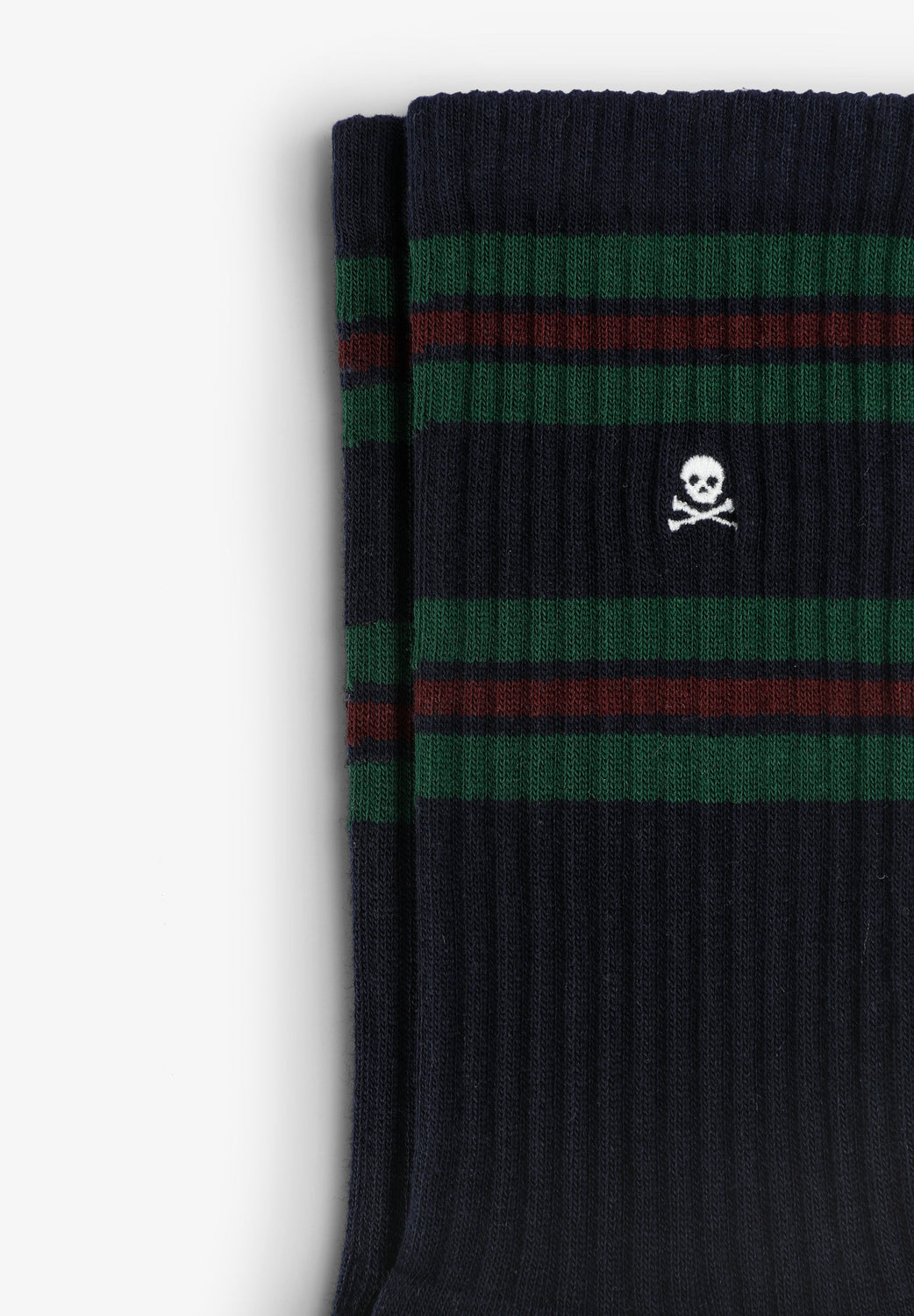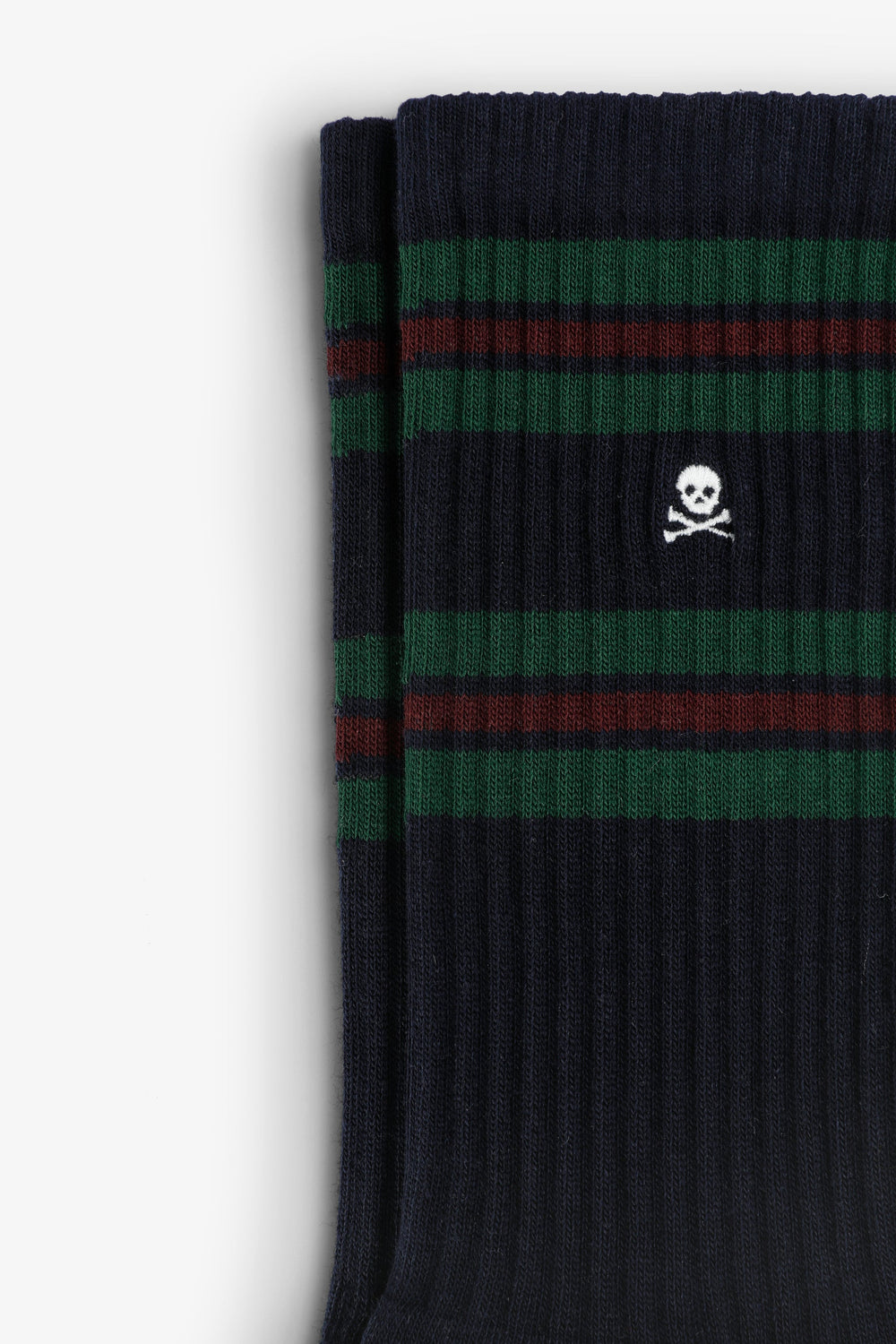 Calcetines confeccionados en mezcla de algodón orgánico. Detalle de rayas. Detalle de calavera bordada a contraste.