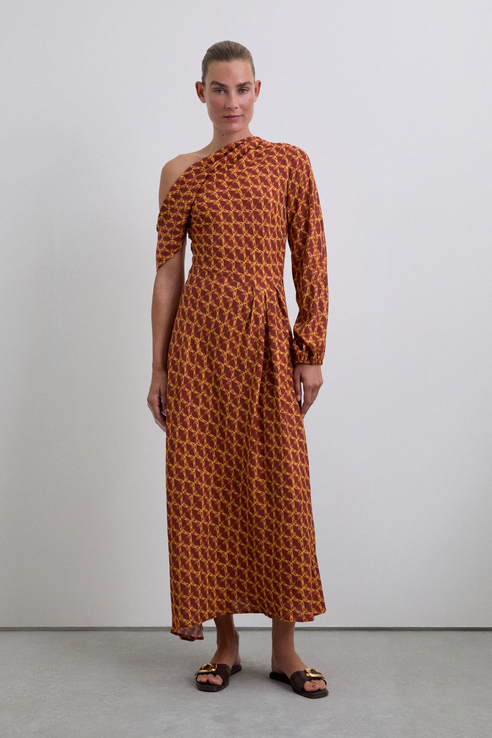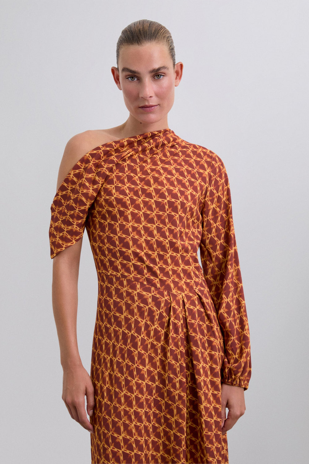 Vestido print con manga larga y corta abullonada con puño elástico. Escote asimétrico. Un hombro descubierto. Slim fit.