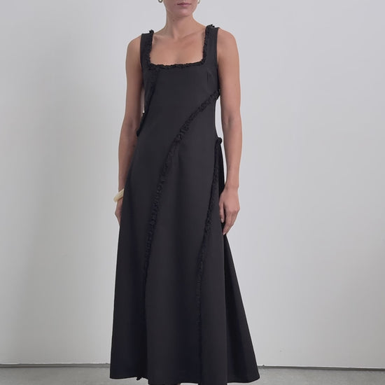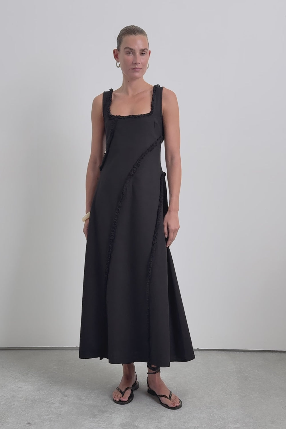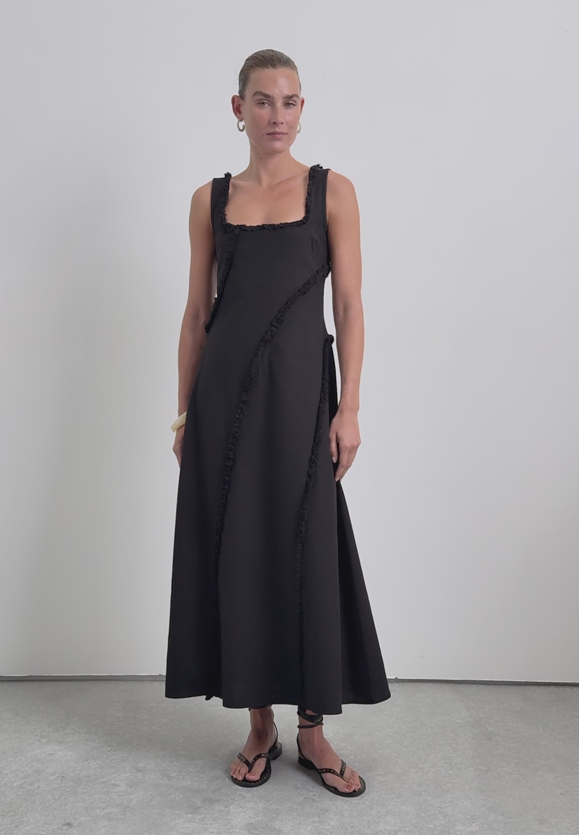 Vestido midi confeccionado en 100% Algodón Orgánico BCI. Tirantes. Escote cuadrado. Detalle de flecos despuntados.