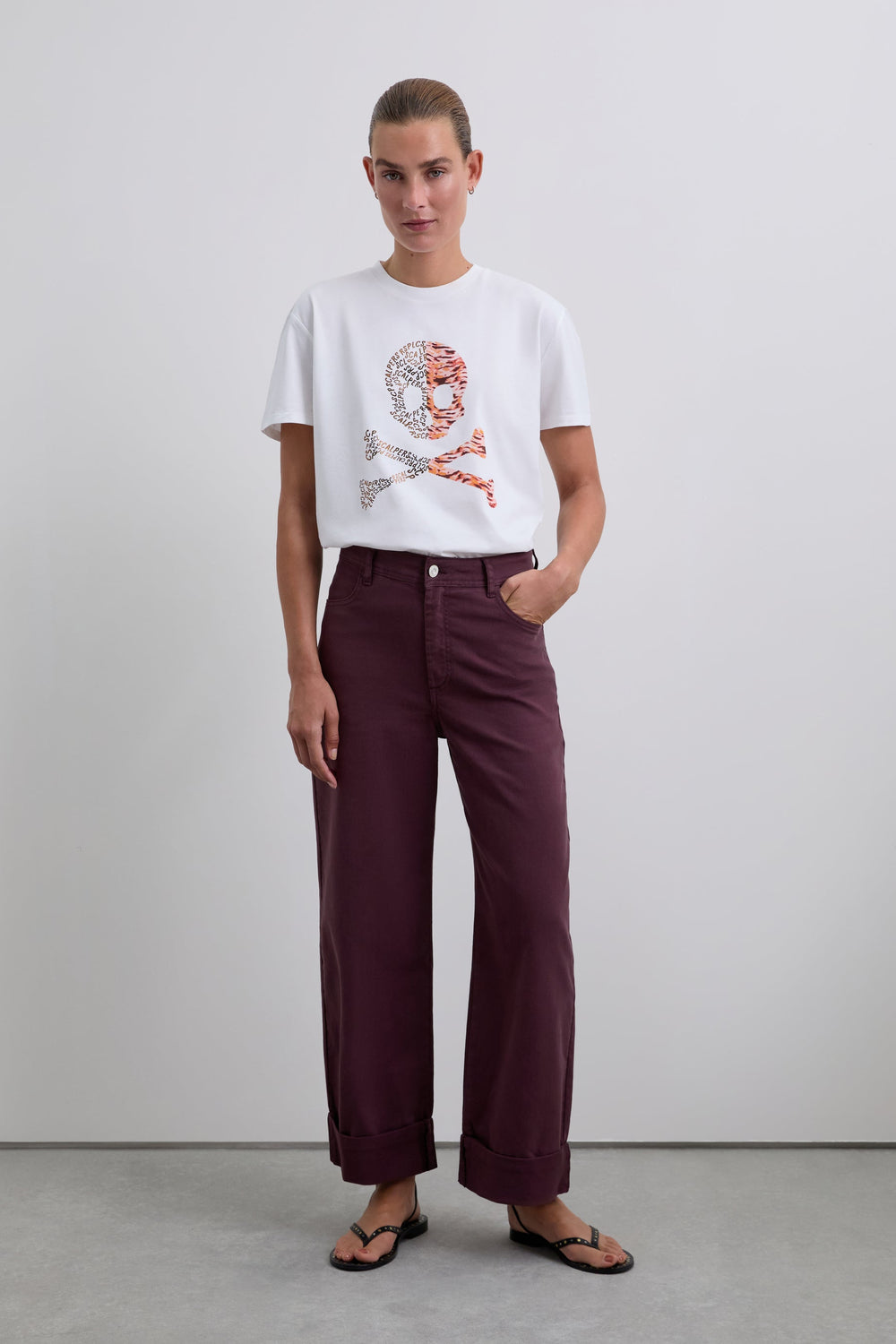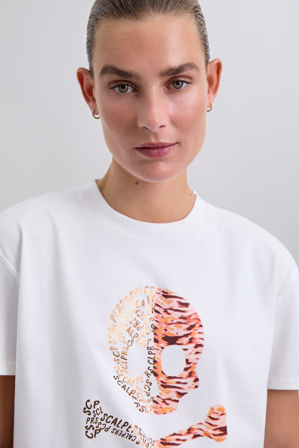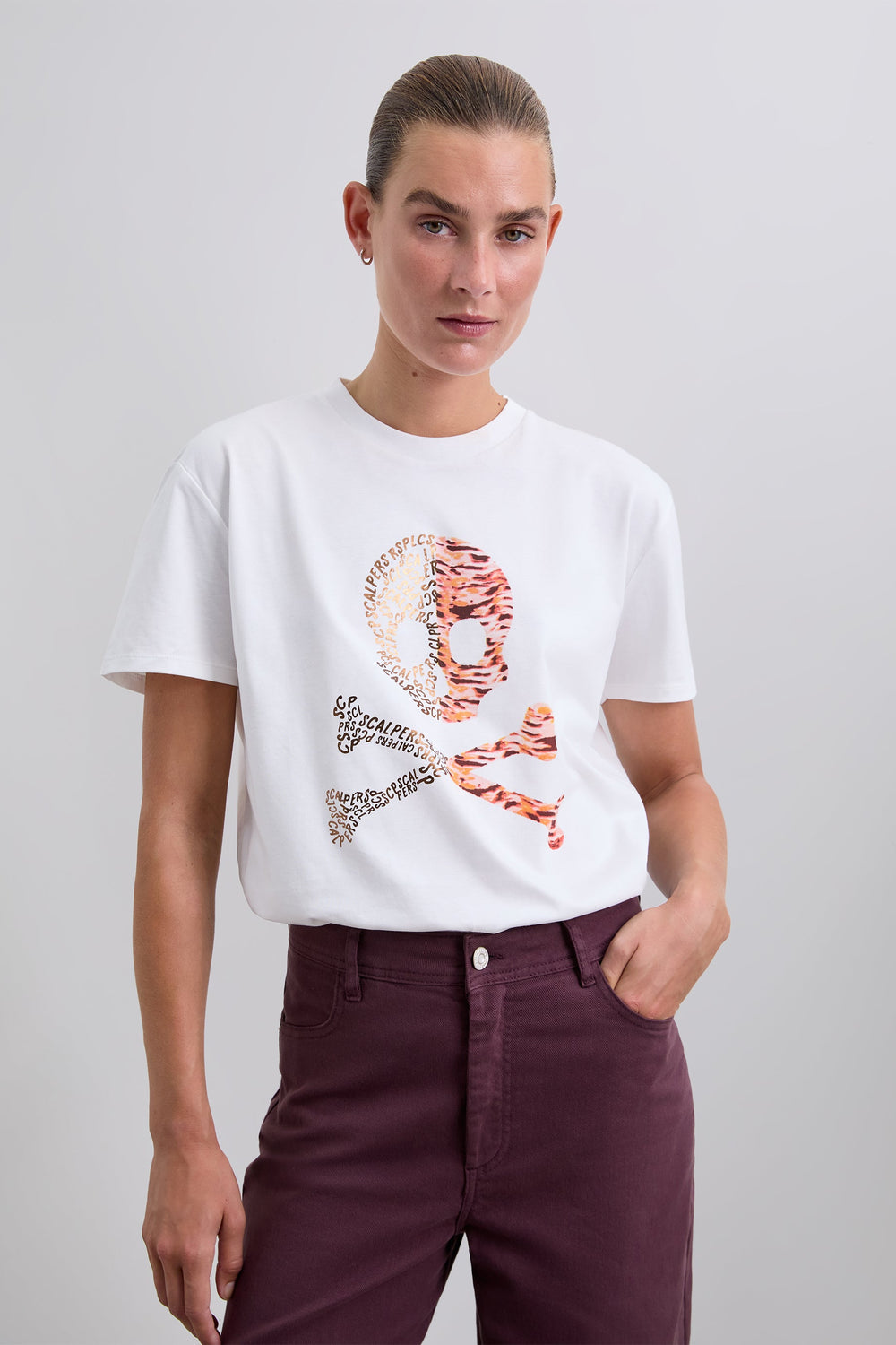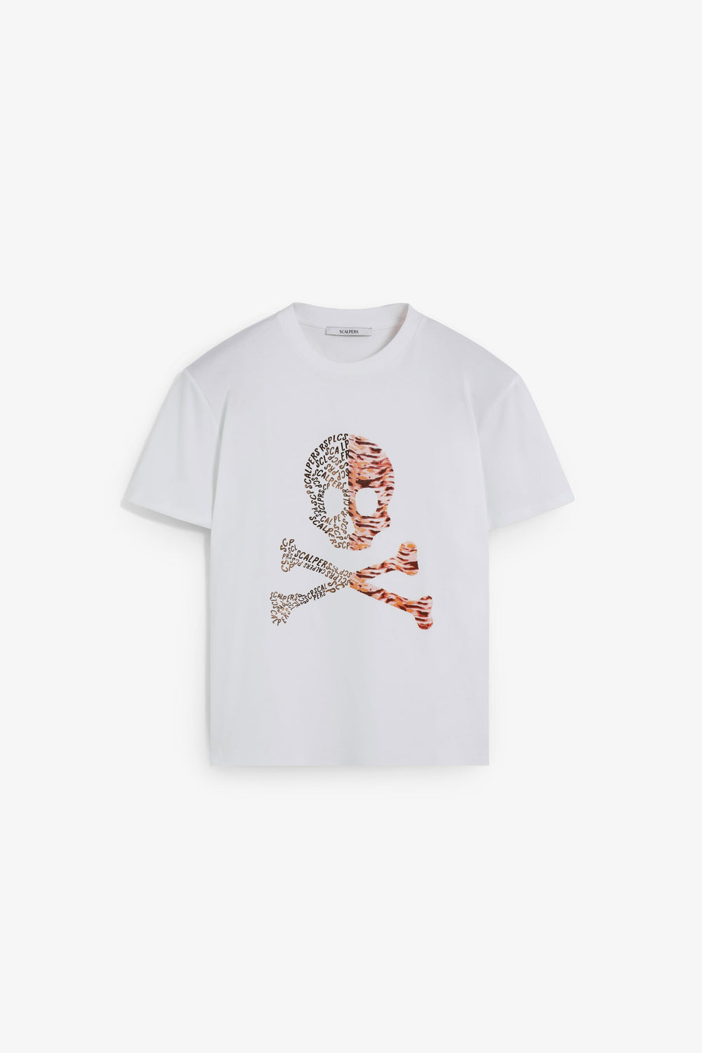 Camiseta confeccionada en 100% algodón BCI con print de calavera, mitad letras y animal print. Corte regular fit, cuello redondo y manga corta.