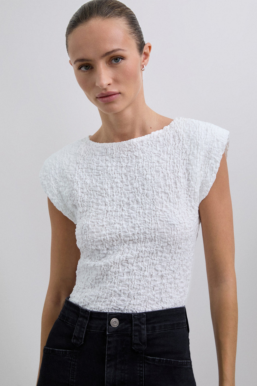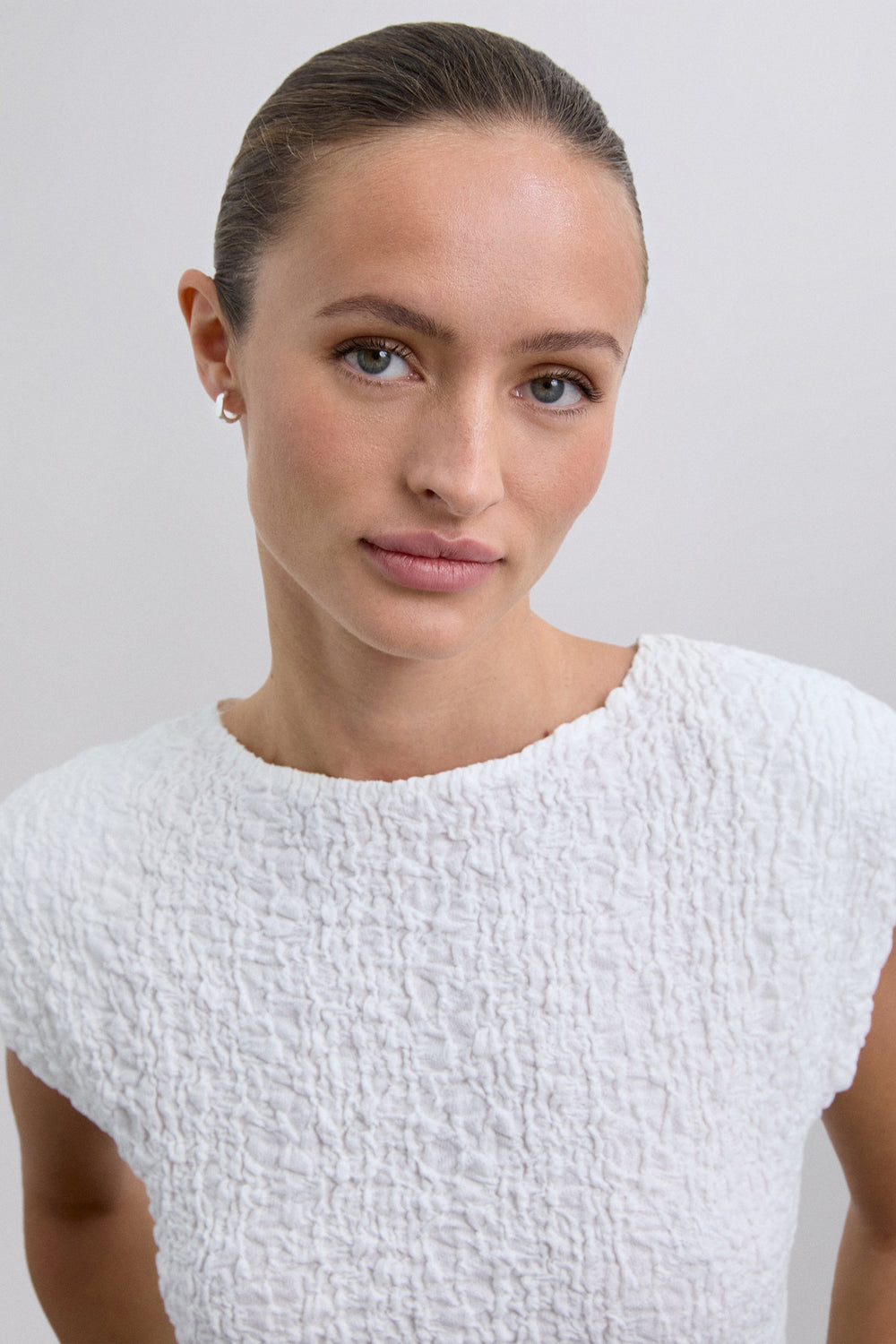 Camiseta confeccionada en mezcla de algodón ligeramente elástica con textura crinkle. Corte sim fit, cuello redondo y manga corta con ligera hombrera.