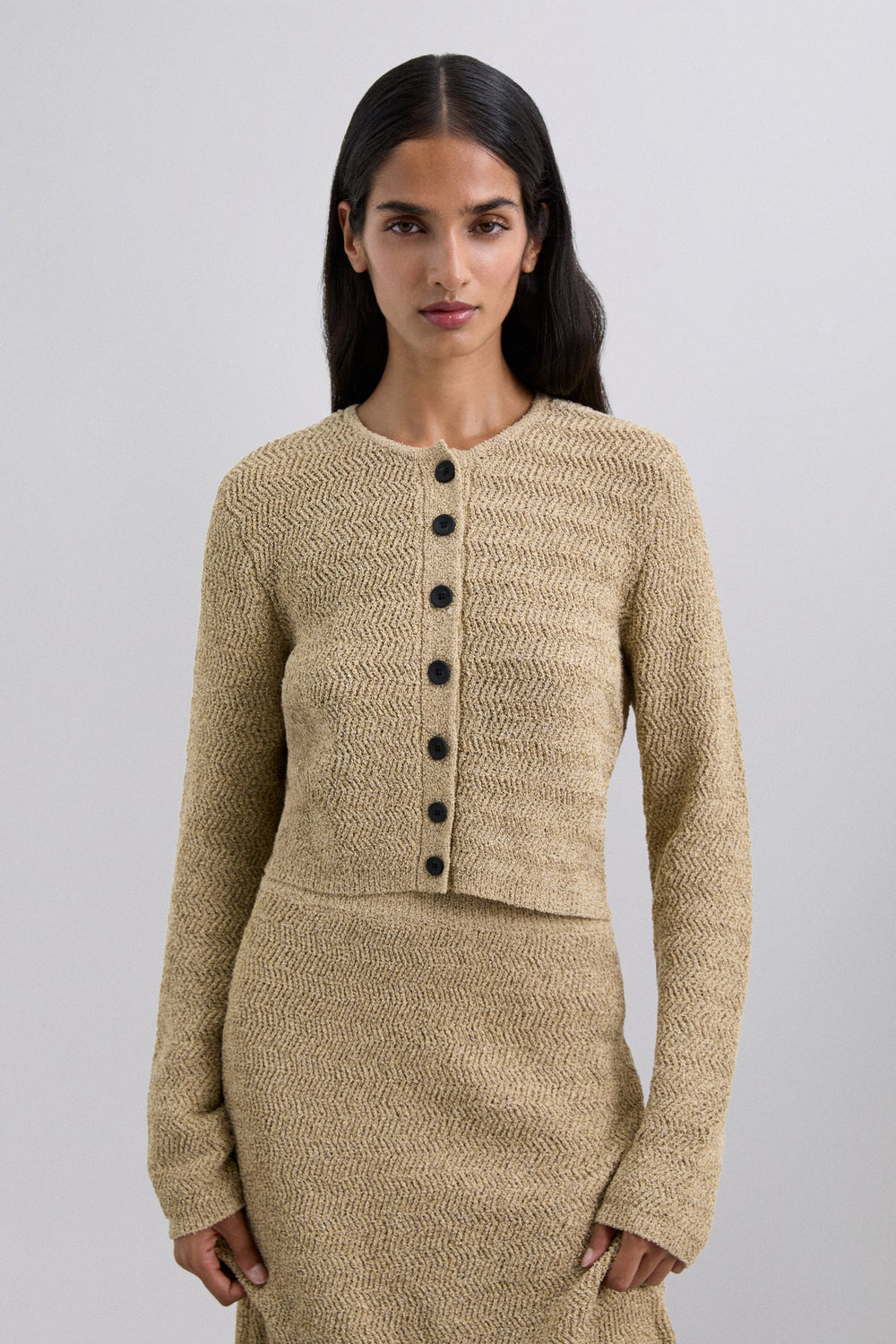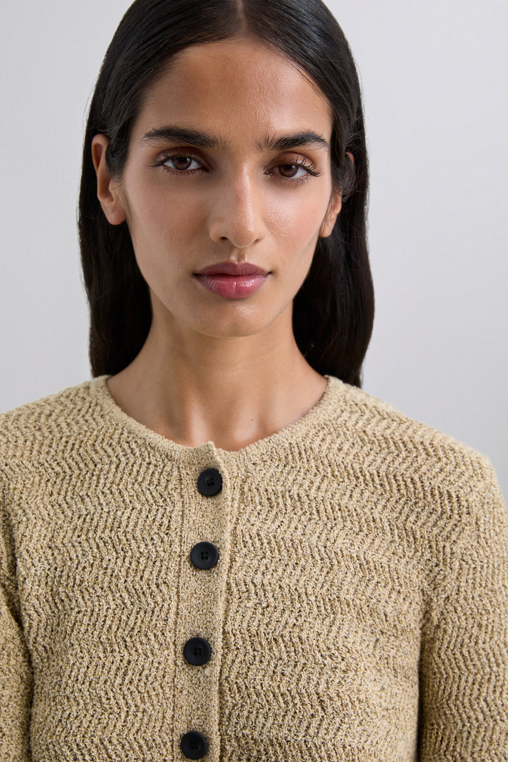 Cárdigan de punto. Cuello redondo. Manga larga. Cierre mediante abotonadura en frontal a contraste.