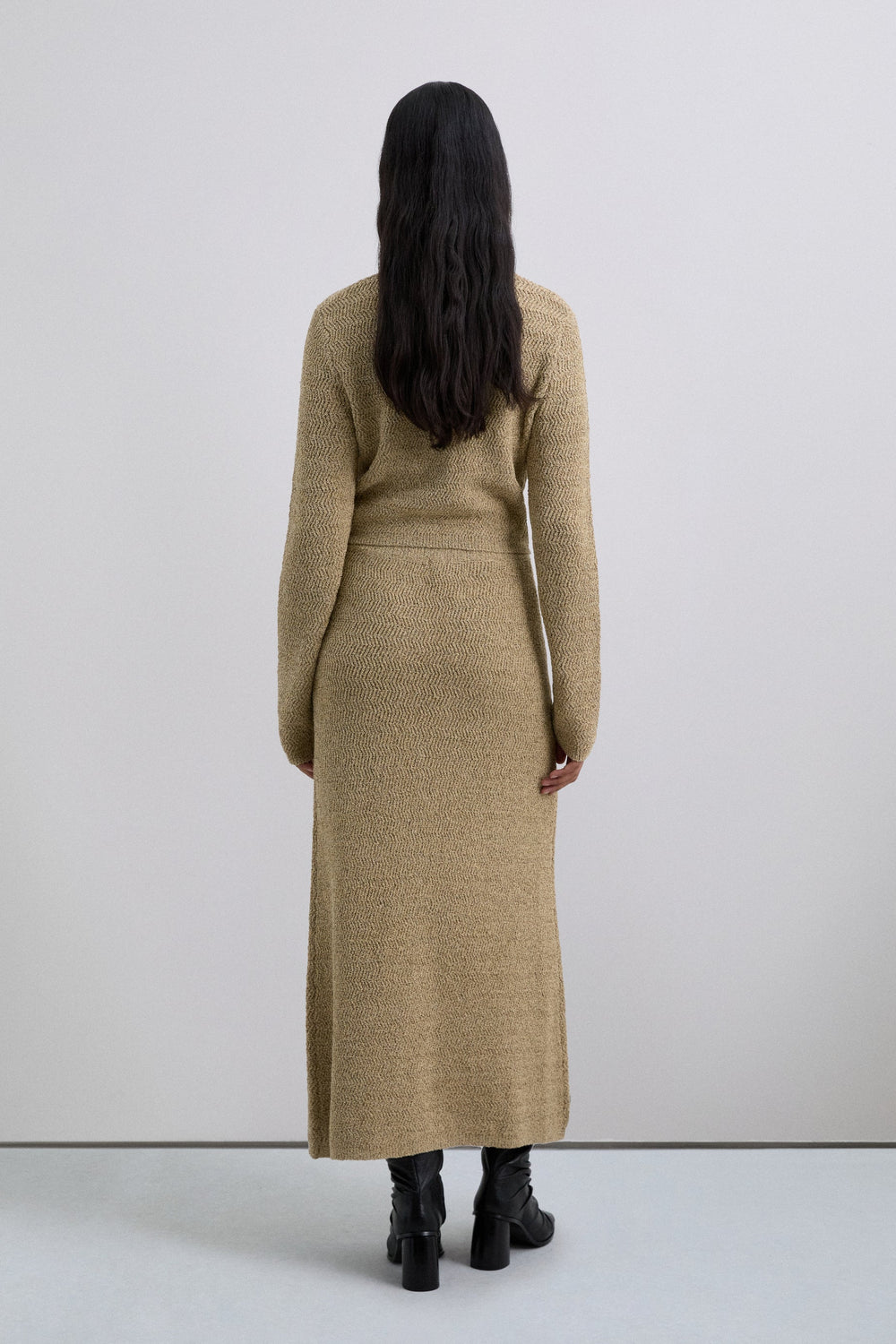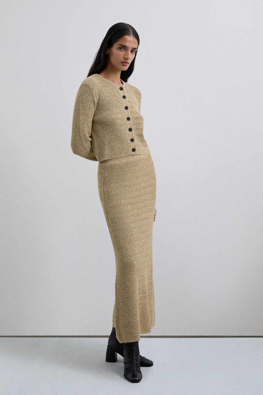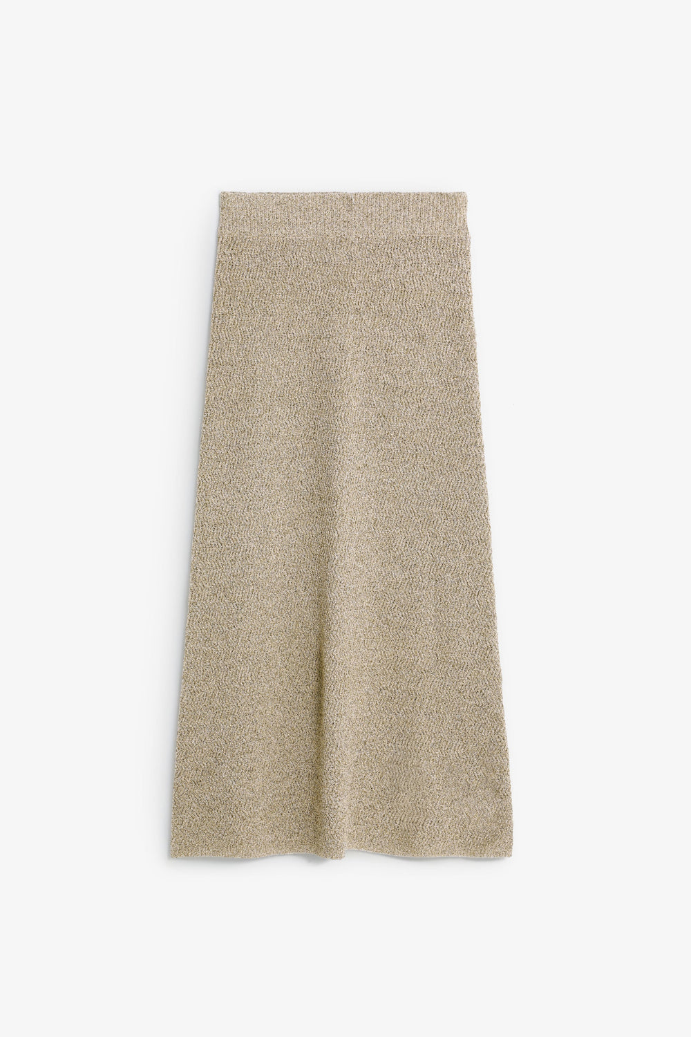 Falda larga confeccionada en tejido de punto. Corte evasé. Cintura con goma elástica.