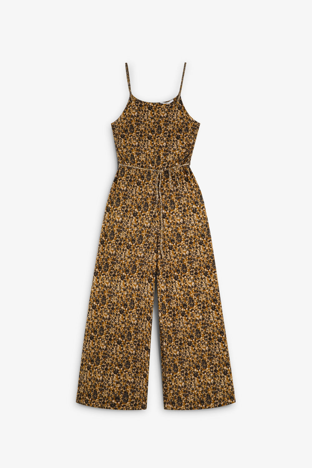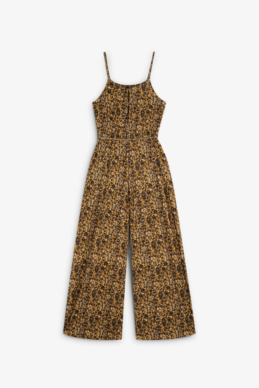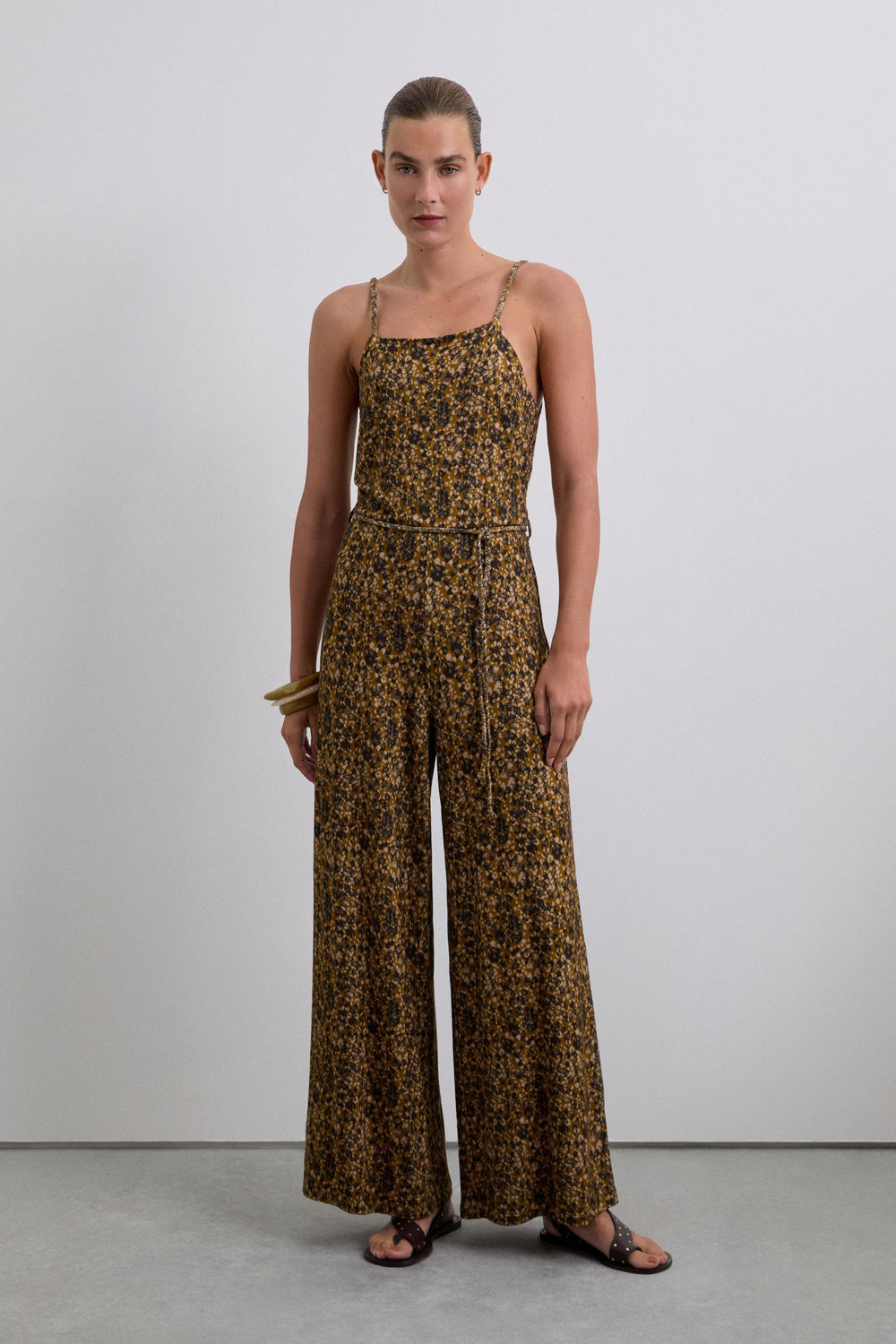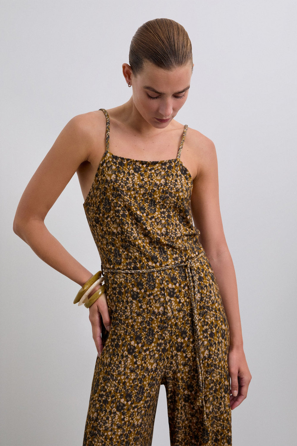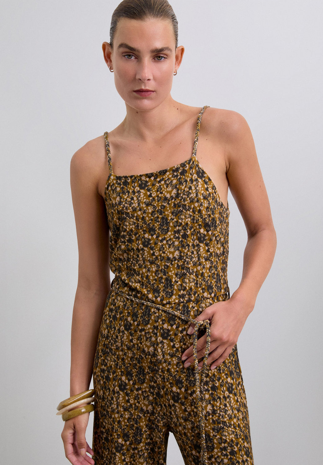 Mono confeccionado en mezcla de viscosa con elastano con estampado de animal print. Corte slim fit, tirante finos y cierre con botones traseros. Detalle de cuerda a modo cinturón en cintura.