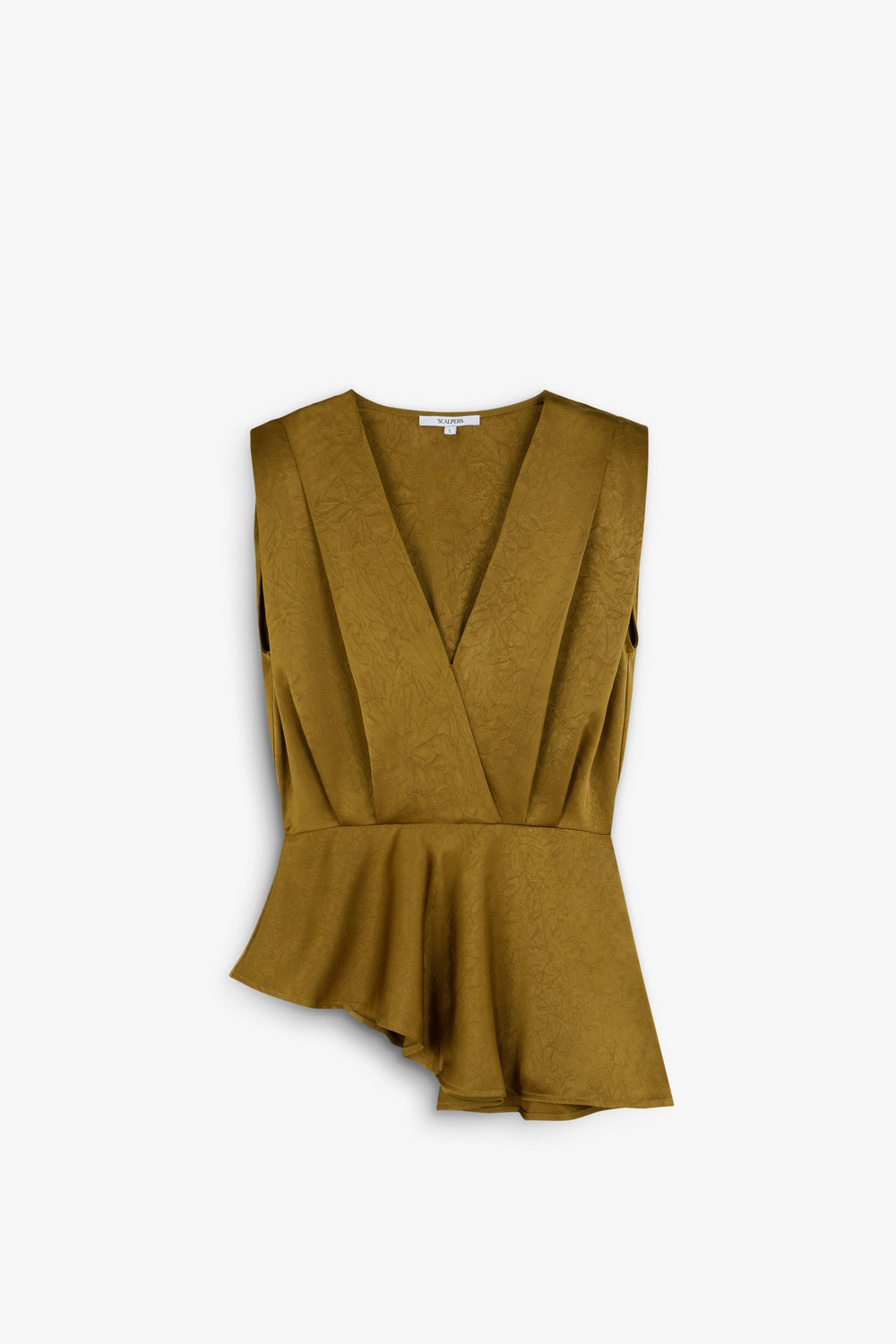 Top confeccionado en tejido fluido con textura. Corte regular fit, escote en V y manga en sisa con ligera hombrera. Plisados en pecho, cogido en cintura y con volante en el bajo.