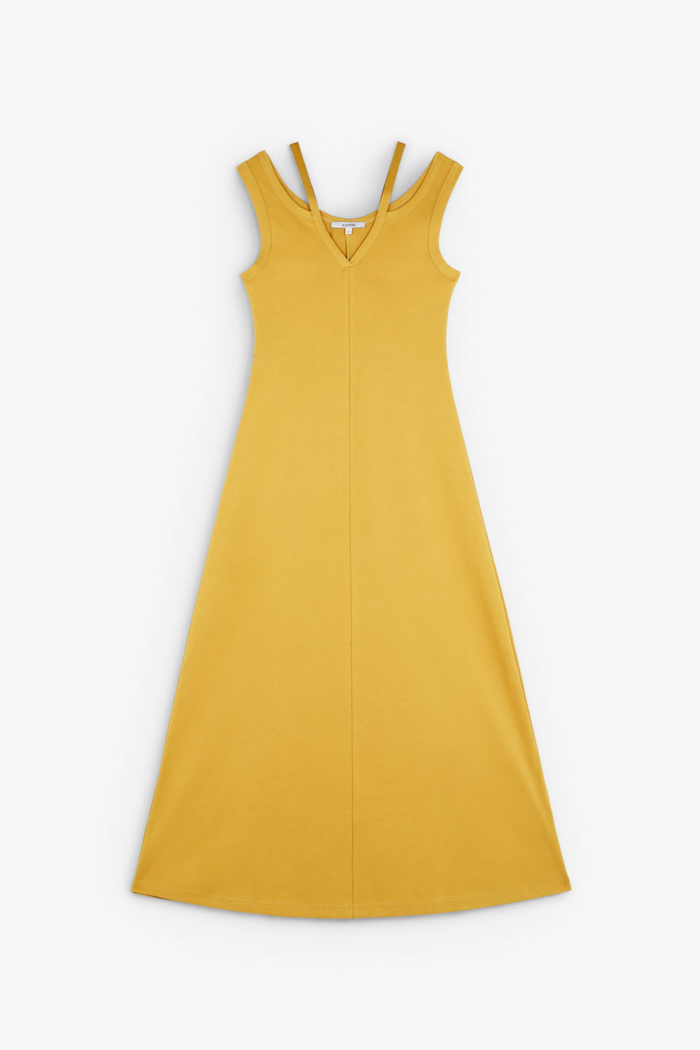 Vestido midi confeccionado en 100% Algodón Orgánico BCI. Manga en sisa. escote en V con detalles de cut outs y doble tirantes.
