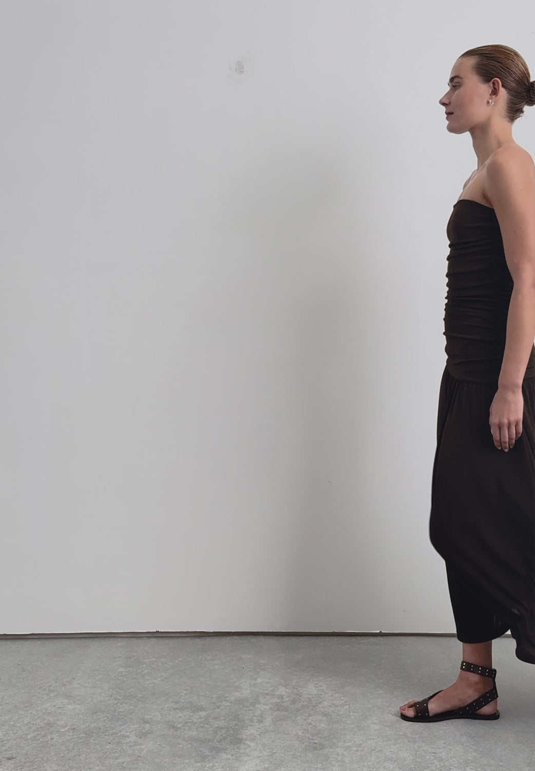Vestido confeccionado en punto fino ligeramente elástico. Corte slim fit, strapless, cuerpo con detalle de frunces. Corte midi.
