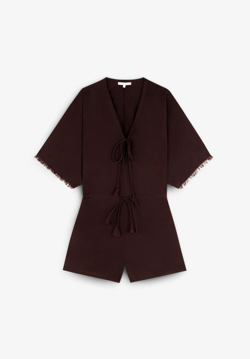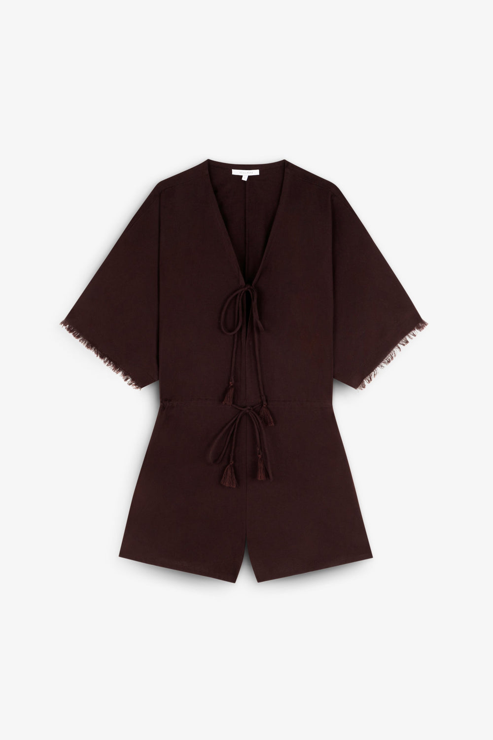 Mono confeccionado en mezcla de algodón y lino. Corte regular fit, escote en V, manga corta amplia y pantalón corto. Cintura elástica. Detalle de ajuste frontal en pecho y cintura con lazo.