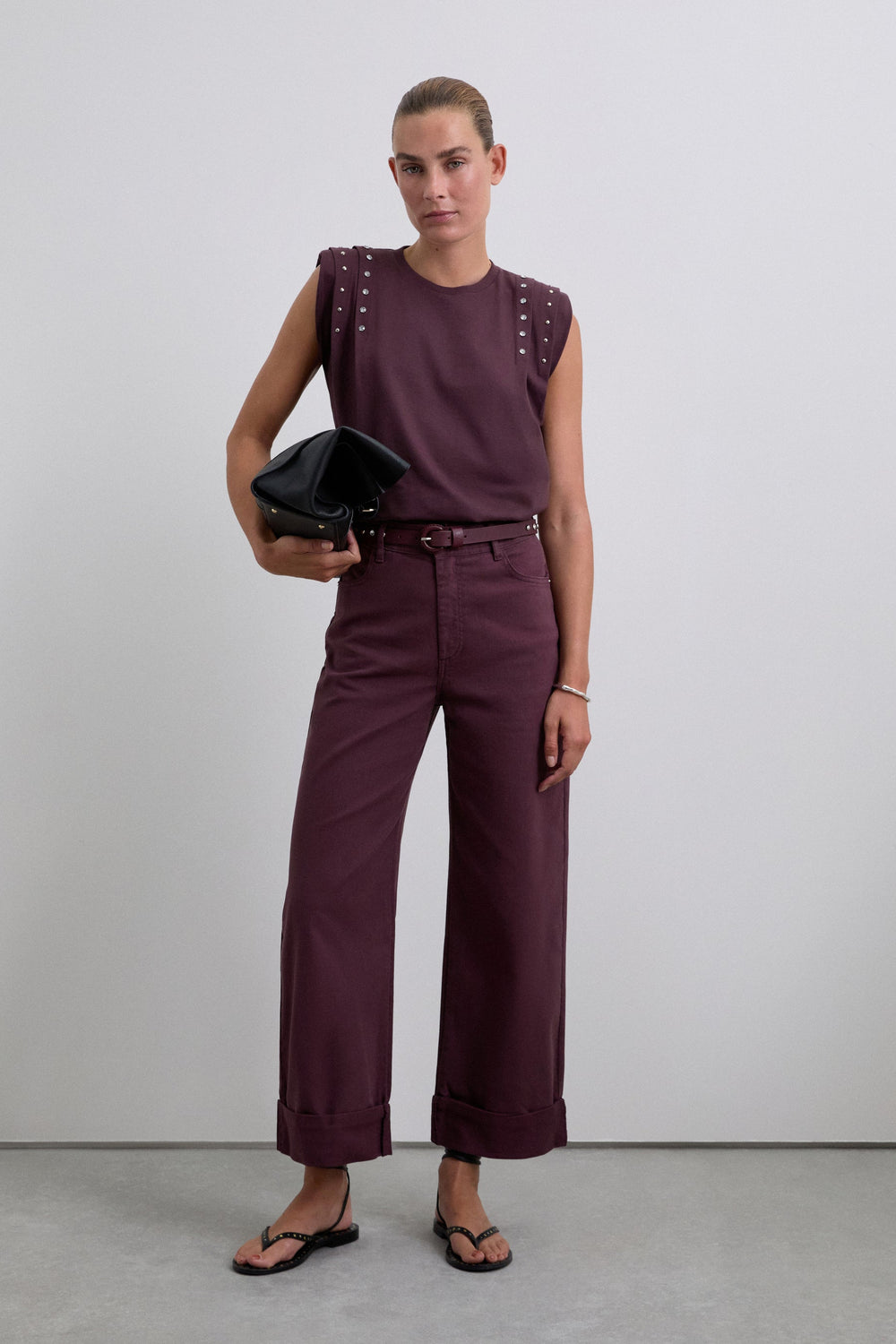 Pantalón denim culotte de tiro medio. Relaxed fit. Con pliegue en la parte inferior. Bolsillos delanteros y traseros. Cierre mediante botón y trabillas en cintura. Detalle logo en etiqueta parte trasera.