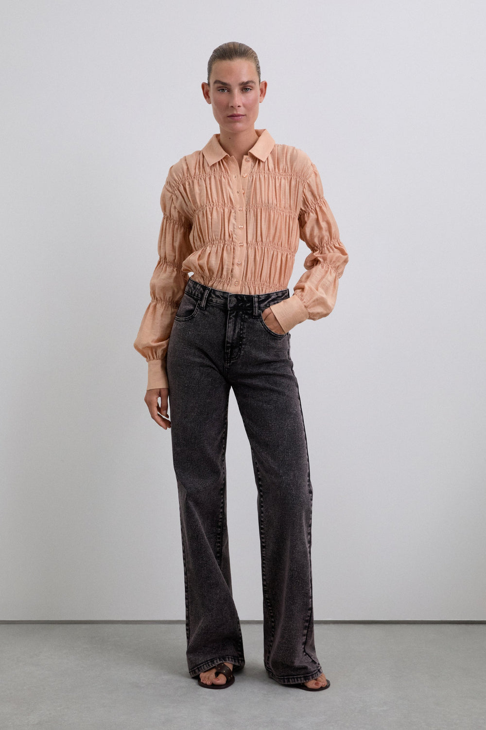 Pantalón denim cinco bolsillos, tiro medio. Efecto de lavado ácido color marrón. Cierre mediante botón. Trabillas en cintura. Detalle logo en etiqueta parte trasera.