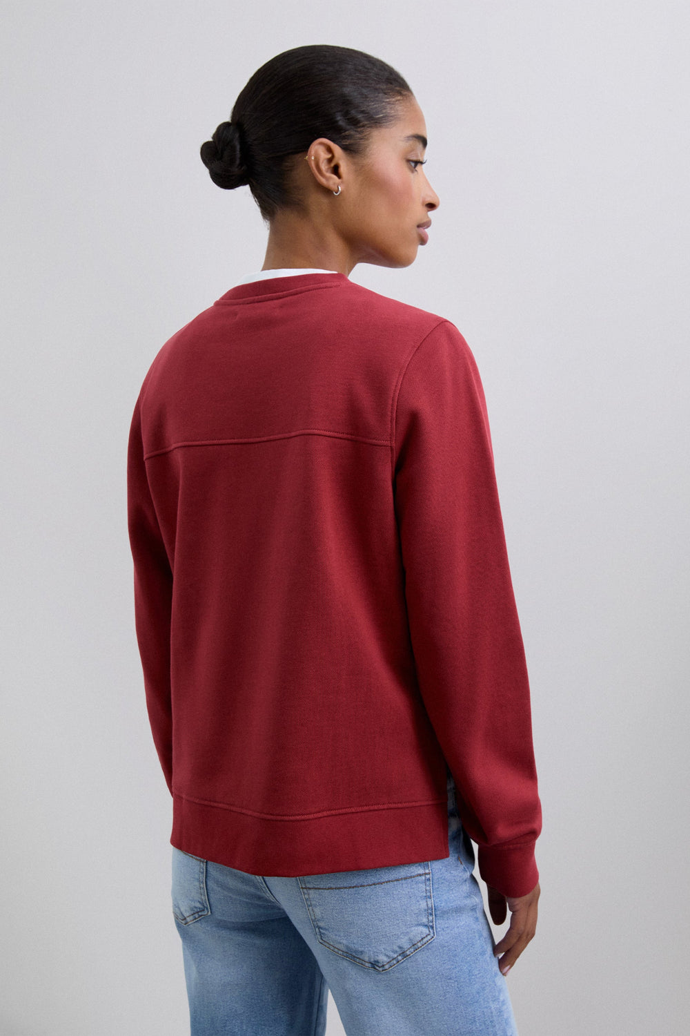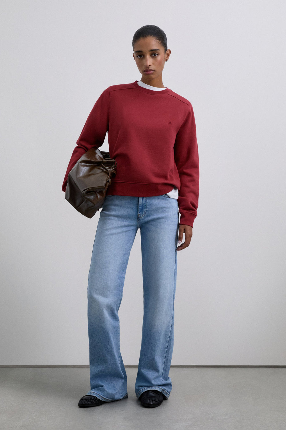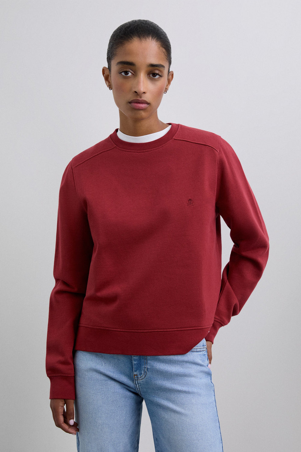 Sudadera confeccionada en algodón orgánico 100%. Corte regular fit, cuello redondo y manga larga con puños acabados en rib. Bajo asimétrico, parte trasera alargada. Detalle de calavera bordada en pecho.
